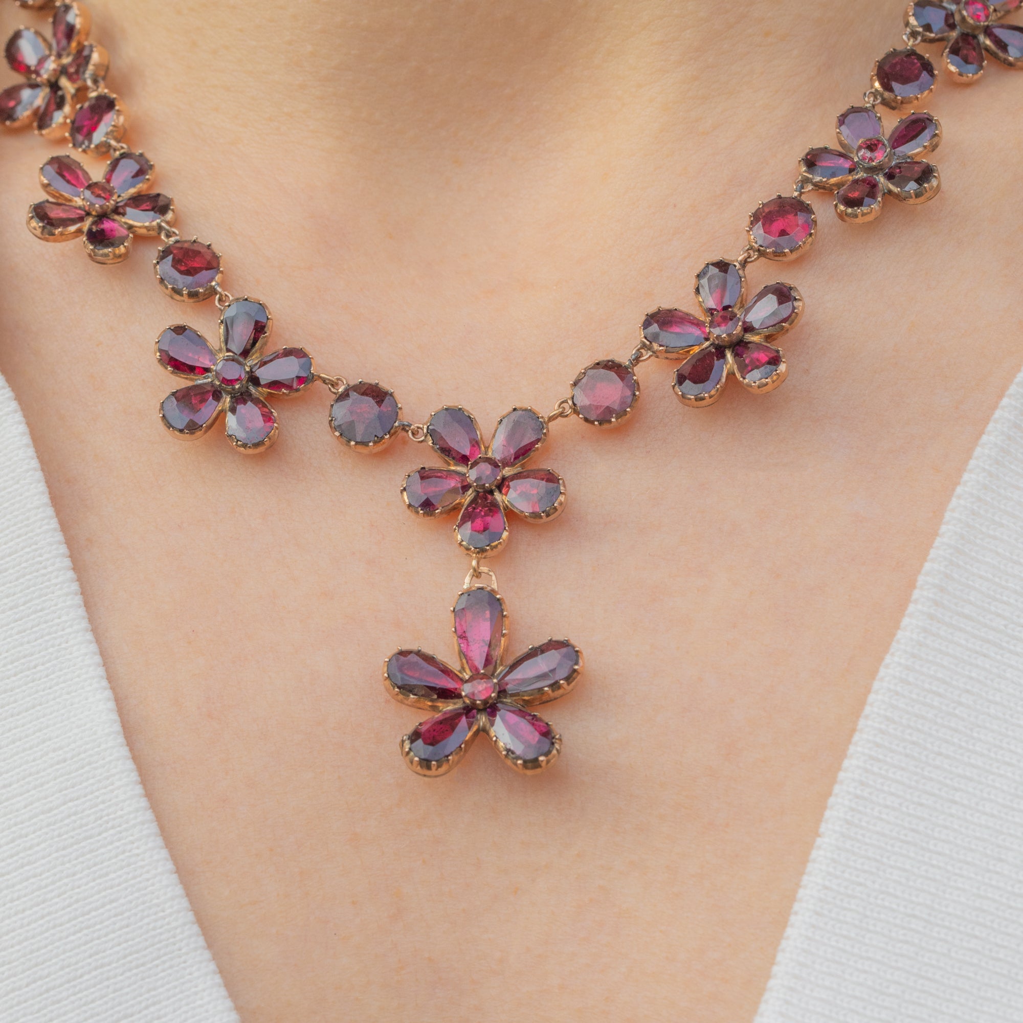 A fine piece of Georgian jewellery steeped in antique charm, this 9ct Gold Garnet floral necklace will make a wonderful addition to your jewellery box!
