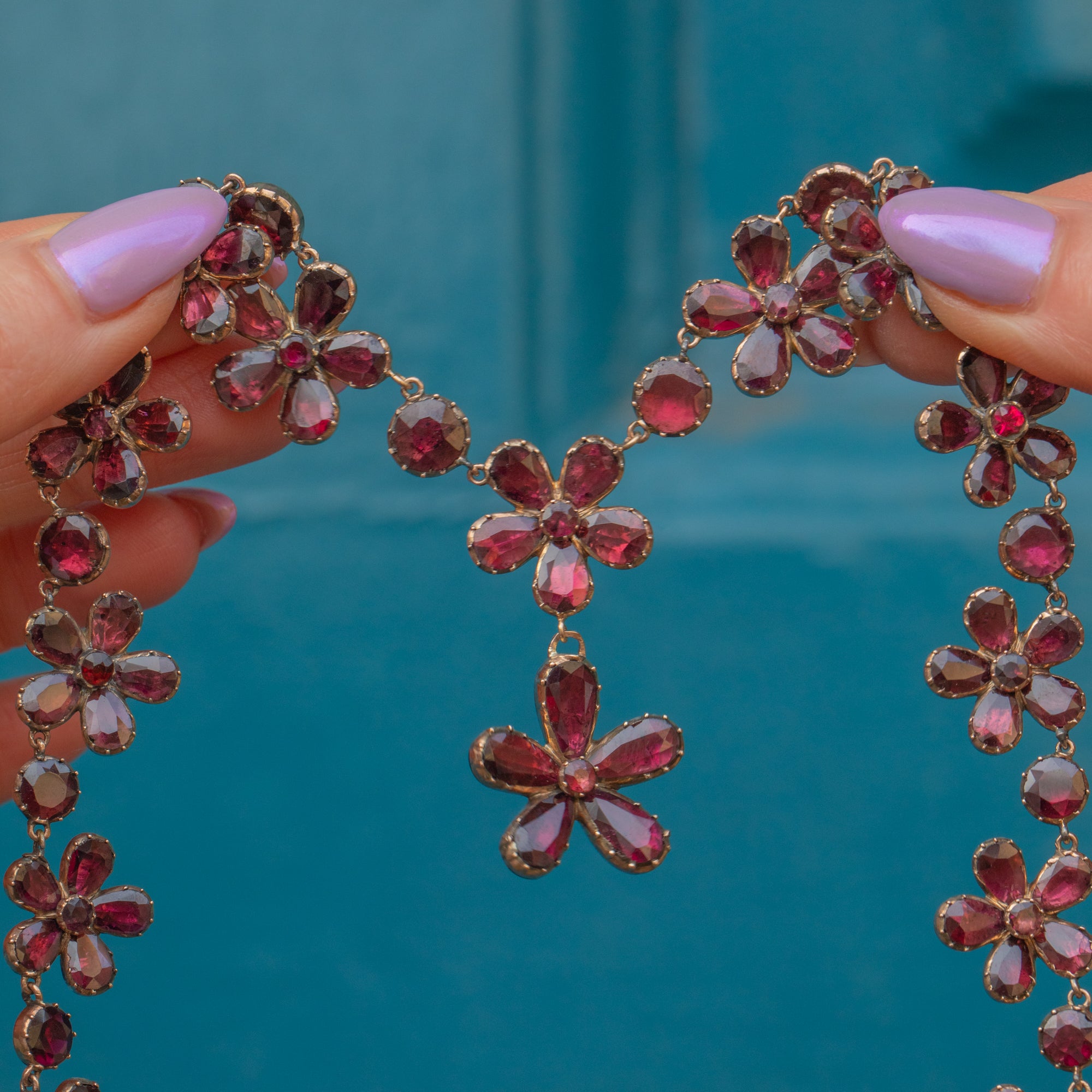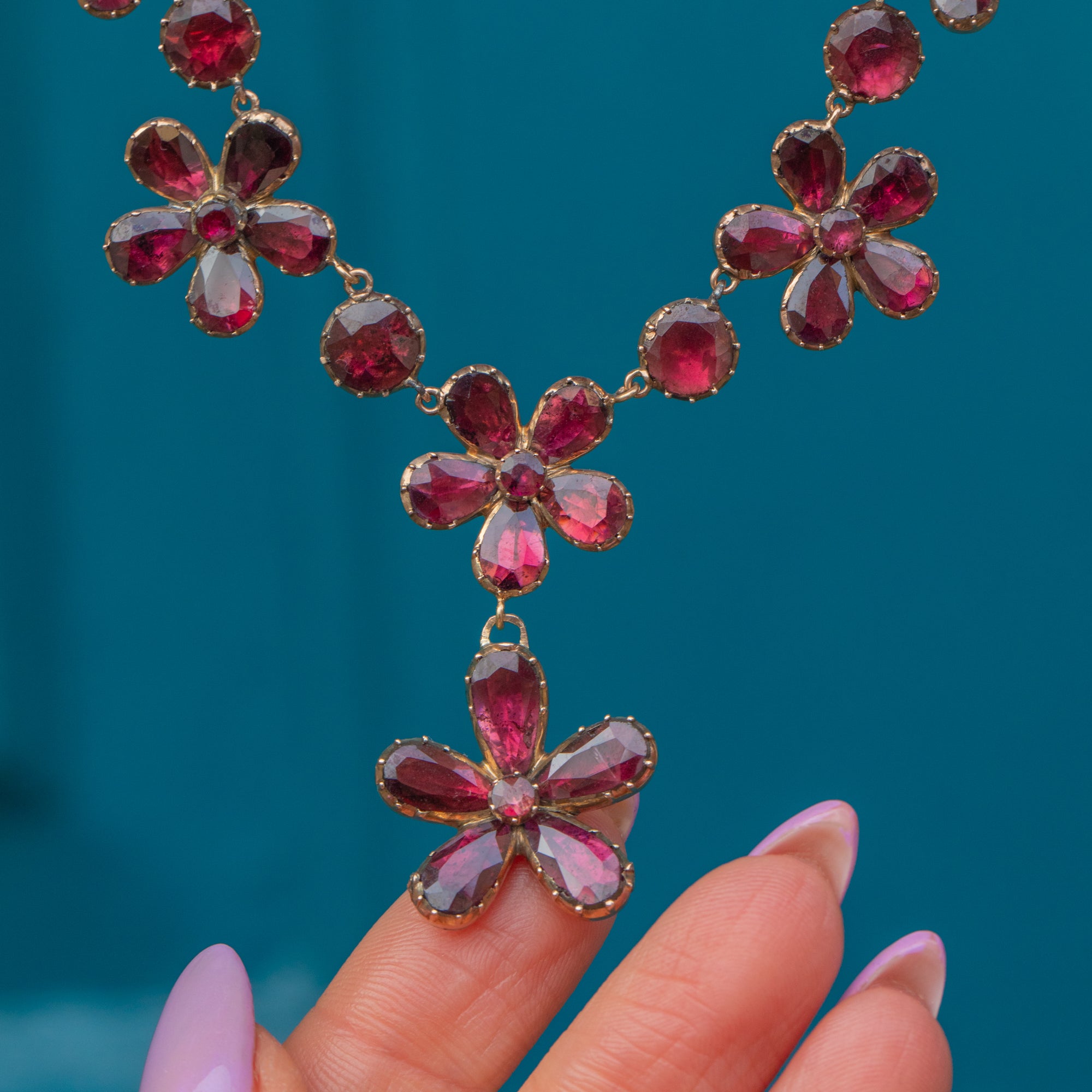 This Georgian 9ct Gold flat-cut Garnet pansy necklace is an exquisite piece! A stellar example of Georgian craftsmanship and is sure to be a stand-out piece in any collection.