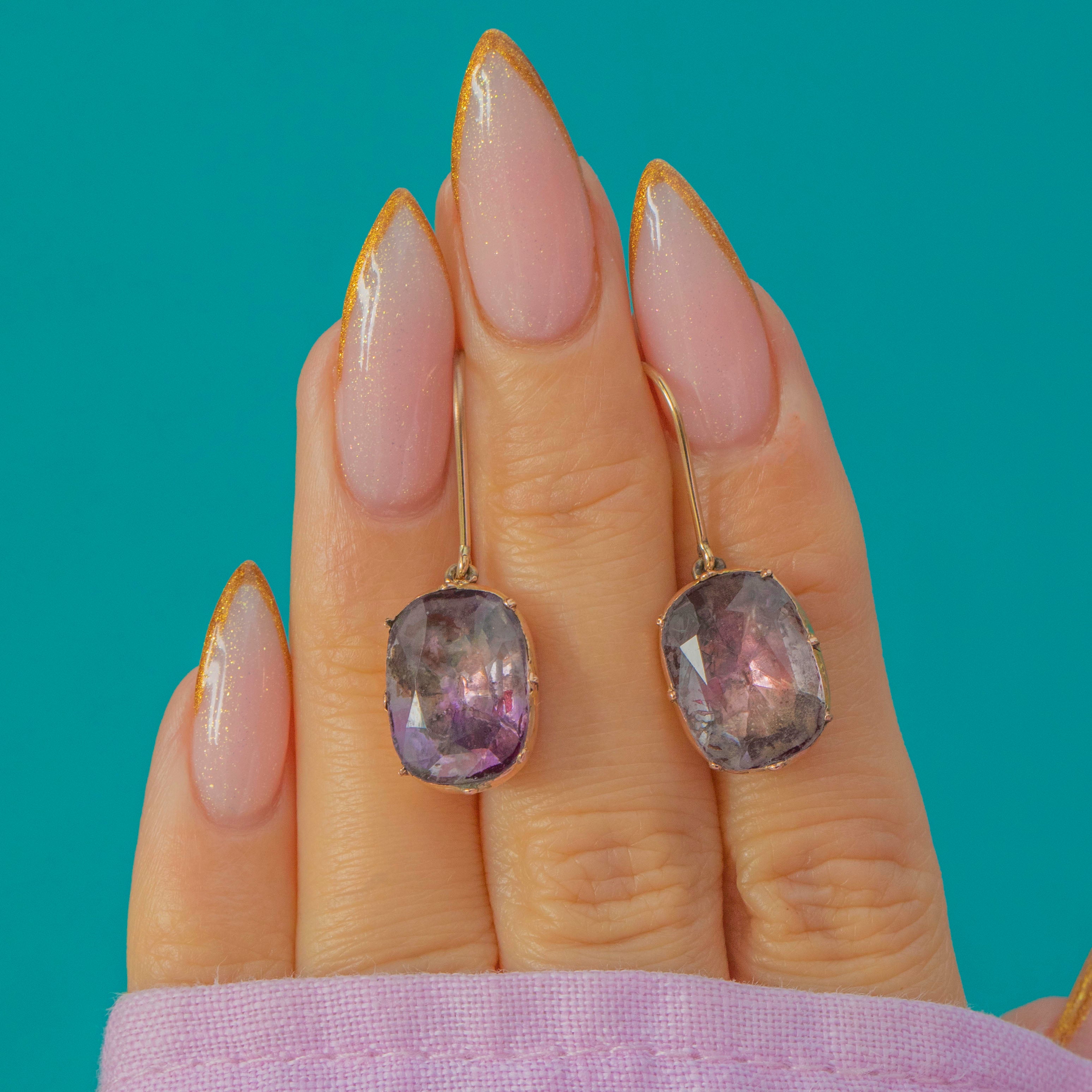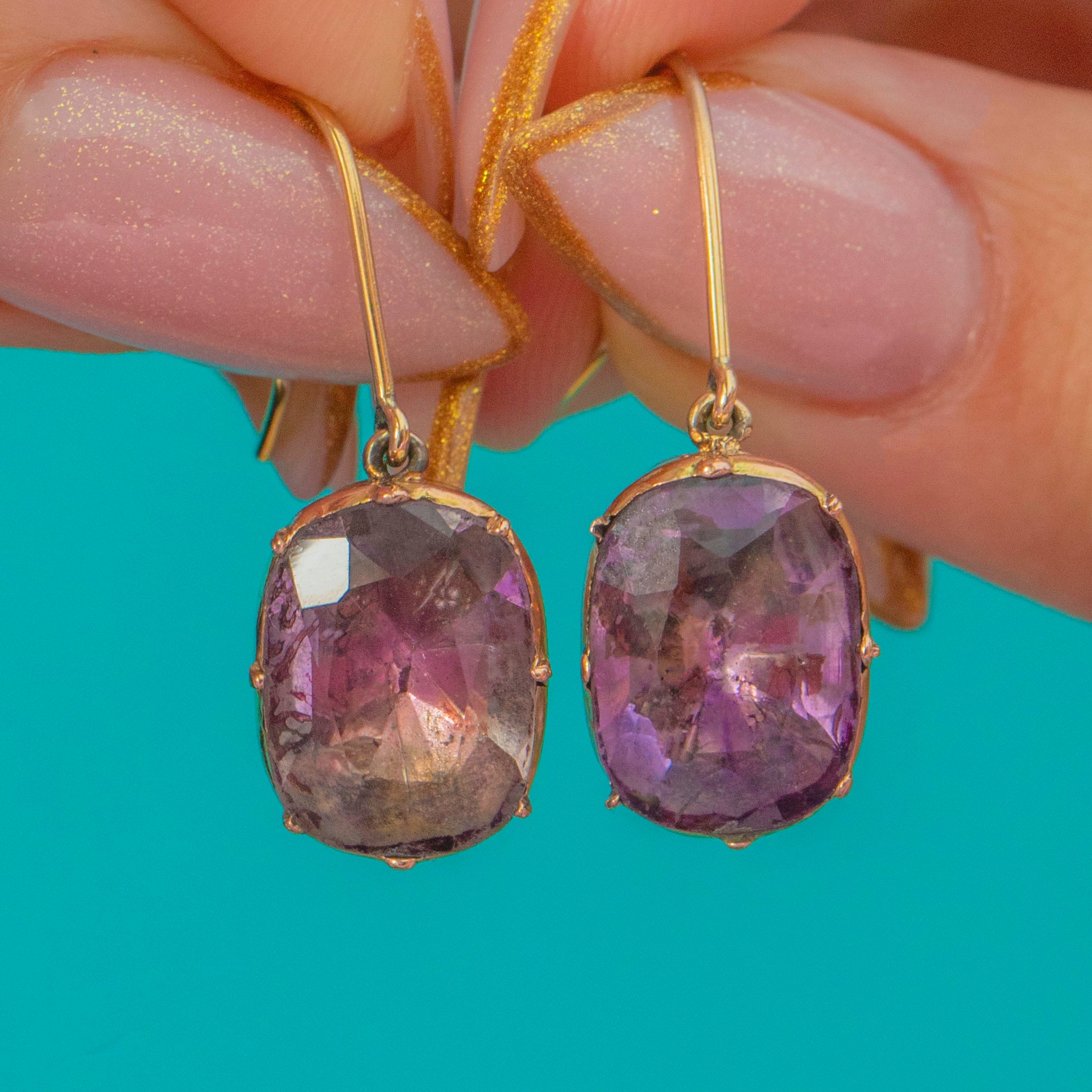 Steeped in history, these earrings are an honest and sympathetic antique conversion. The Amethyst drops originally began life as Georgian clasps, and have been professionally adapted into wearable earrings while preserving all their original charm, foiling, and period character.