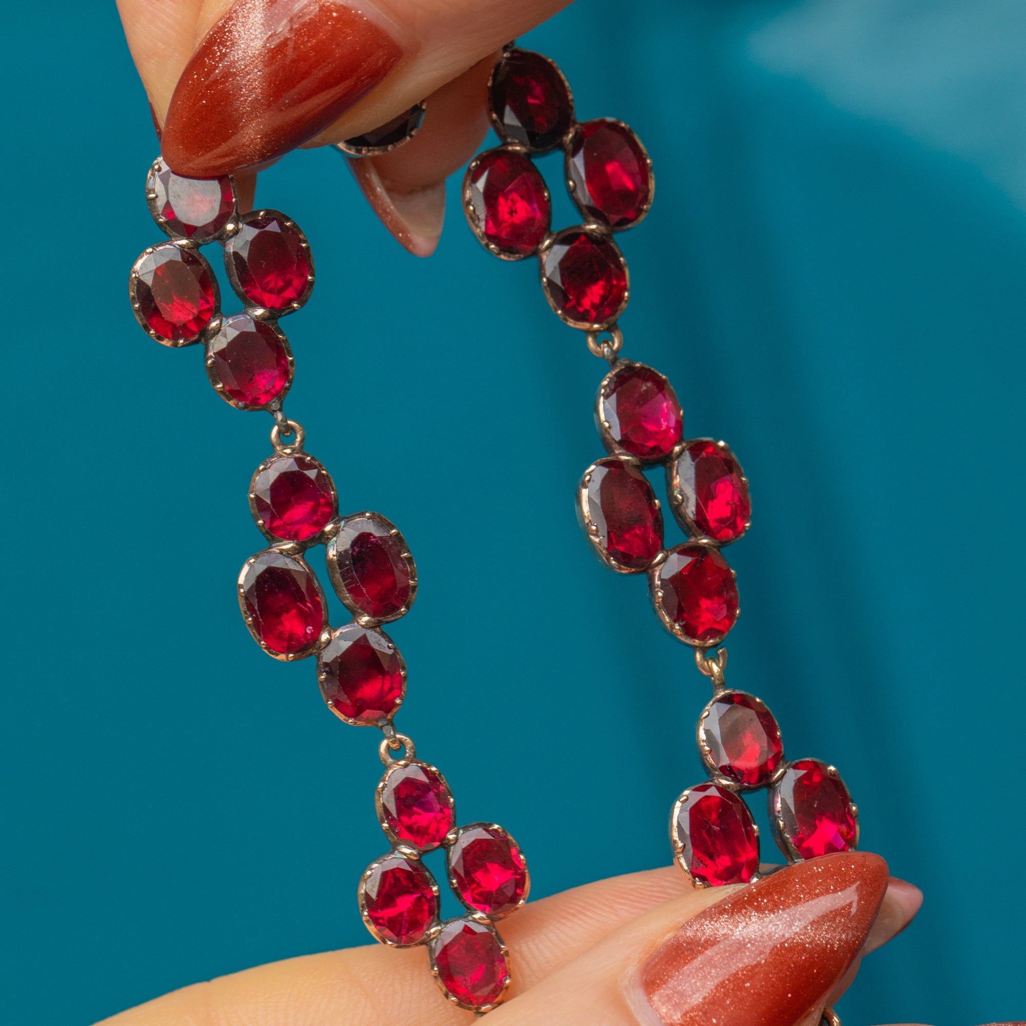 Garnets graduate from 6.5mm long x 4.5mm wide to 7.5mm long x 6mm wide, weighing approx. 9.65ct combined.