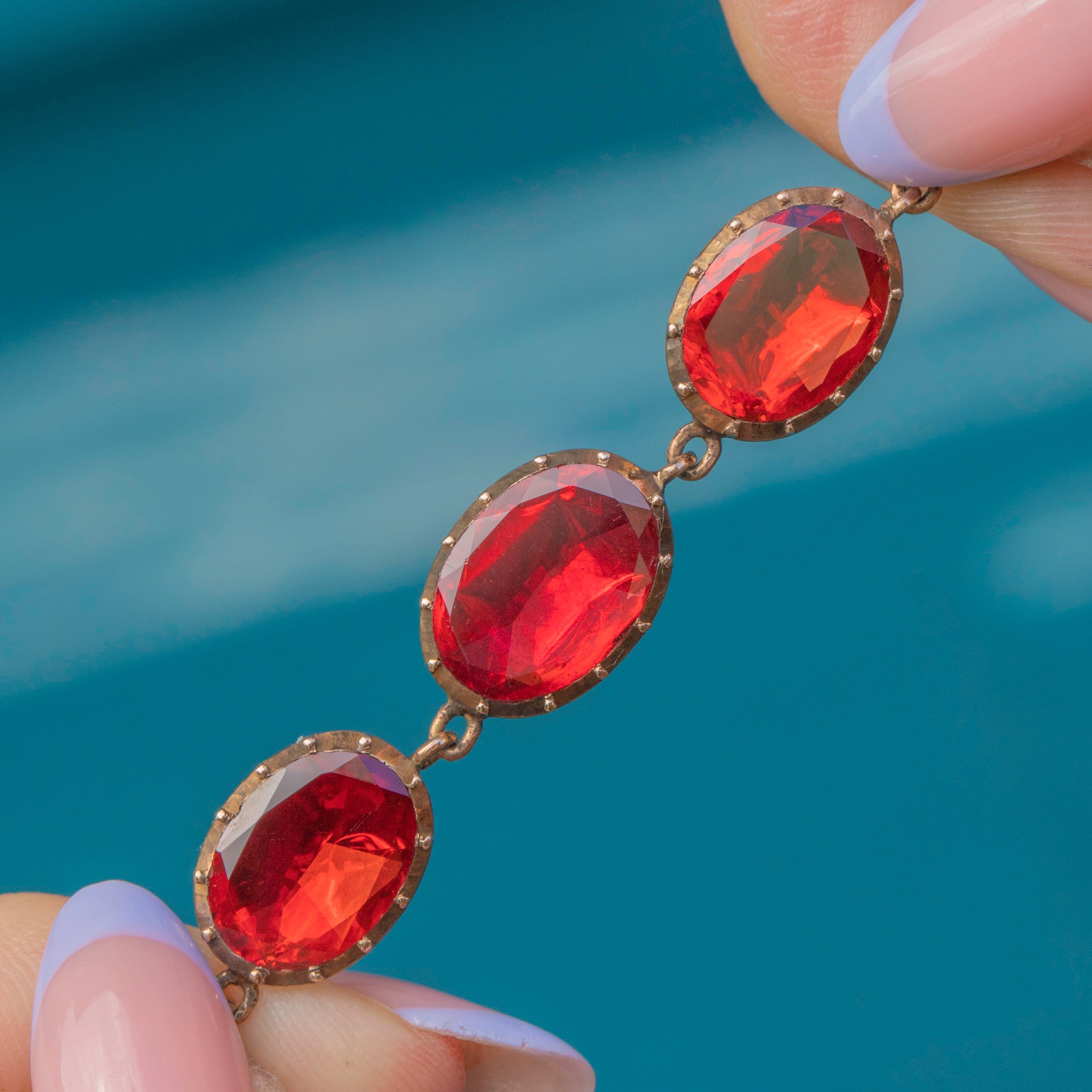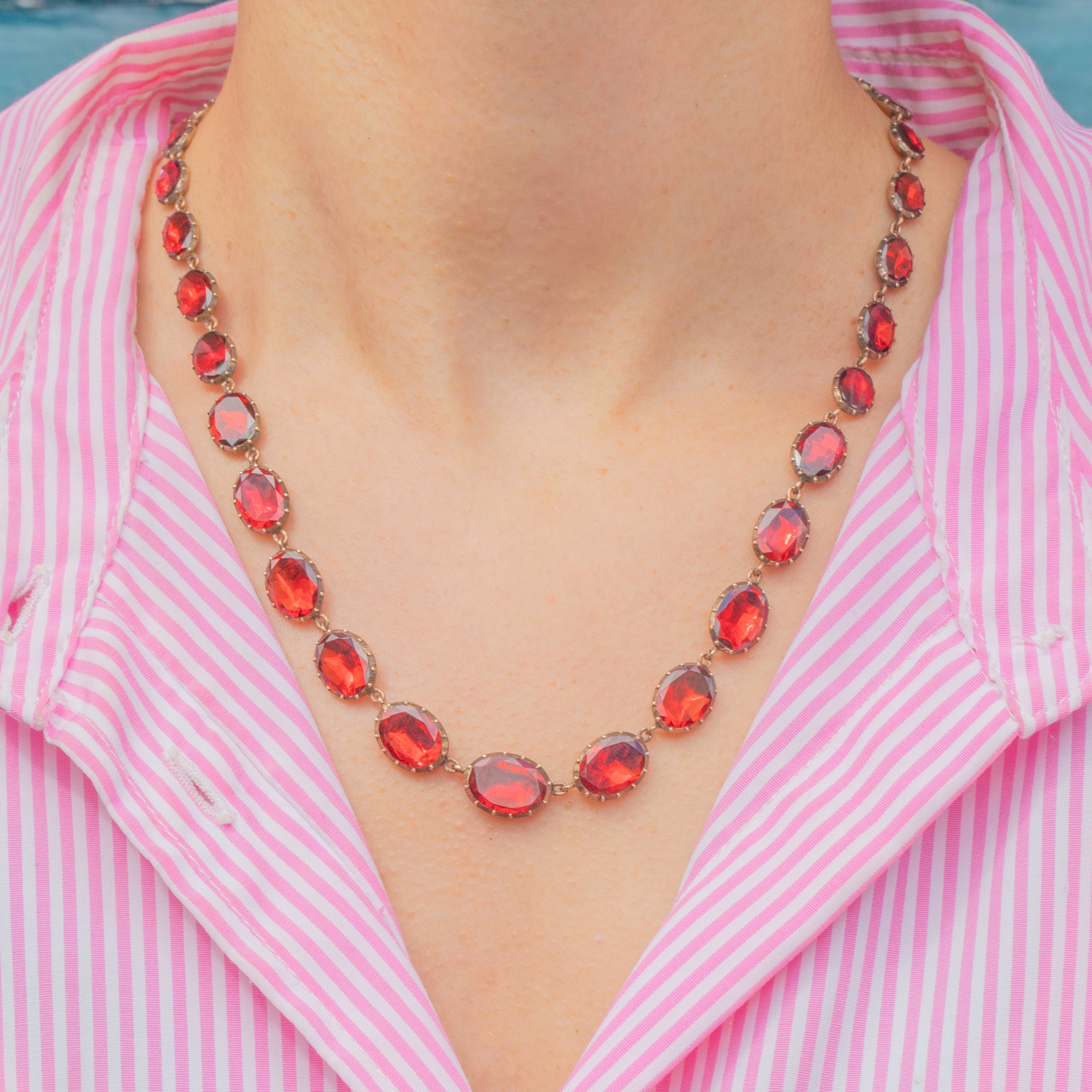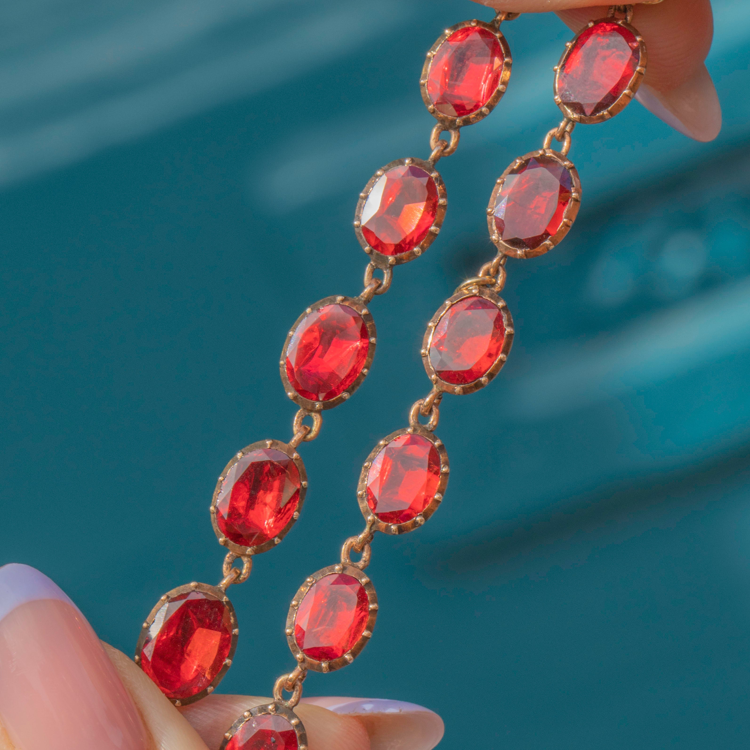 Radiating regency era glamour, this Georgian 9ct Gold flat-cut Garnet riviere necklace is a fabulous piece! Boasting 34 juicy foiled-flat cut Garnets, akin to glistening pools of sangria, this riviere necklace cascades across your décolletage with an undeniable elegance.