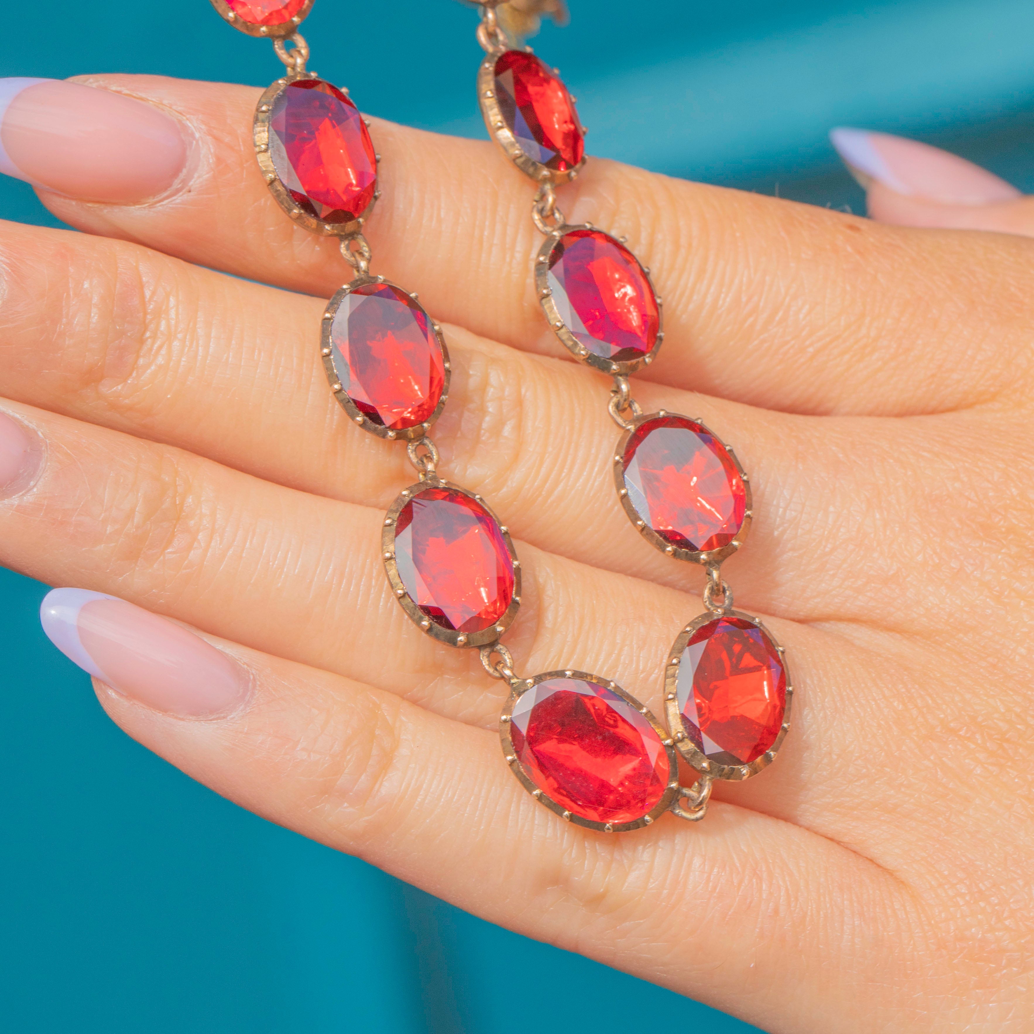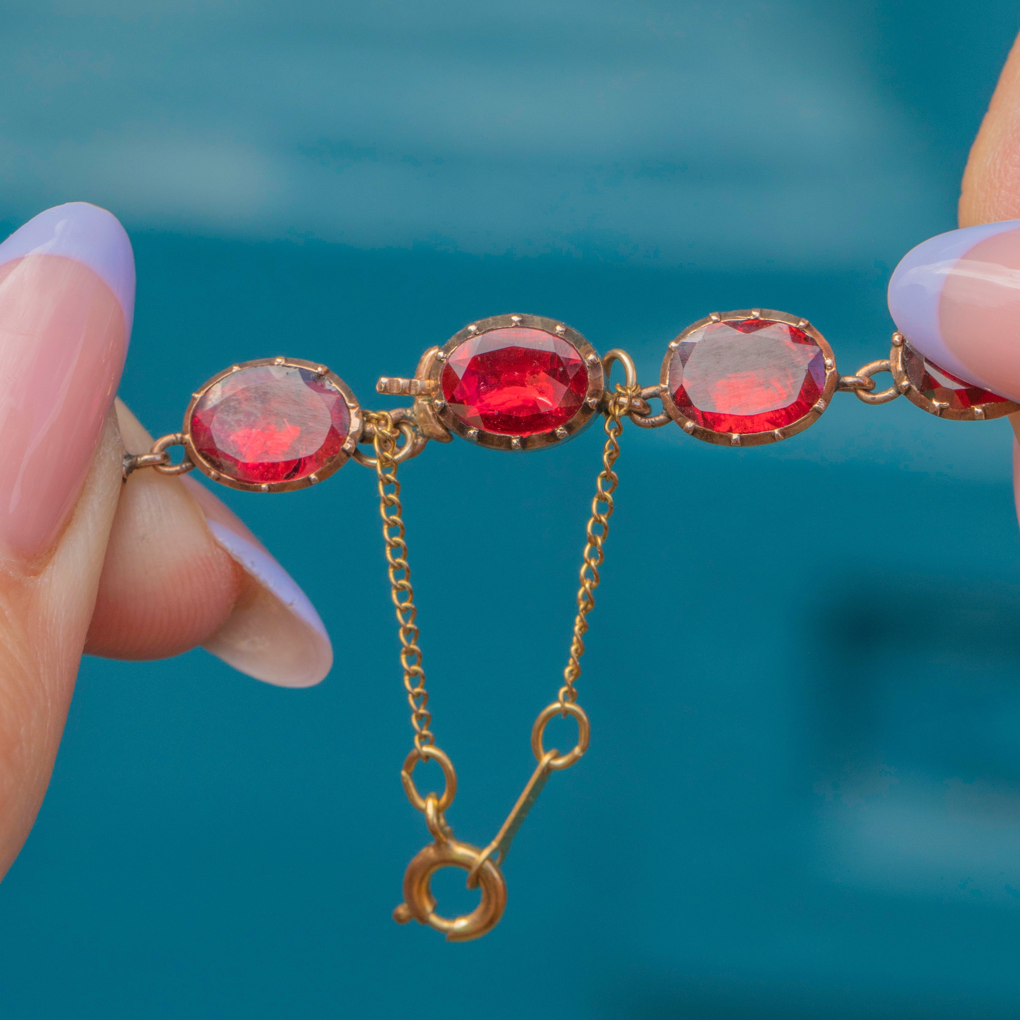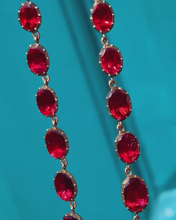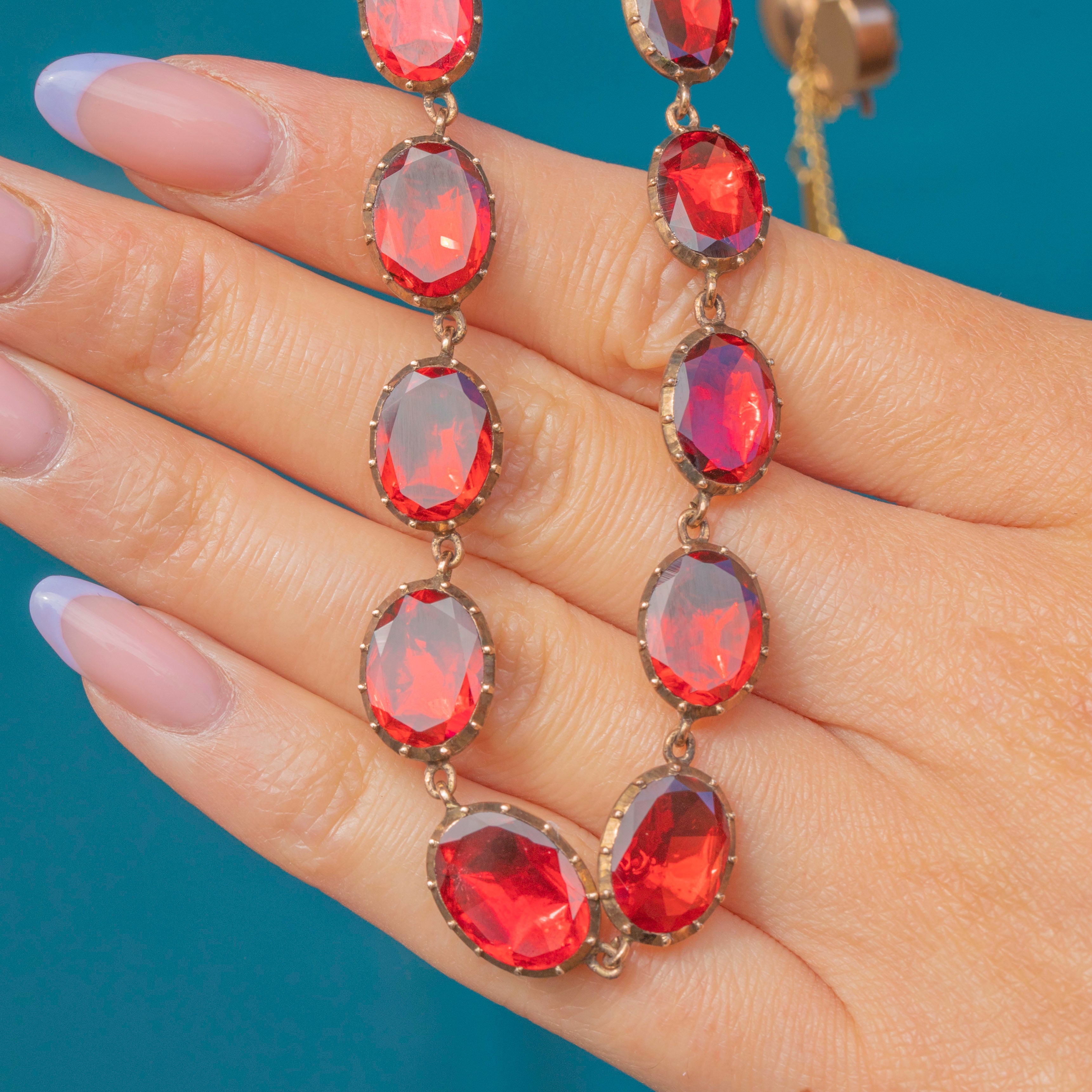 Radiating regency era glamour, this Georgian 9ct Gold flat-cut Garnet riviere necklace is a fabulous piece! Boasting 34 juicy foiled-flat cut Garnets, akin to glistening pools of sangria, this riviere necklace cascades across your décolletage with an undeniable elegance.