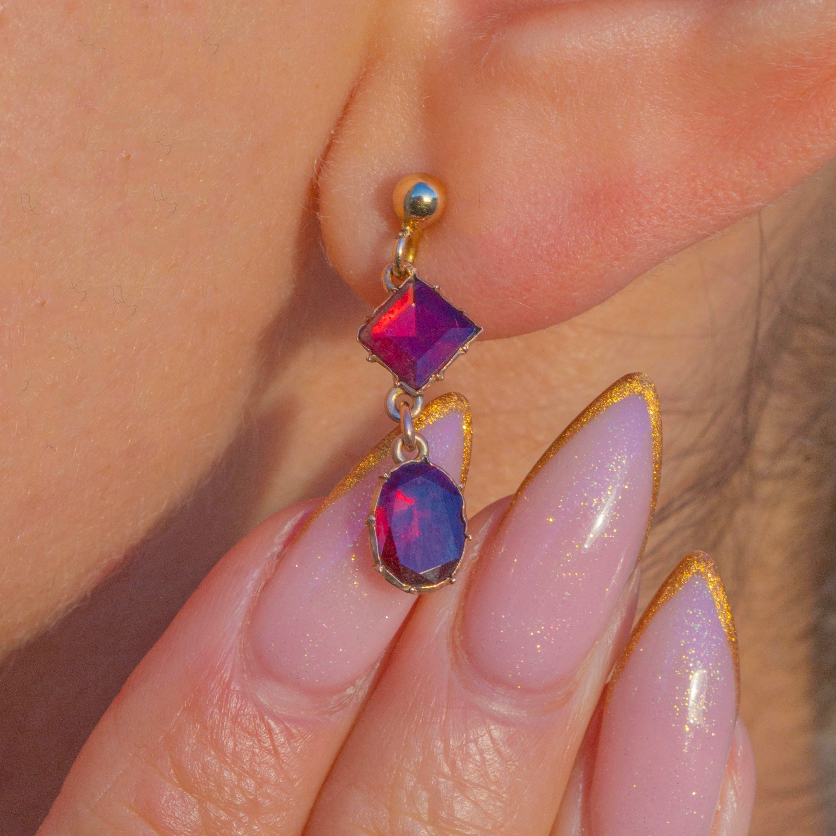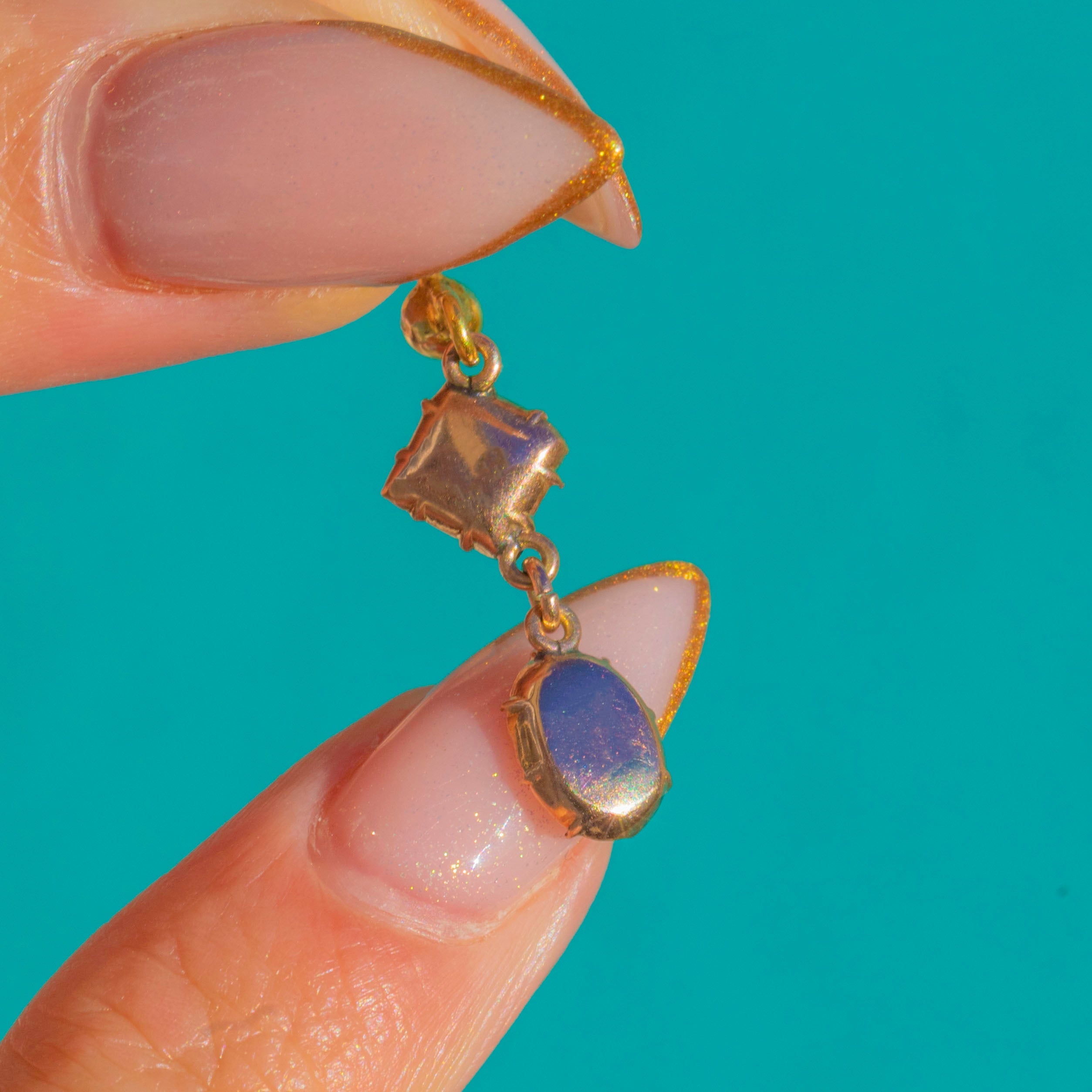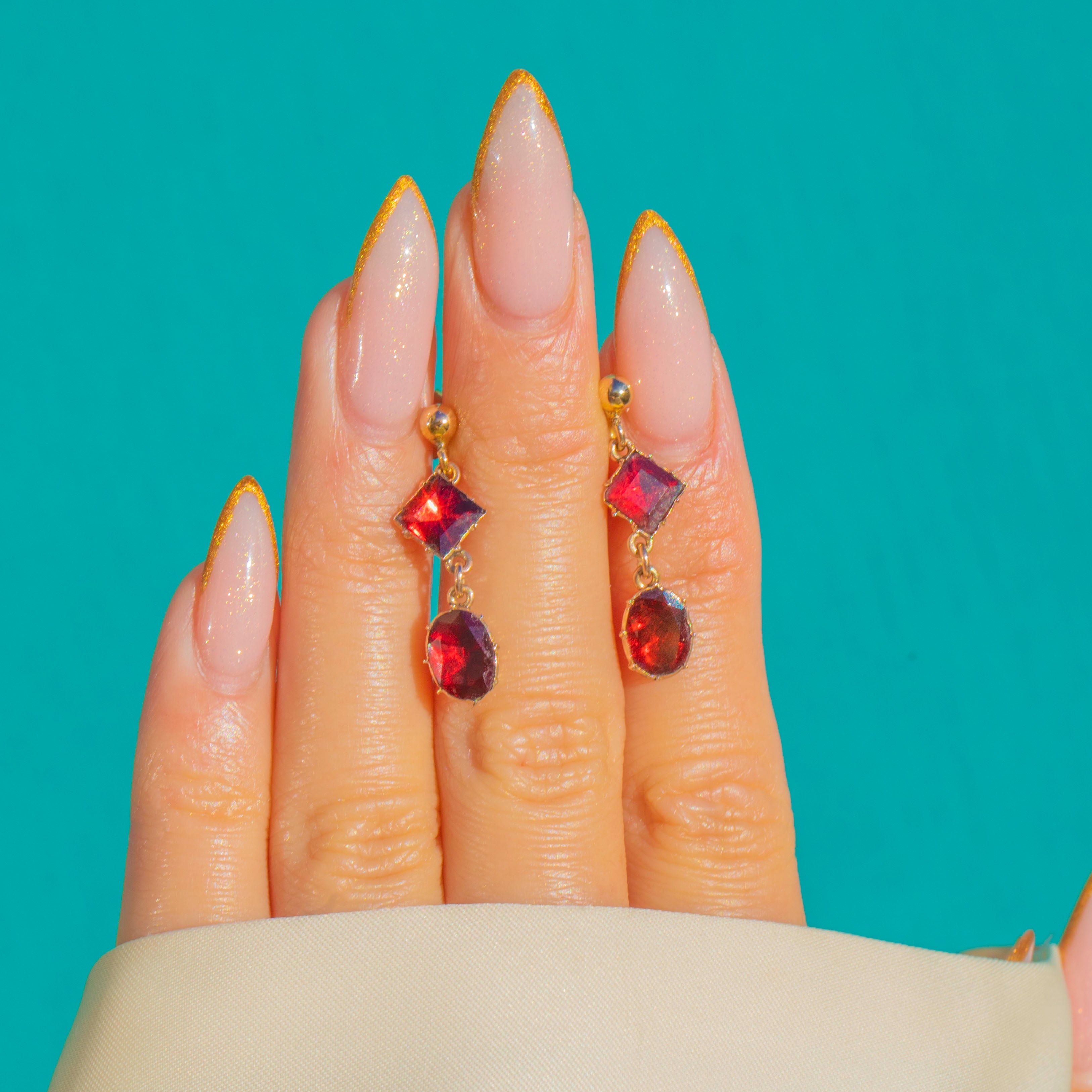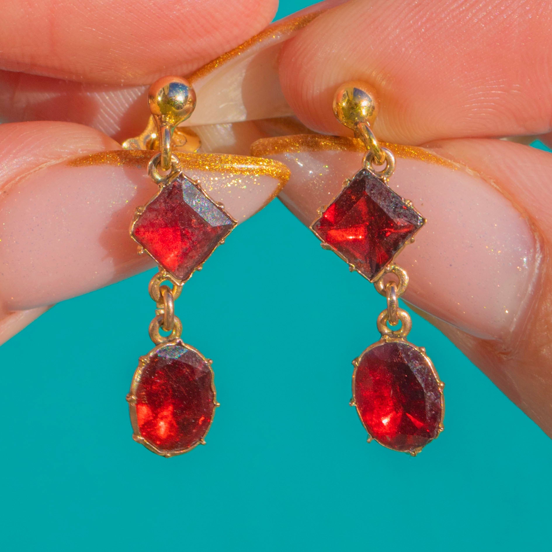 Diese leuchtenden Granat-Tropfen begannen ihr Dasein als Georgian-Ohrringe und wurden liebevoll auf 9ct Gold-Steckern neu gefasst, um einen unkomplizierten, eleganten Alltagslook zu ermöglichen. Die flach geschliffenen Granate sind hinterlegt, um ihre Strahlkraft zu intensivieren – sie leuchten in einem satten, feurigen Rot, das das Licht bei jeder Bewegung wunderschön einfängt.