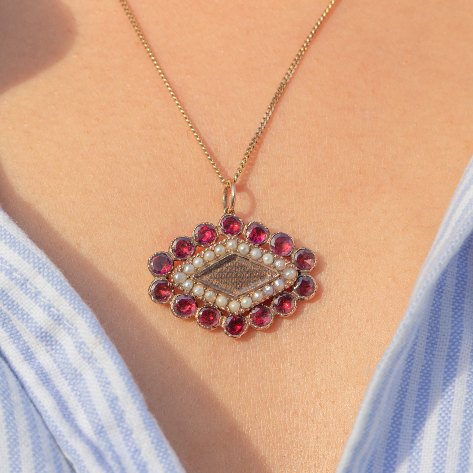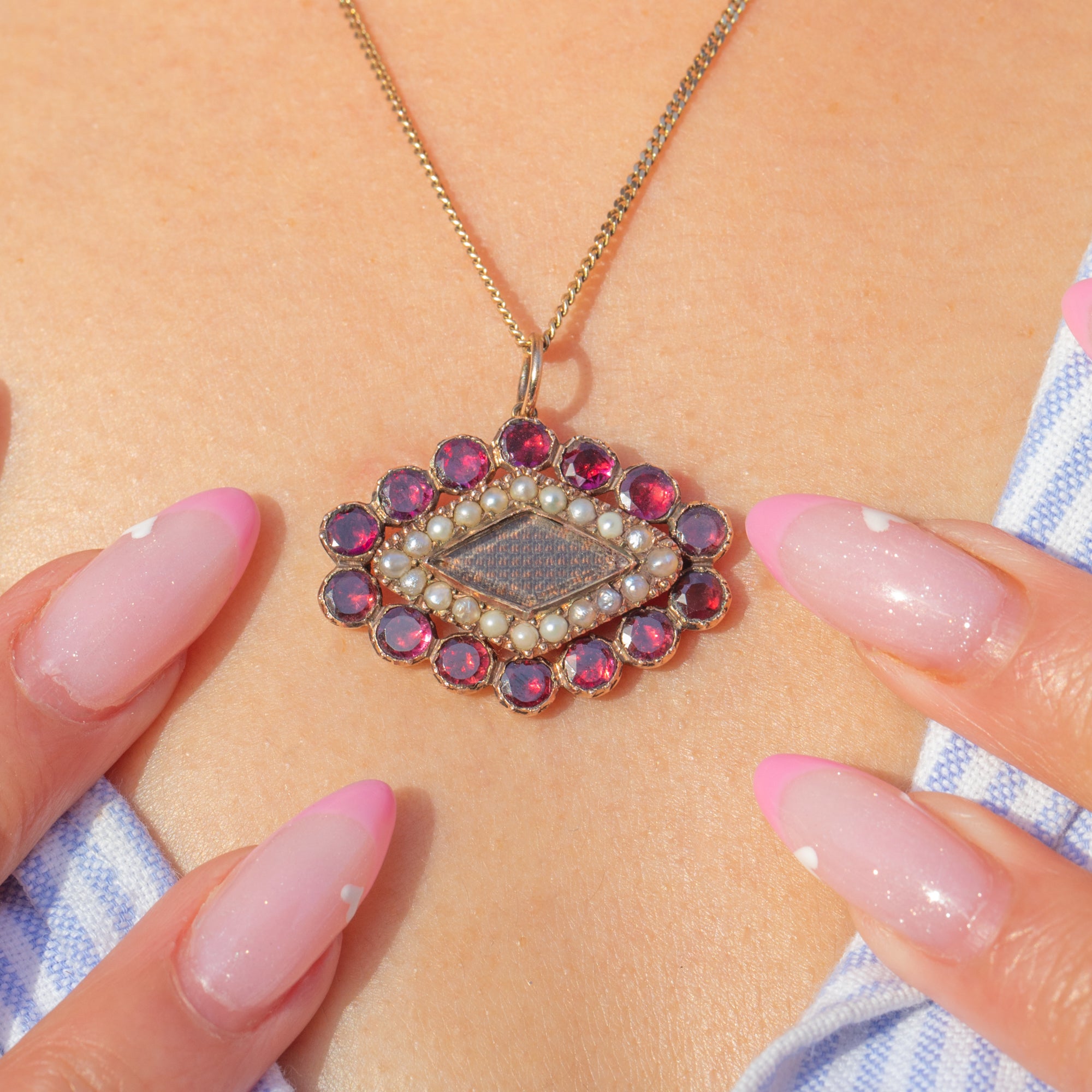 This exquisite Georgian lozenge-shaped charm, c.1800, is crafted in 9ct Gold and set with rich flat-cut Garnets framed by delicate Seed Pearls. Beneath the glass panel lies a beautifully preserved woven hair memento, a touching reminder of the Georgian era’s sentimental jewellery traditions.