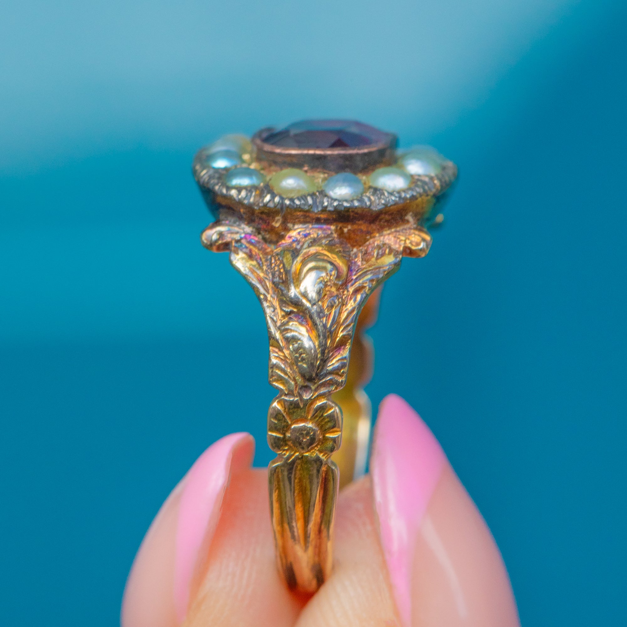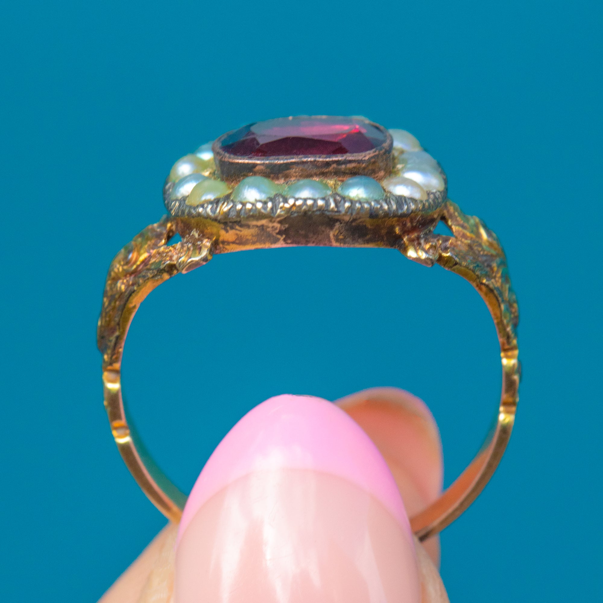 Georgian 9ct Gold Garnet Pearl Ring, c.1800