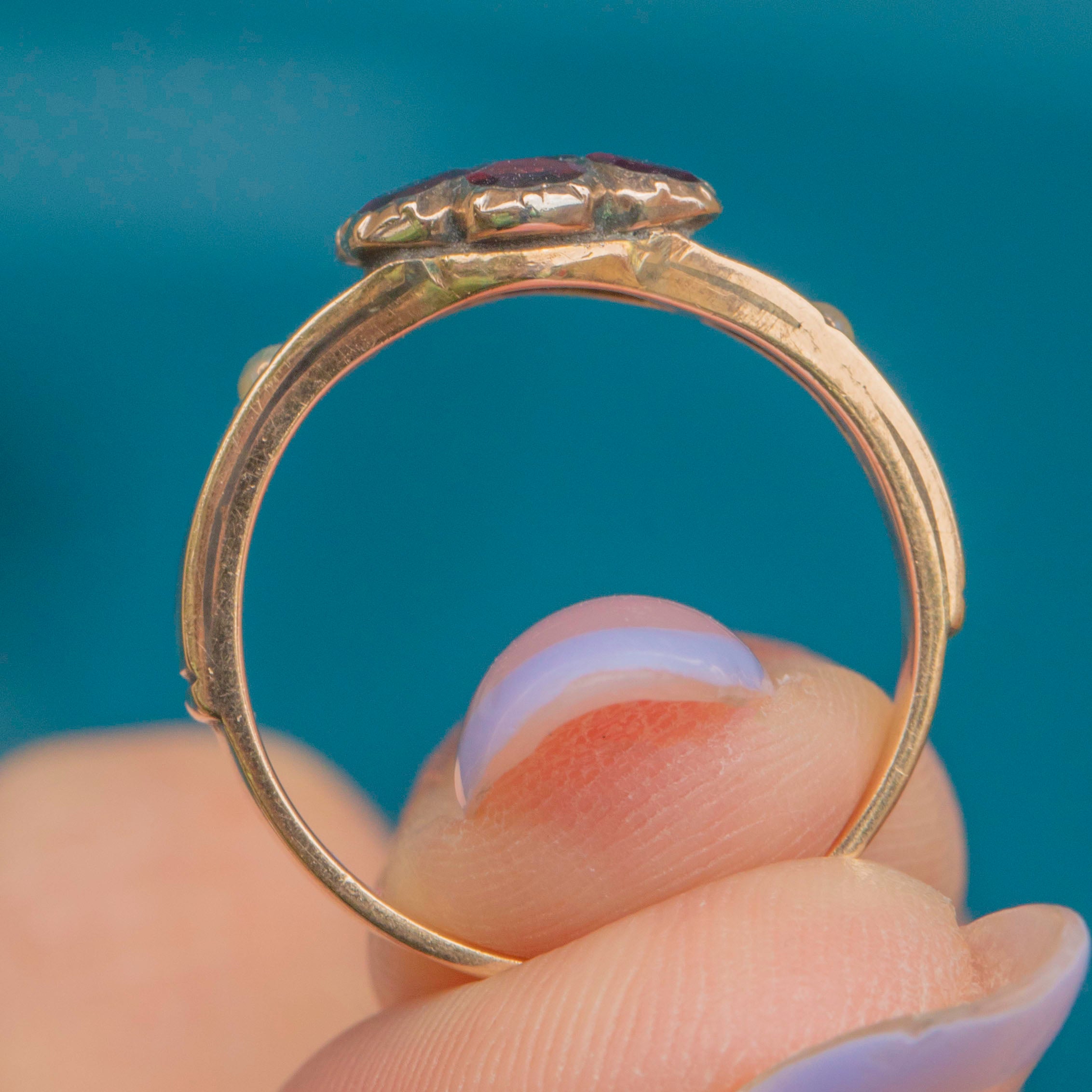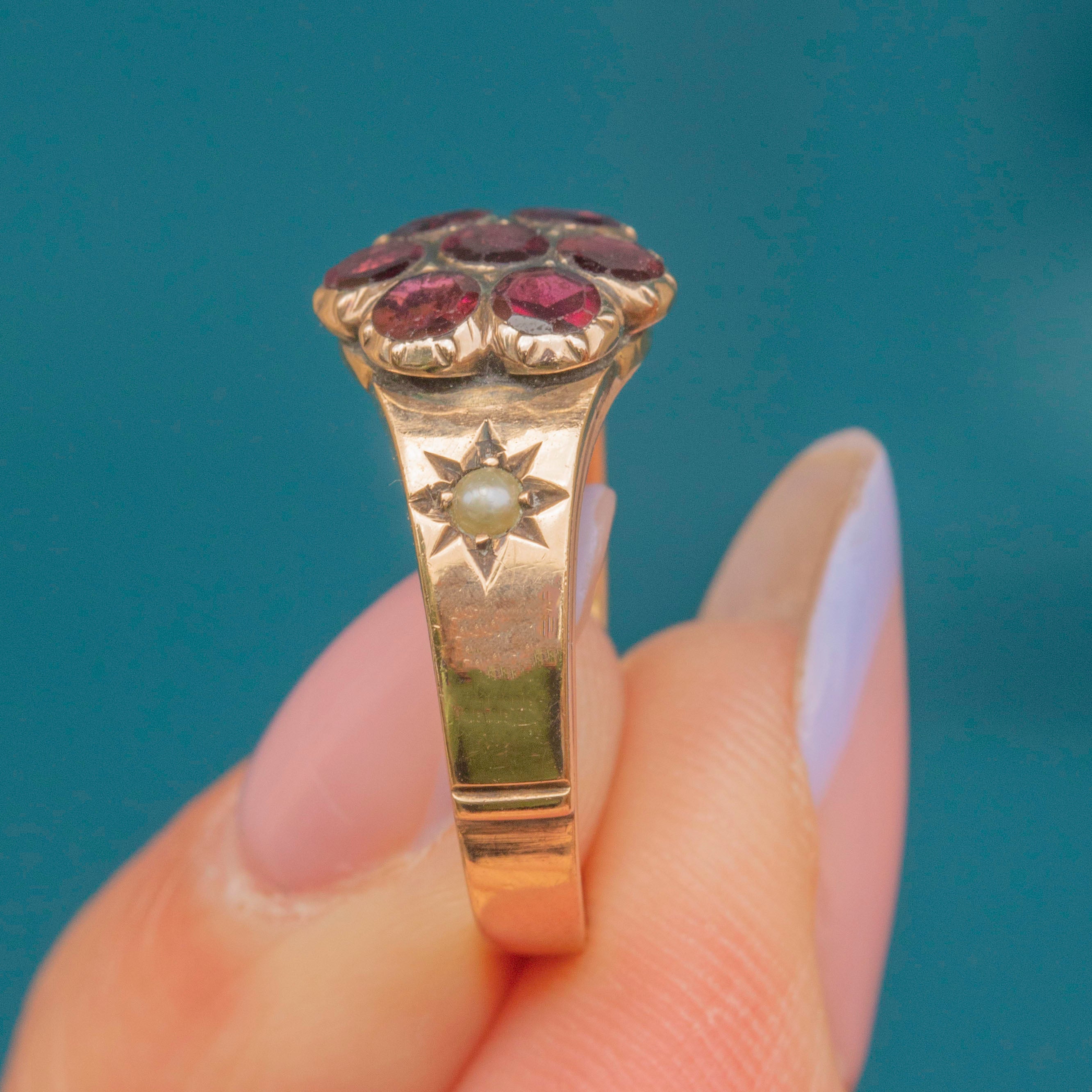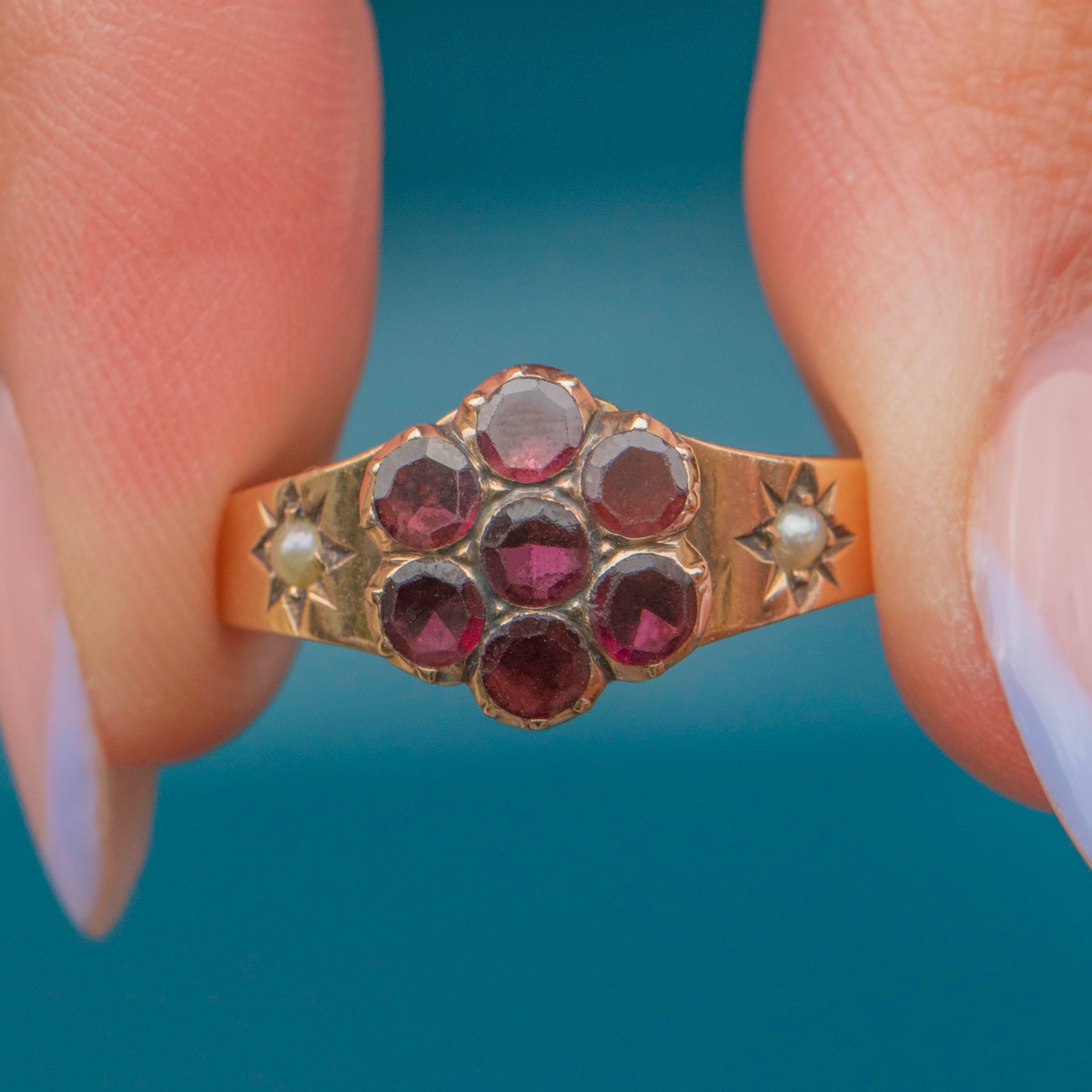 VERY GOOD: This Georgian 9ct Gold Garnet stars flower ring is in very good condition. She is beautifully crafted, with each of her Garnets and Pearls securely set. Under close inspection, there are some tiny fleabites on the Garnets, though this is hard to spot without a jeweller's loupe. The Gold is bright and buttery with a high-shine polish. There are some points of discolouration and surface wear to the Gold, as well as evidence of a previous resize at the back of the shank, though this cannot be seen when wearing and is common in jewellery of this age. The wide ring band feels comfortable to wear and is ready to be cherished for years to come!