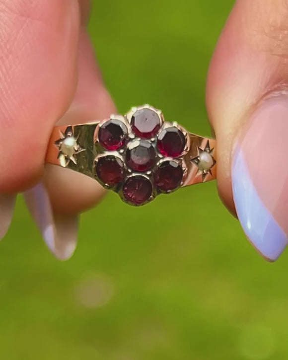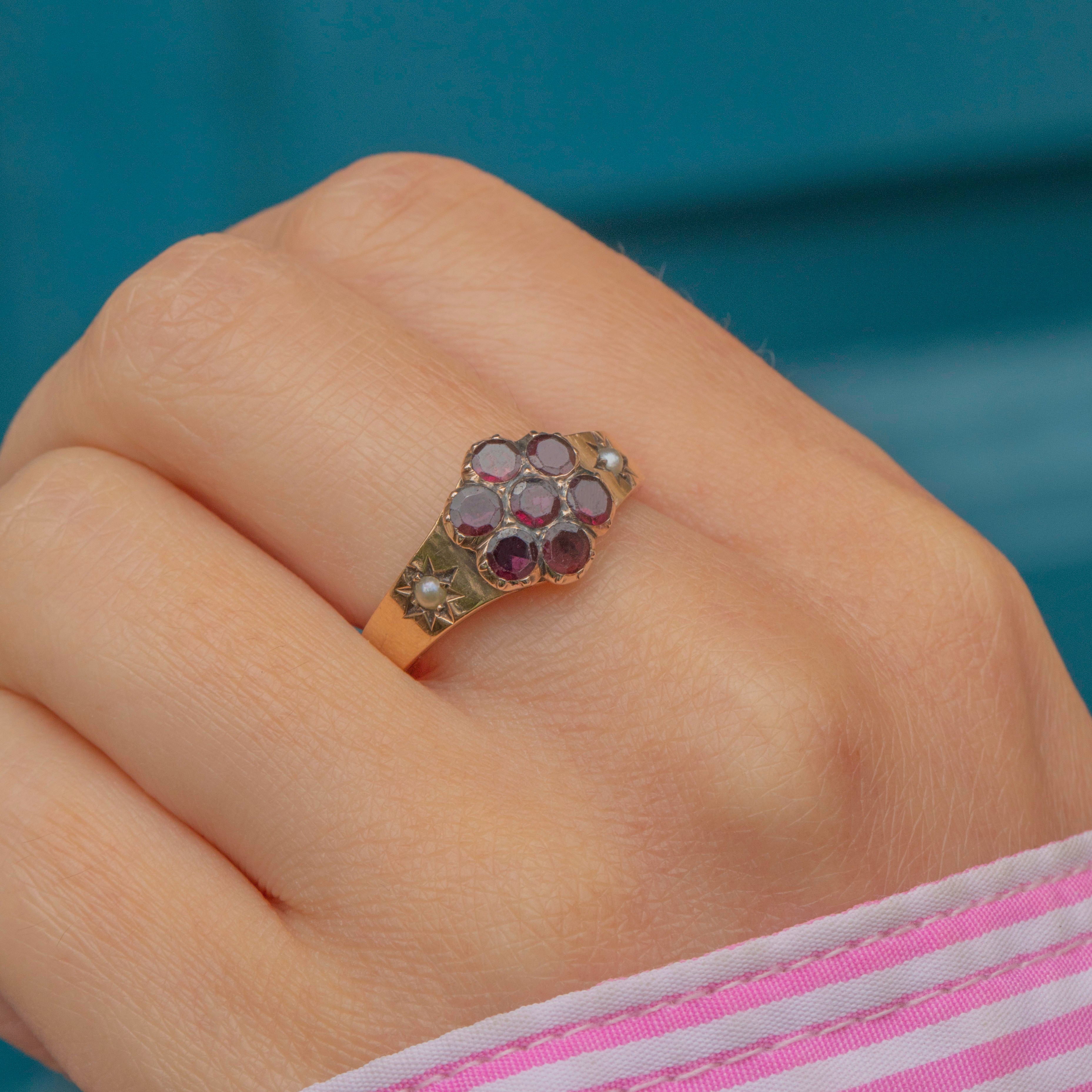 This Georgian 9ct Gold Garnet stars flower ring is an antique delight! Flashing with deep crimson hues as the antique flat-cut Garnet facets catch the light. They are flanked by two lustrous Pearls, displayed in whimsical starry settings, adding a celestial finishing touch.