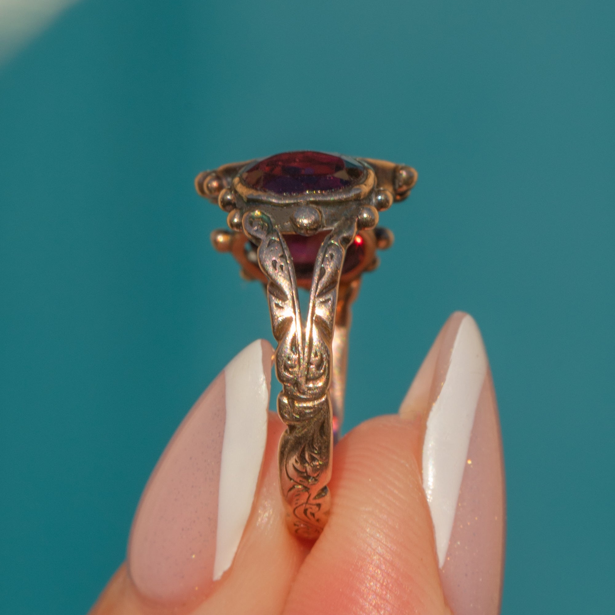 This Georgian 9ct Gold Garnet three stone ring would make an exquisite addition to your jewellery collection. Boasting three glimmering Garnets with a combined weight of 2.00ct, this Georgian ring is truly a delight on the hand!