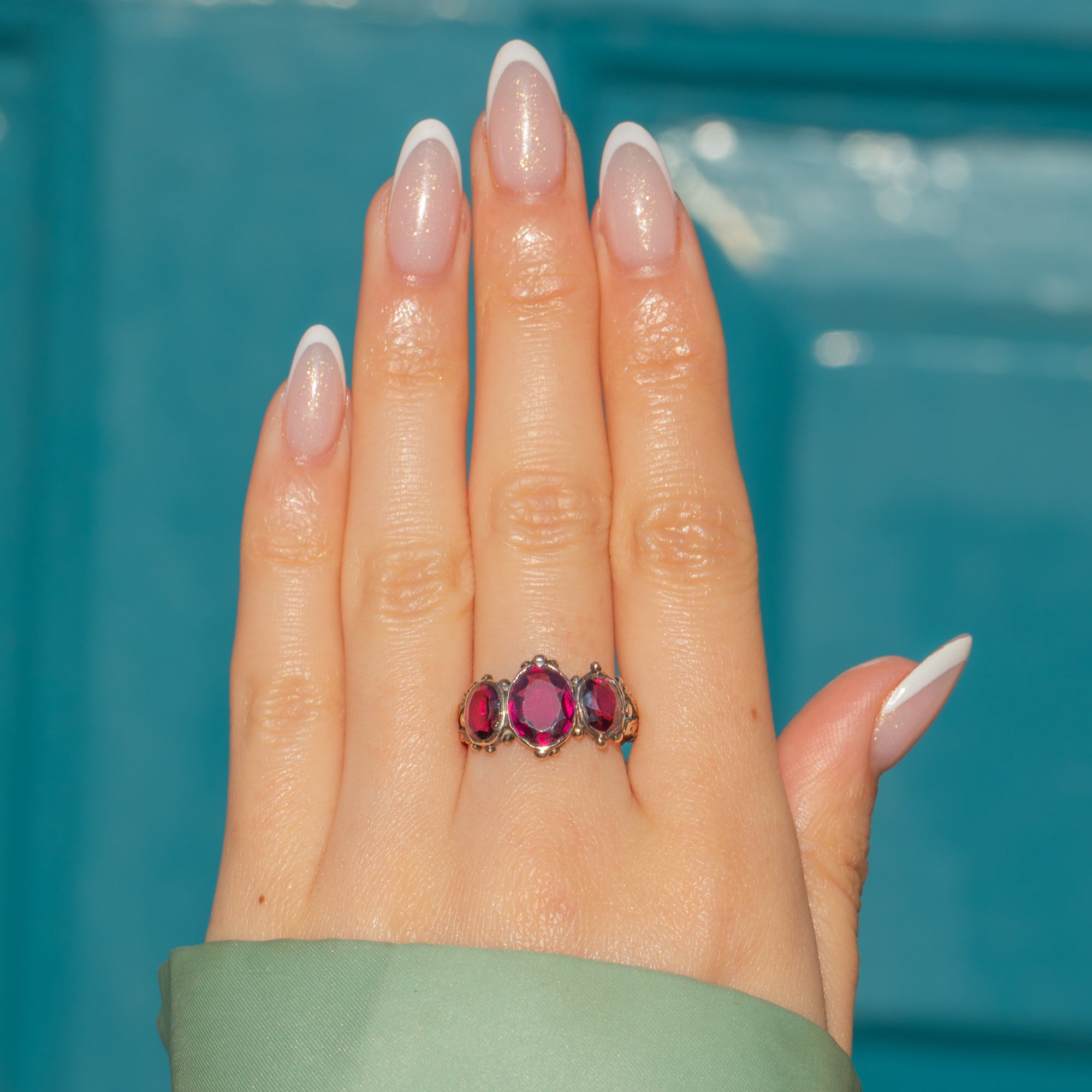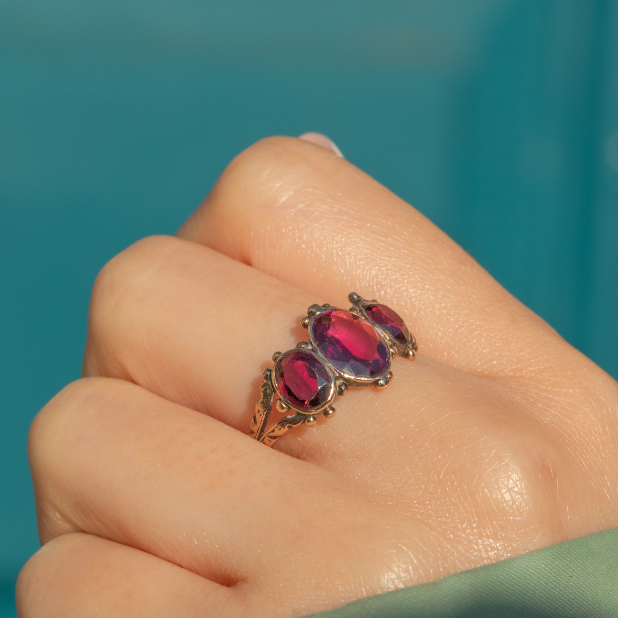 The marvellous trio of faceted Garnets have deep red hues, perfectly complemented by the rich 9ct Gold, framed by beaded detailing with an intricately engraved band giving this gorgeous ring a desirable ornate finish.