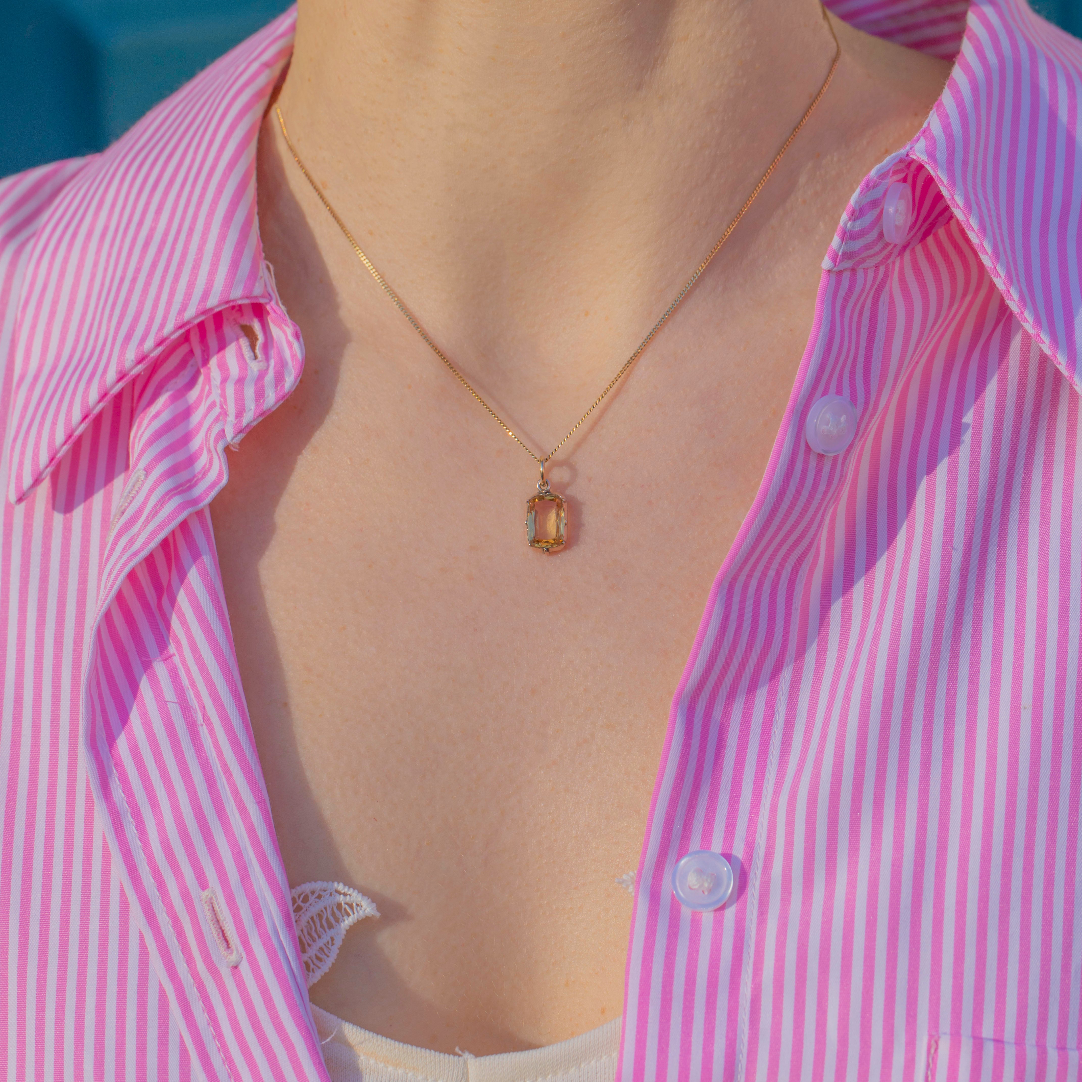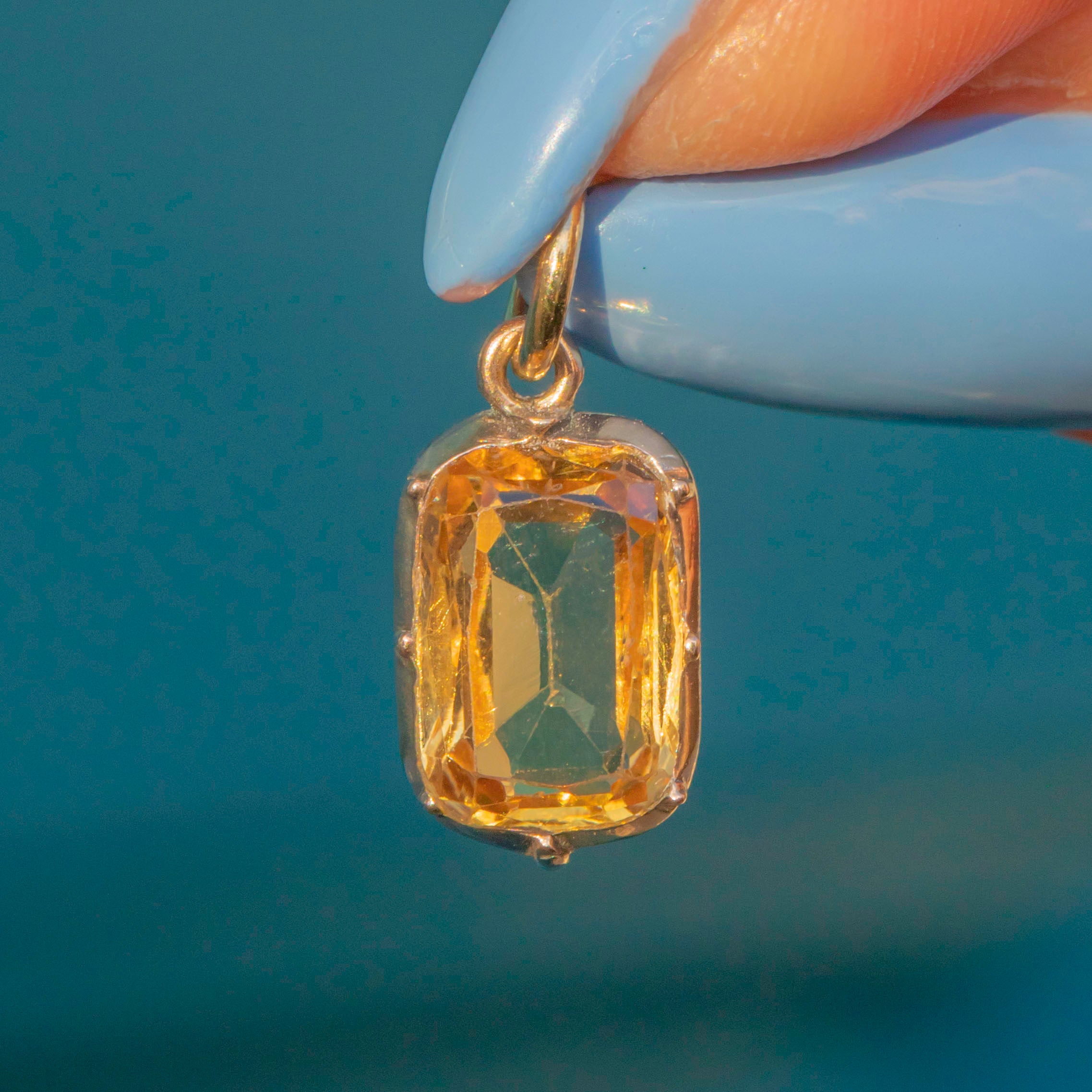 This Georgian 9ct Gold Golden Topaz charm would make a stunning addition to any jewellery collection. The hand-cut 4.70ct Topaz gemstone gleams with warm, peachy tones, exuding a summery allure that captivates anyone who lays eyes on her.