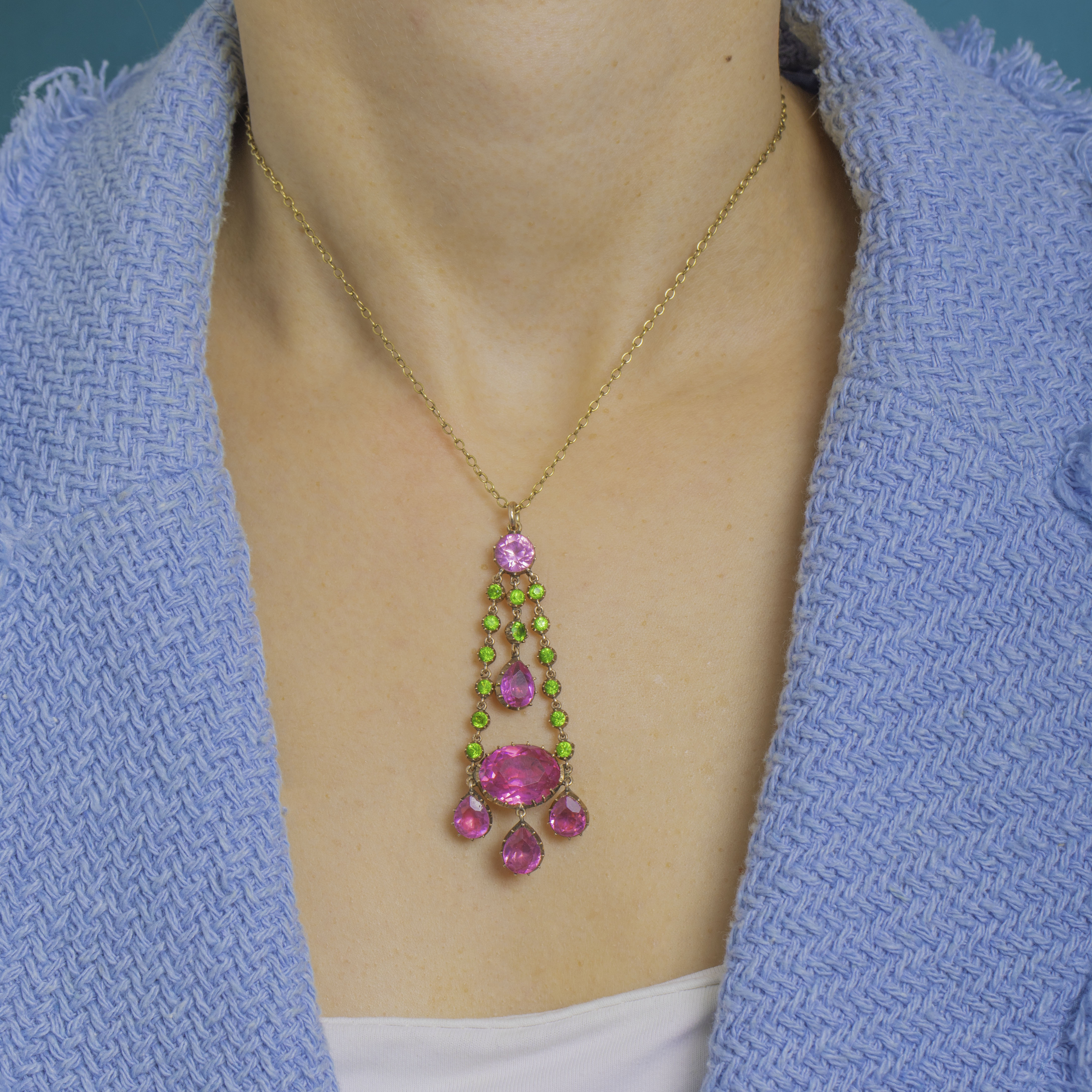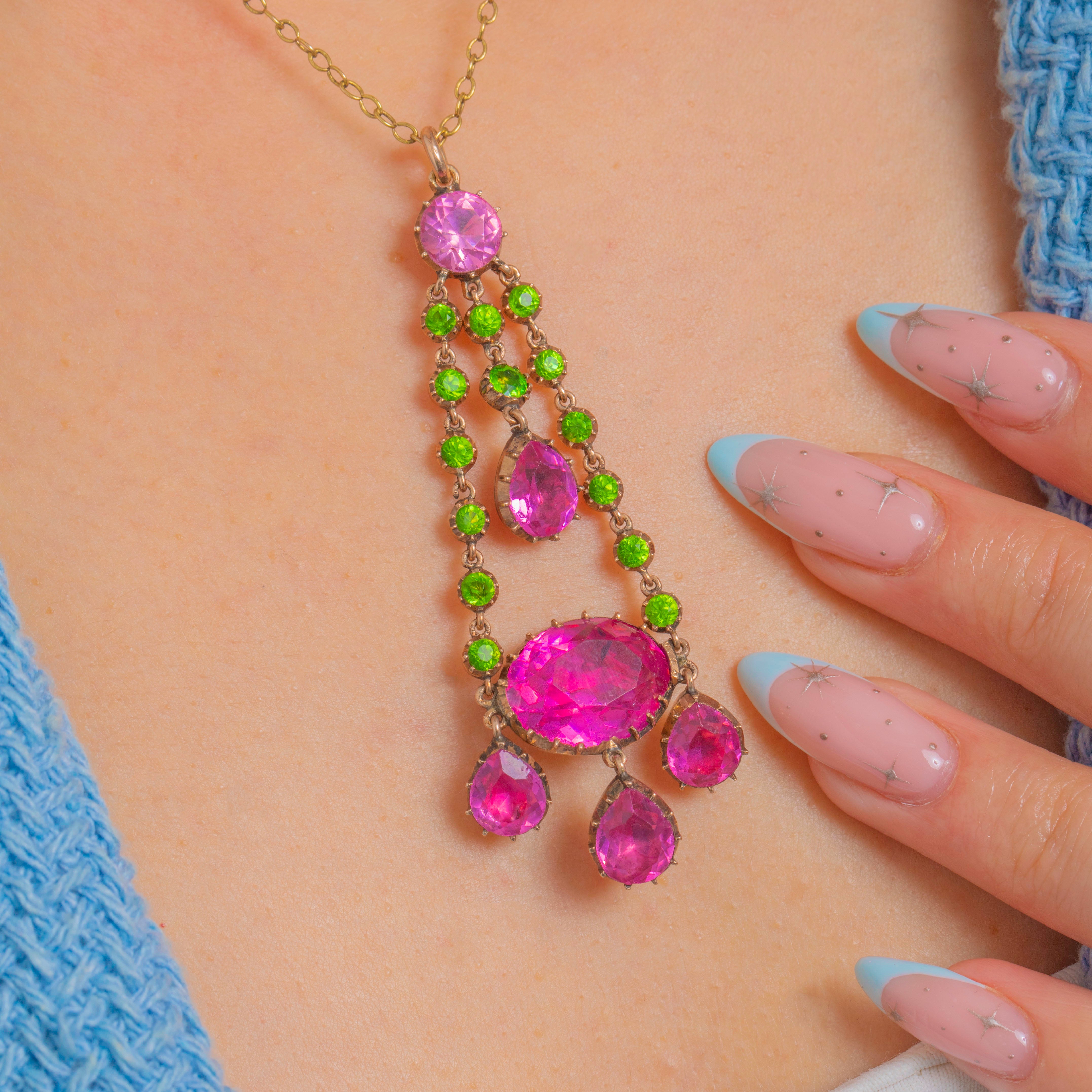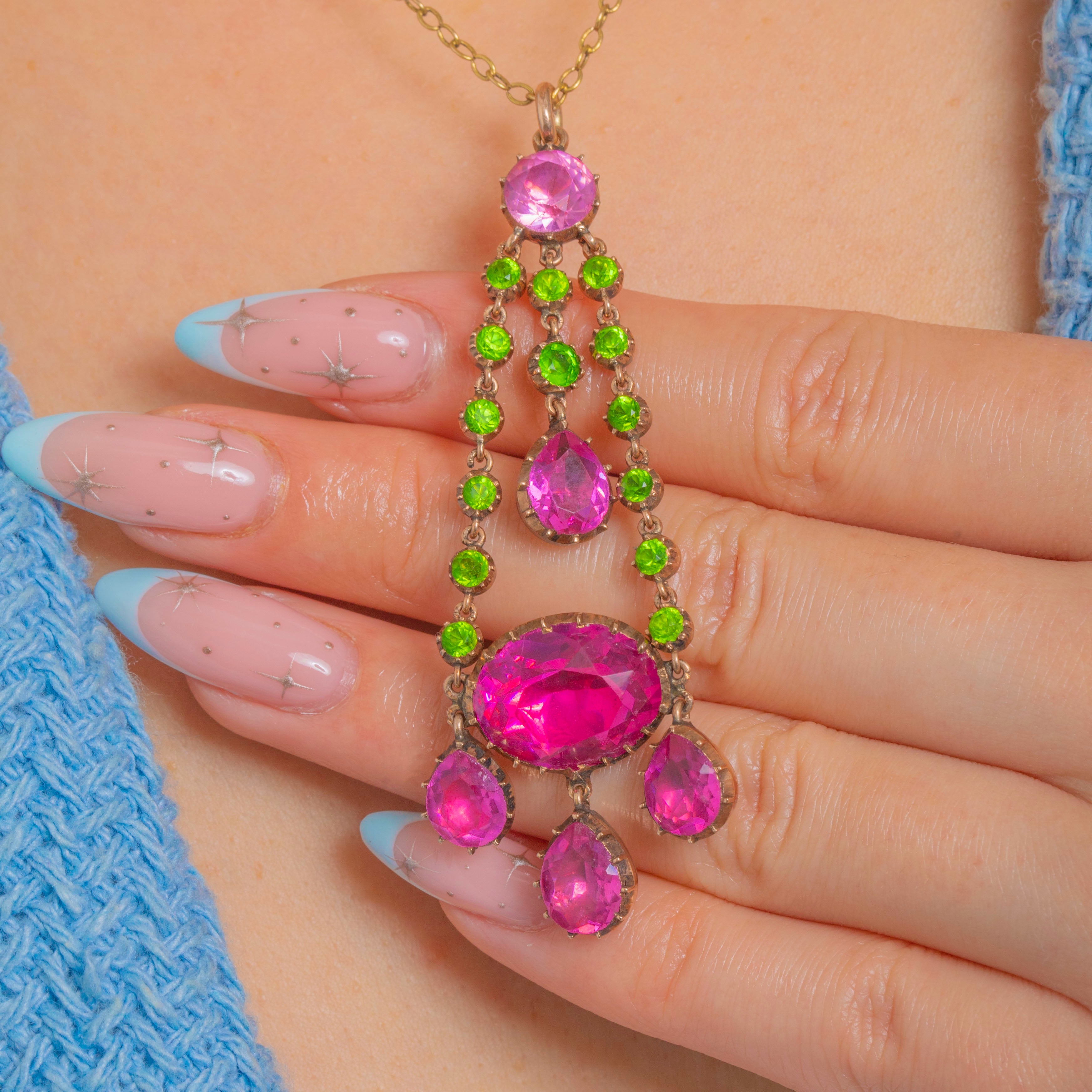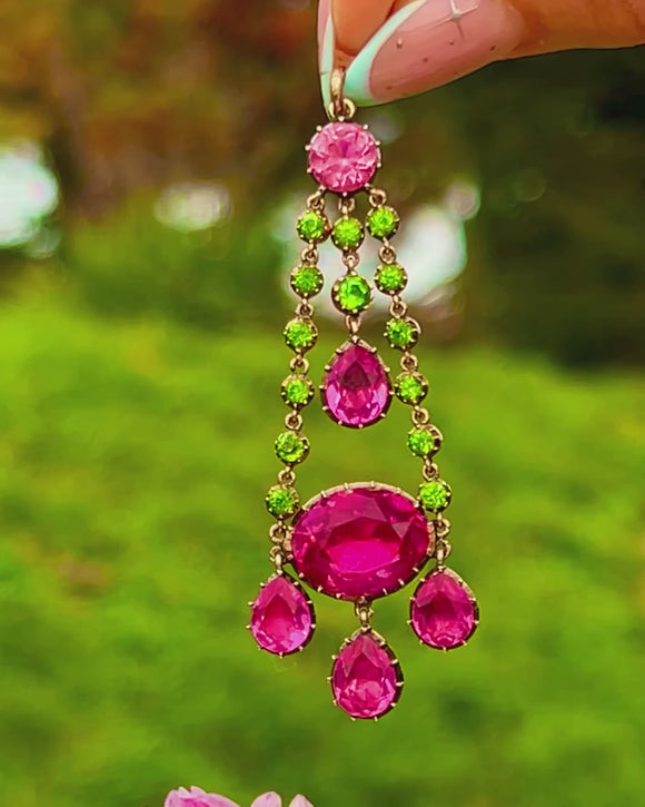 A joyous burst of colour from the Georgian era, this articulated girandole pendant pairs vivid fuchsia‑pink Paste with bright apple‑green Paste in a beautifully balanced, chandelier silhouette. Two tapering rails of petite green rounds frame larger pink stones, culminating in a statement oval and three pear‑shaped drops, all linked for lively movement and enchanting sparkle.