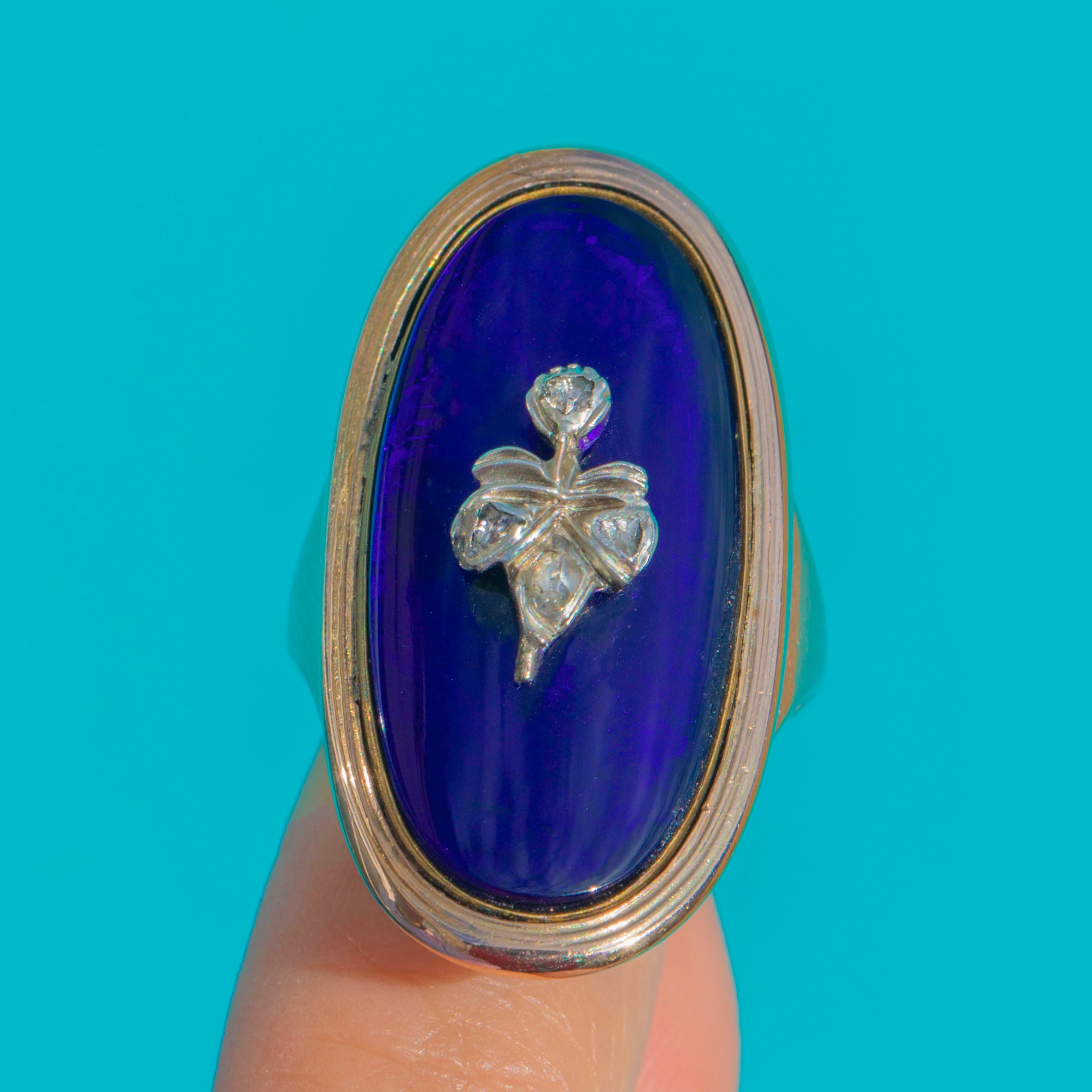 Georgian Bristol Blue Glass Ring with Diamond Flower Item added