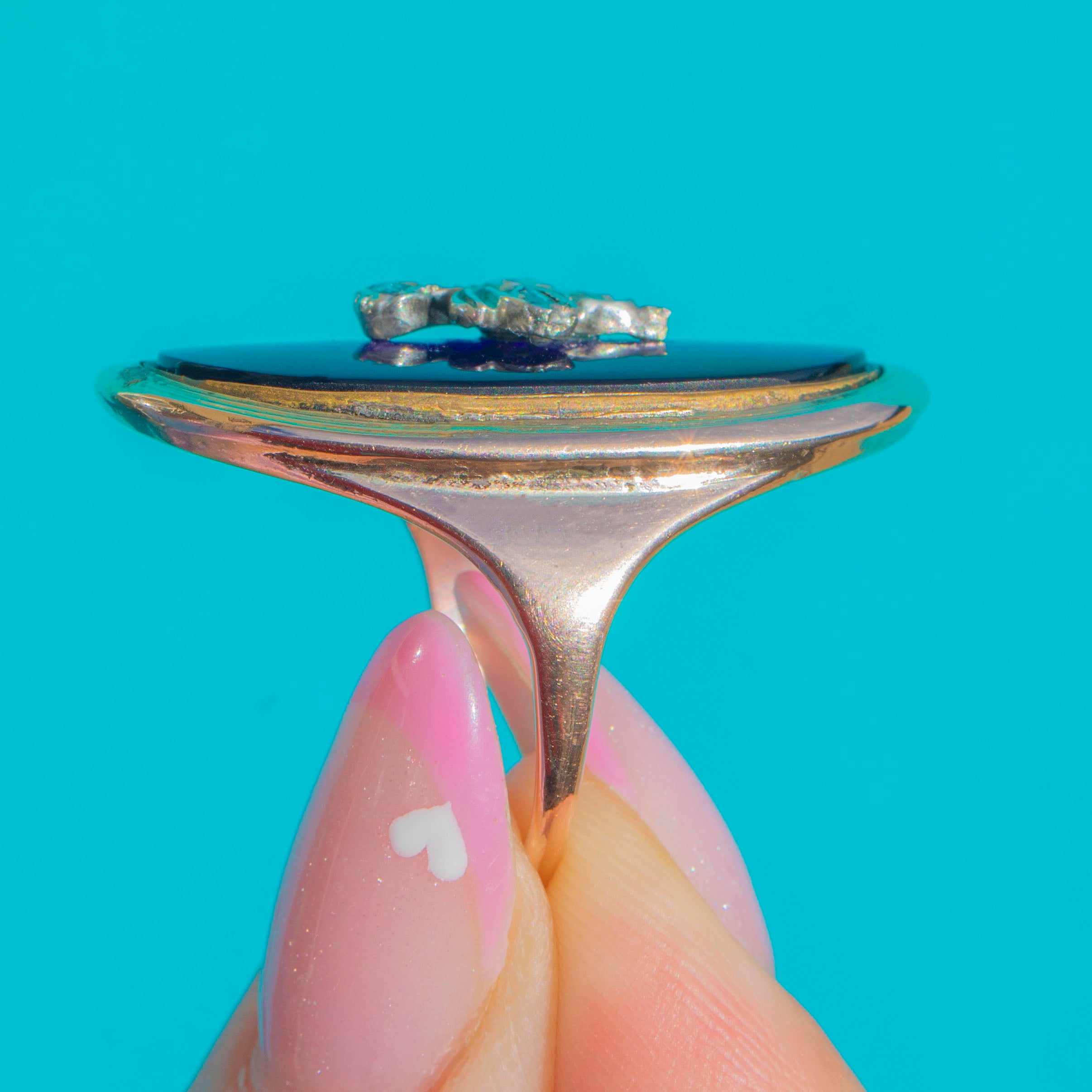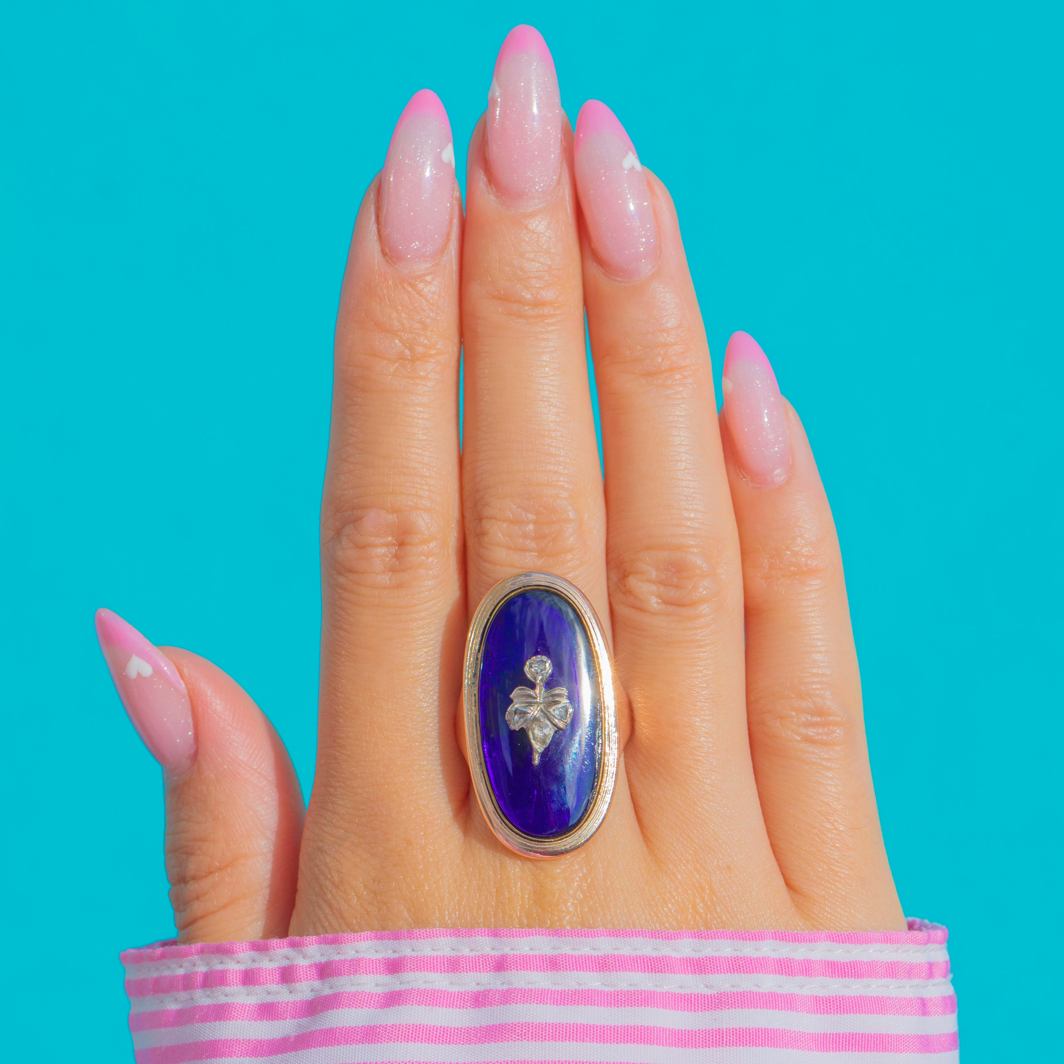 This exquisite Georgian ring showcases a vibrant Bristol Blue glass cabochon, its rich cobalt hue accented by a delicate Diamond-set flower motif to the centre. Mounted in buttery 9ct Gold, this design embodies the refinement and romantic sentiment of the early 19th century.