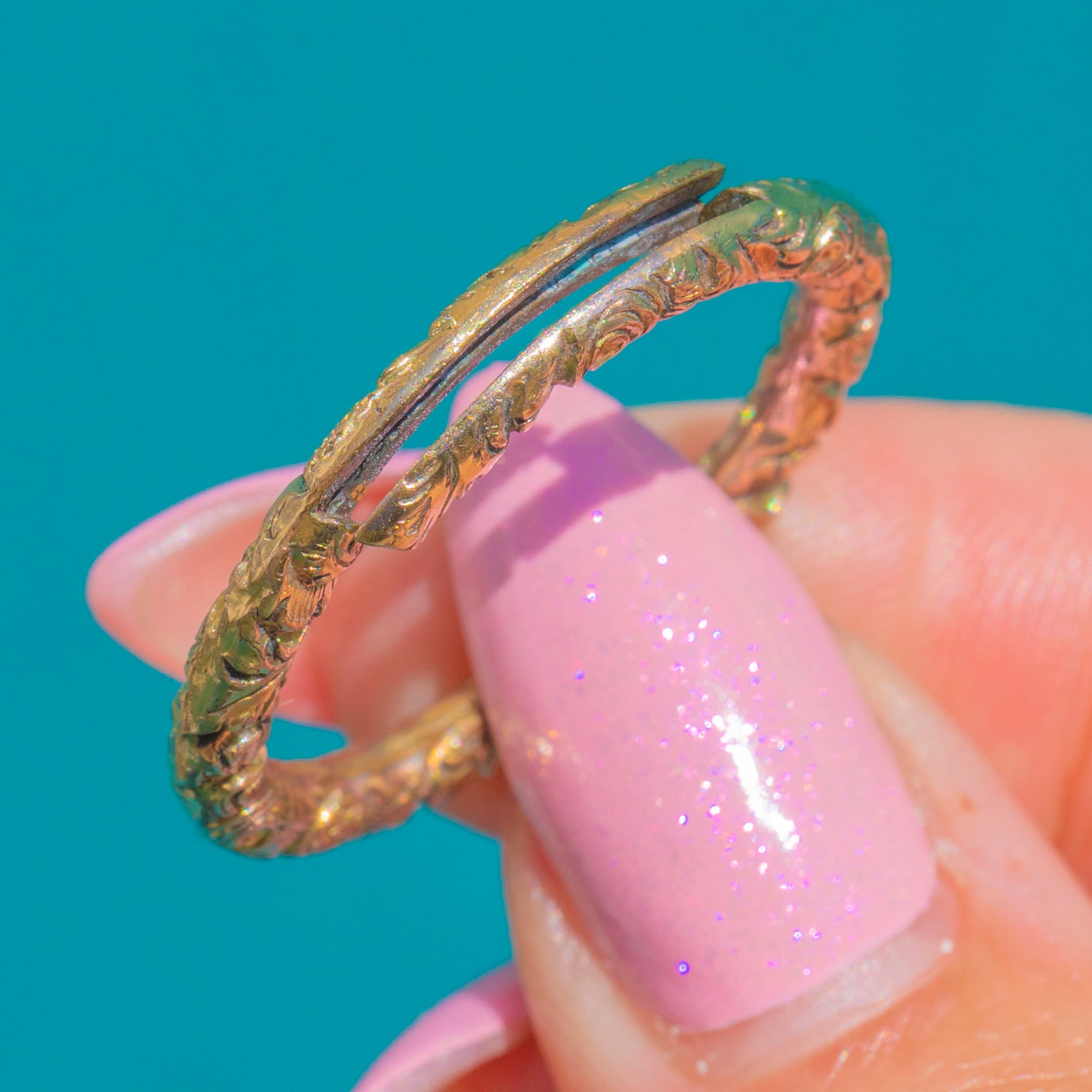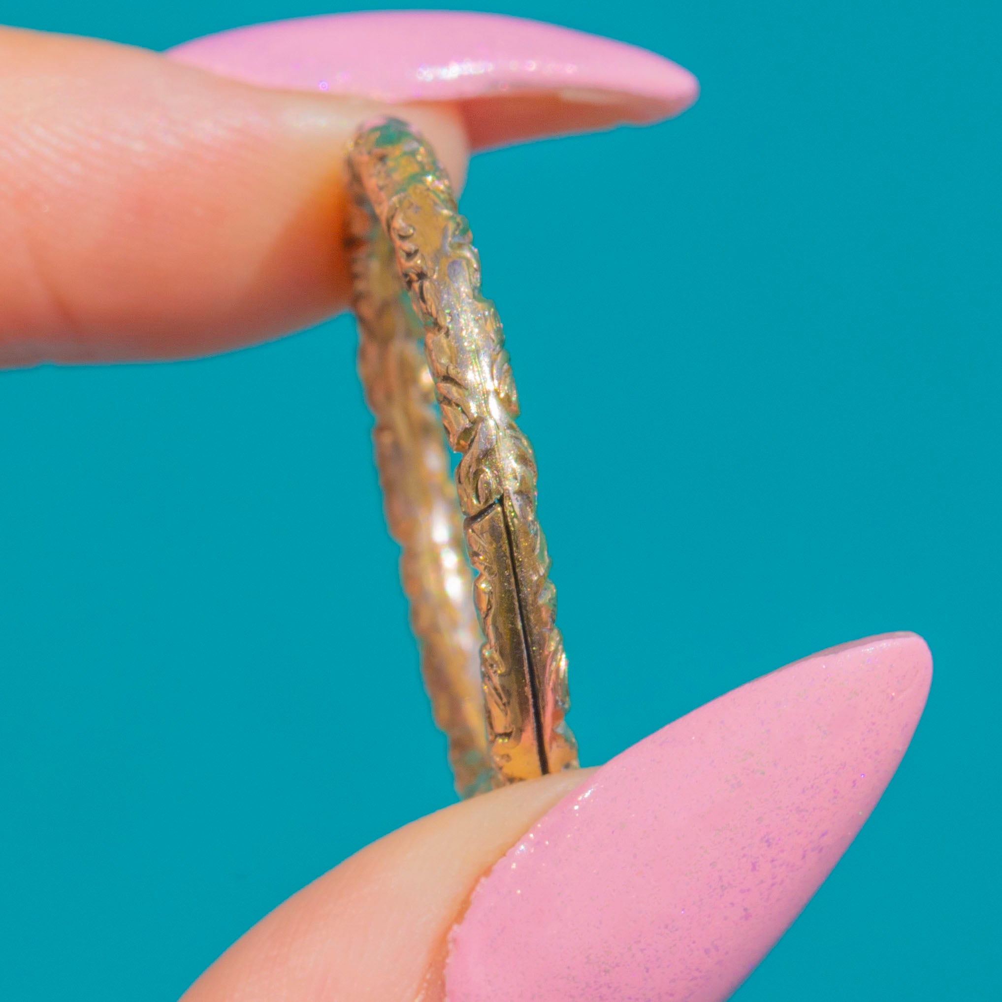 Wunderschön verziert und zugleich äußerst praktisch präsentiert sich dieser extra-große, Gold-Cased gravierte Split-Ring aus der Georgian Epoche als ein Schatz voller klarer Details und warmer Ausstrahlung. Die breite, kreisrunde Form ist rundum mit Blattvoluten, Rosetten und feinen Perlverzierungen gearbeitet, wodurch eine reich strukturierte Oberfläche entsteht, die bei jeder Bewegung das Licht einfängt.