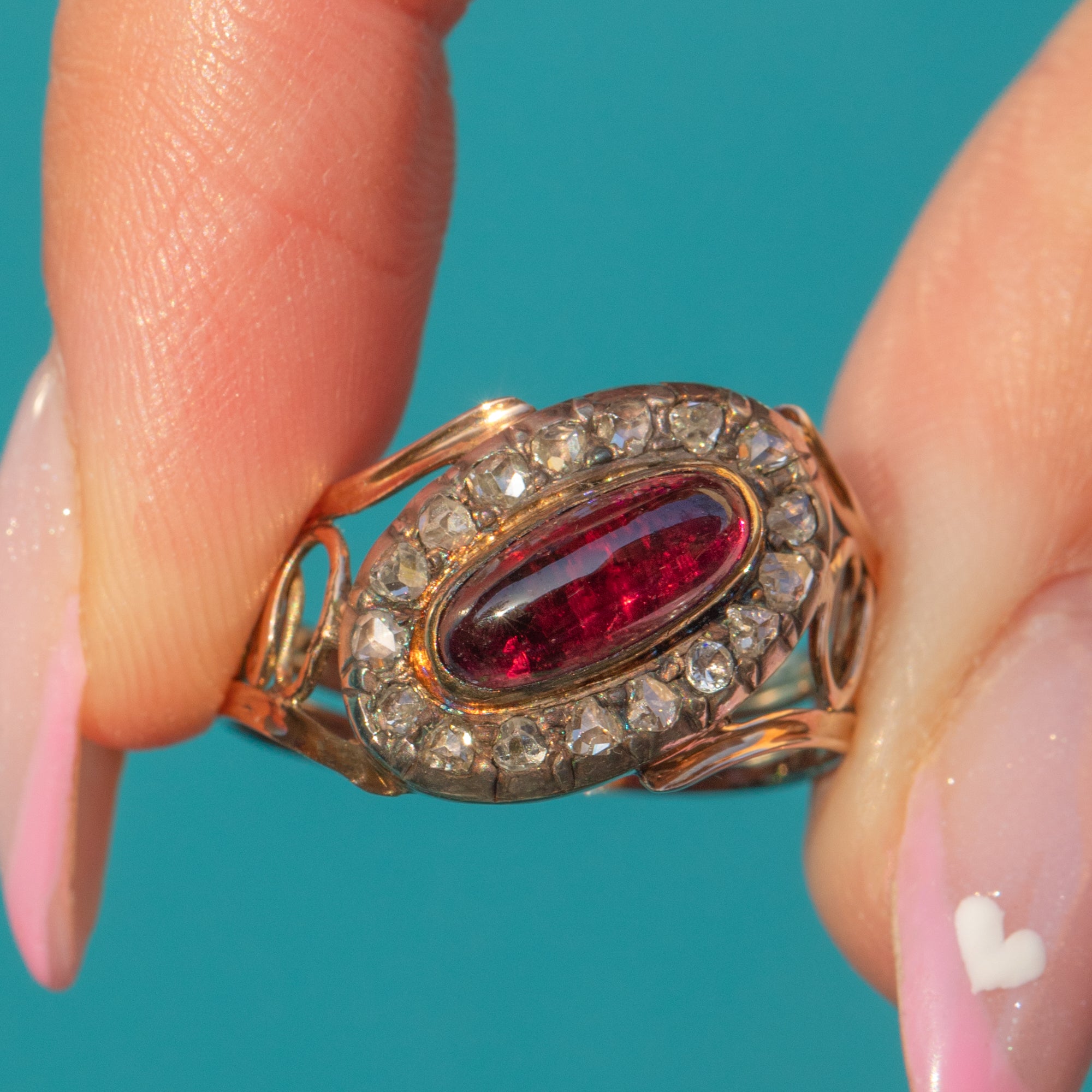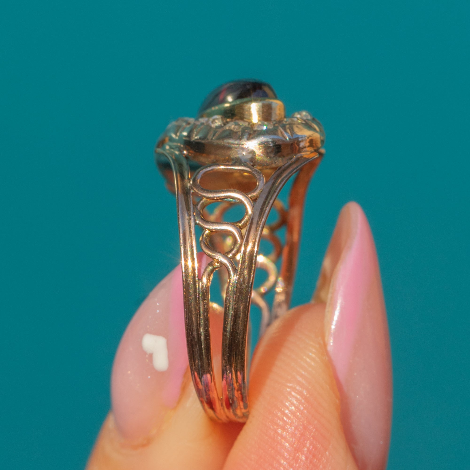 An elegant Georgian ring featuring a deep wine-red cabochon Garnet framed by a halo of twinkling Rose Cut Diamonds, all set in warm 9ct Gold. Timeless and romantic, the low profile makes it comfortable for everyday wear while the antique sparkle adds effortless charm.
