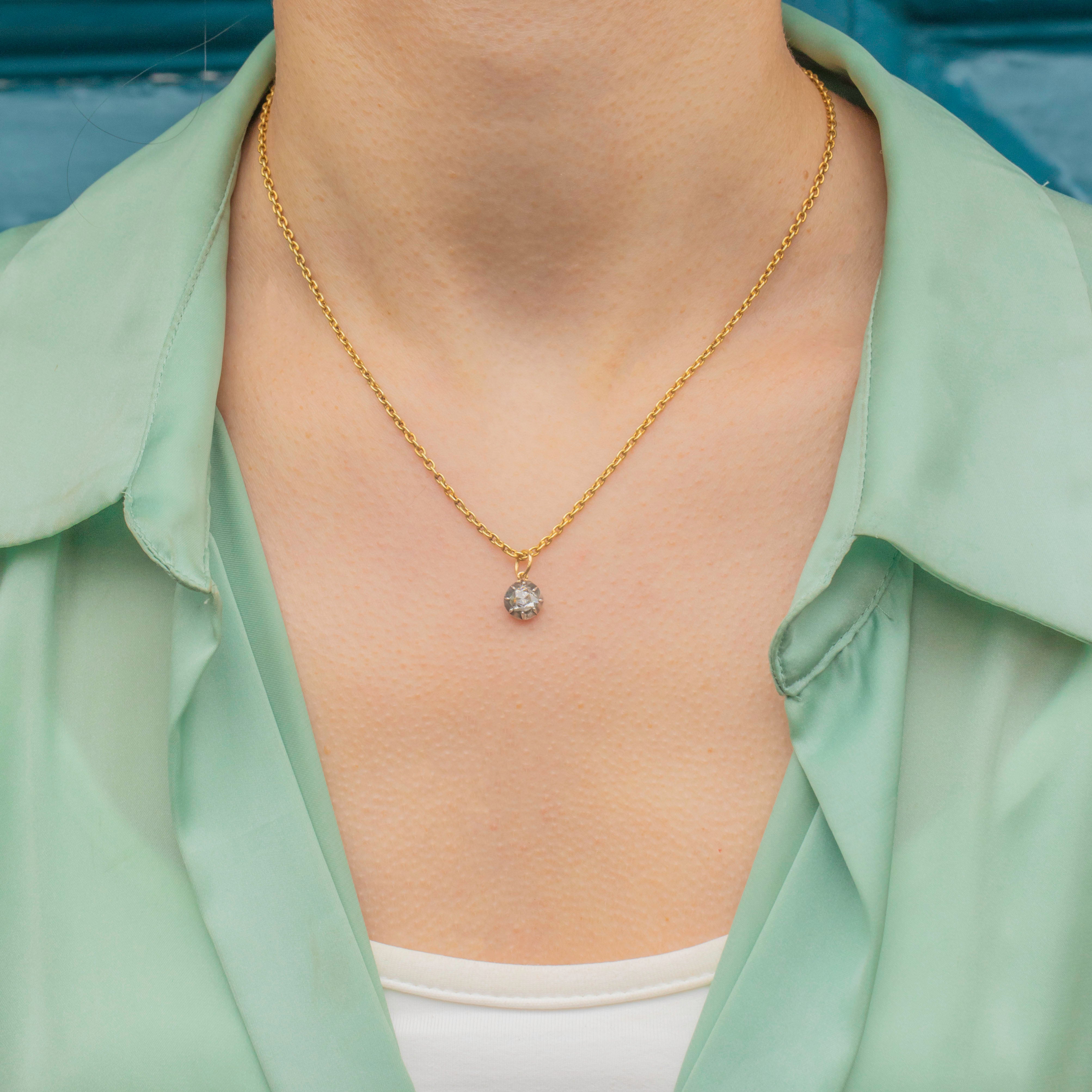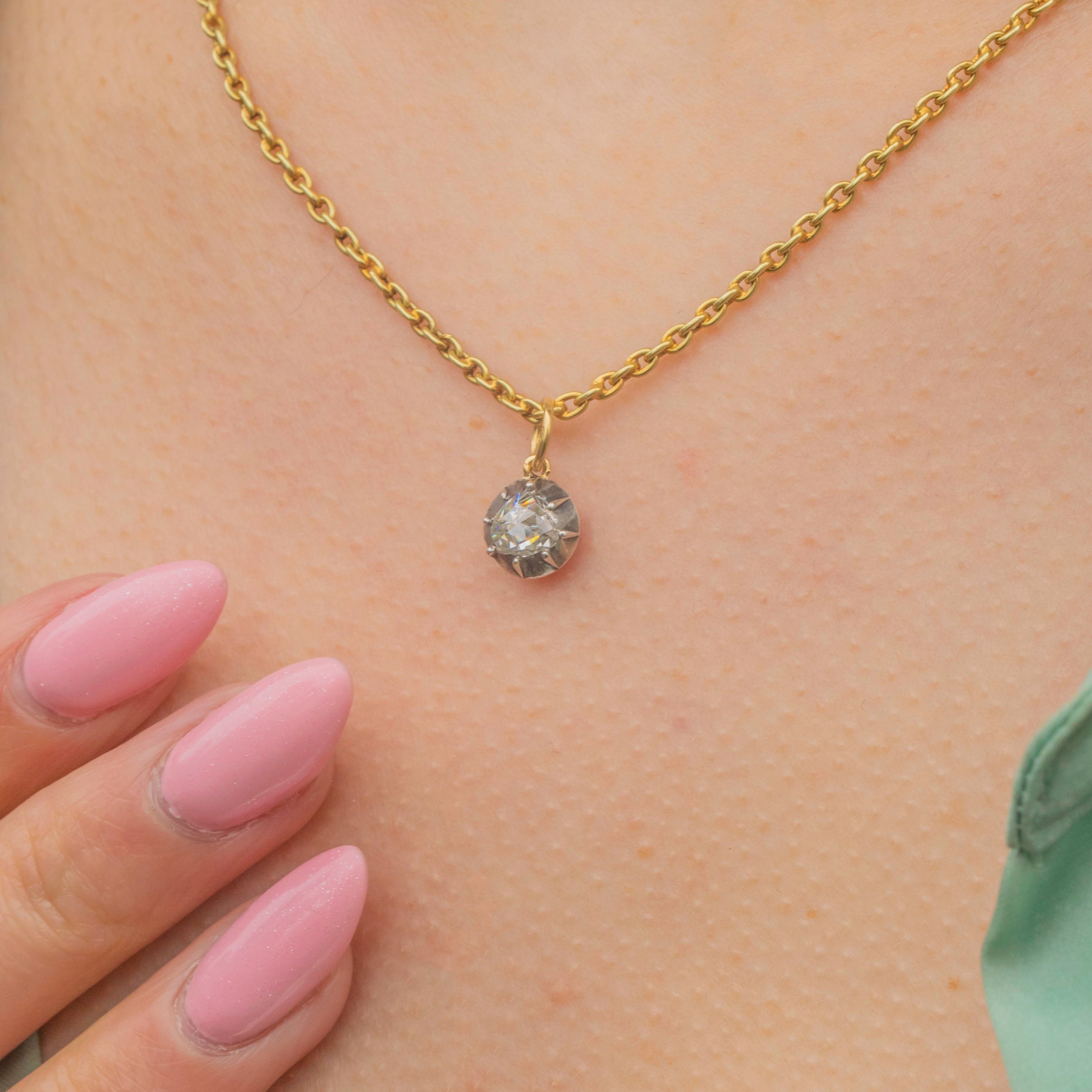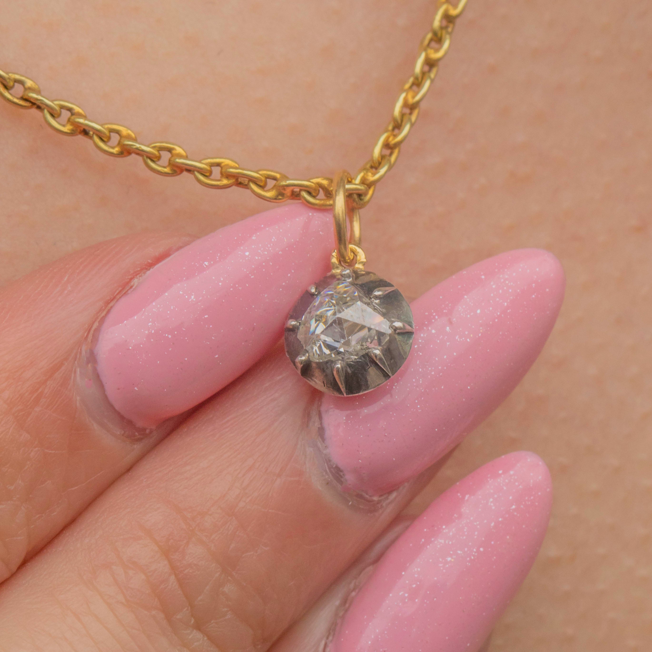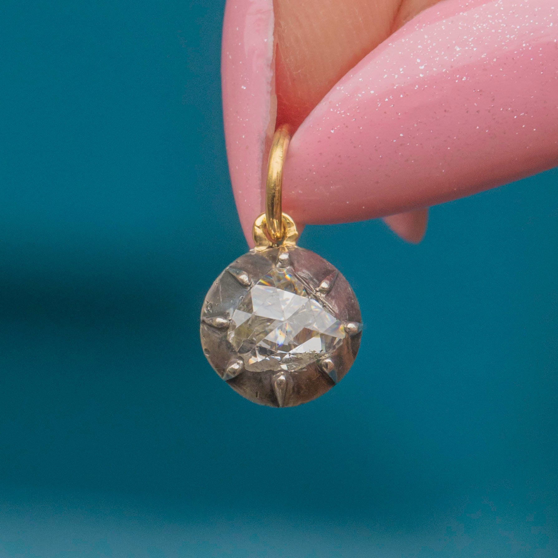 VERY GOOD: This Georgian rose-cut Diamond pendant is in very good condition. The Diamond has a crisp set of facets, though there is some surface wear, including scratches present to the Diamond and settings. Despite this, she is a beautiful piece, and with a secure jump ring, you can wear this antique Diamond pendant with confidence!