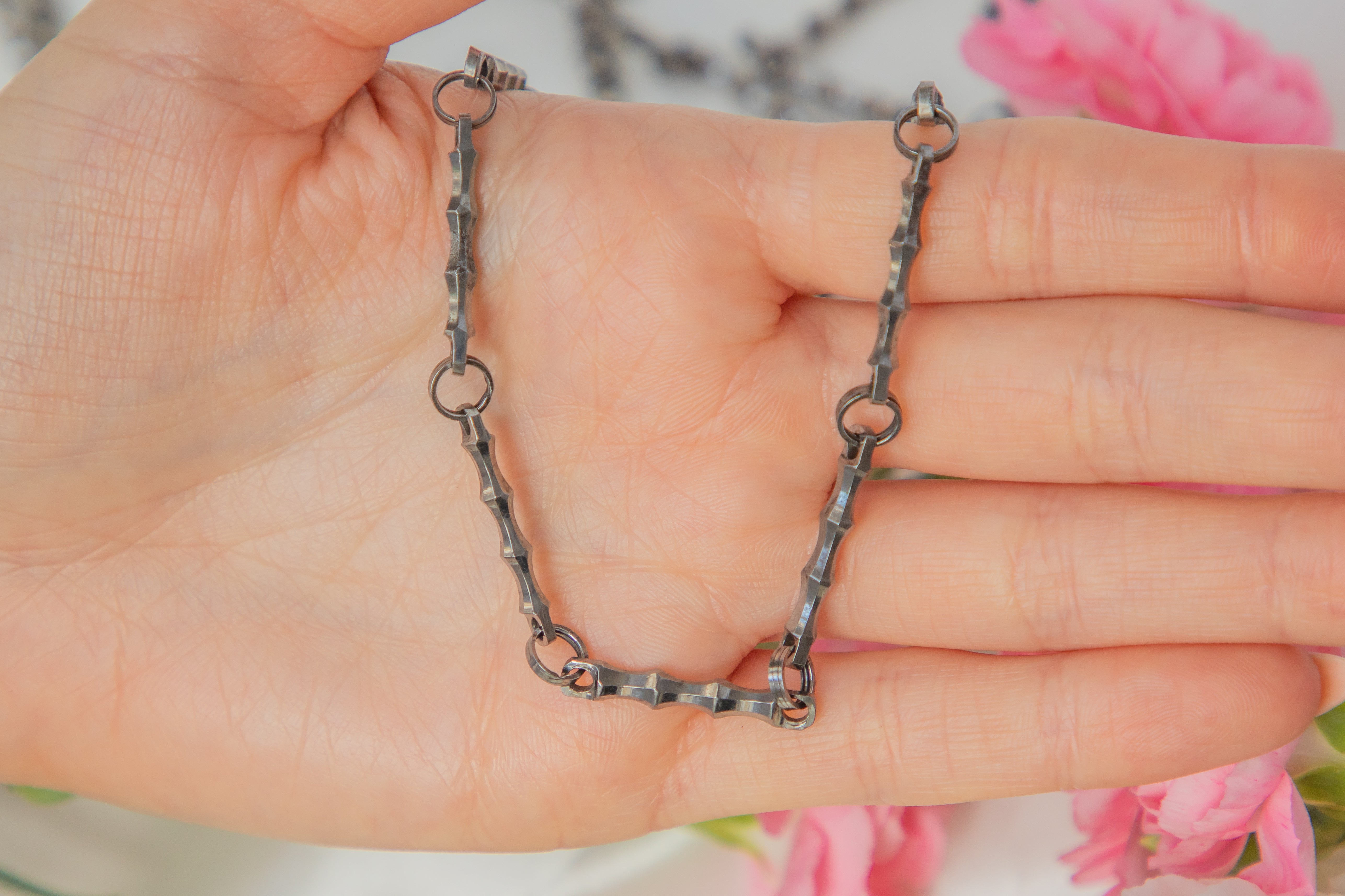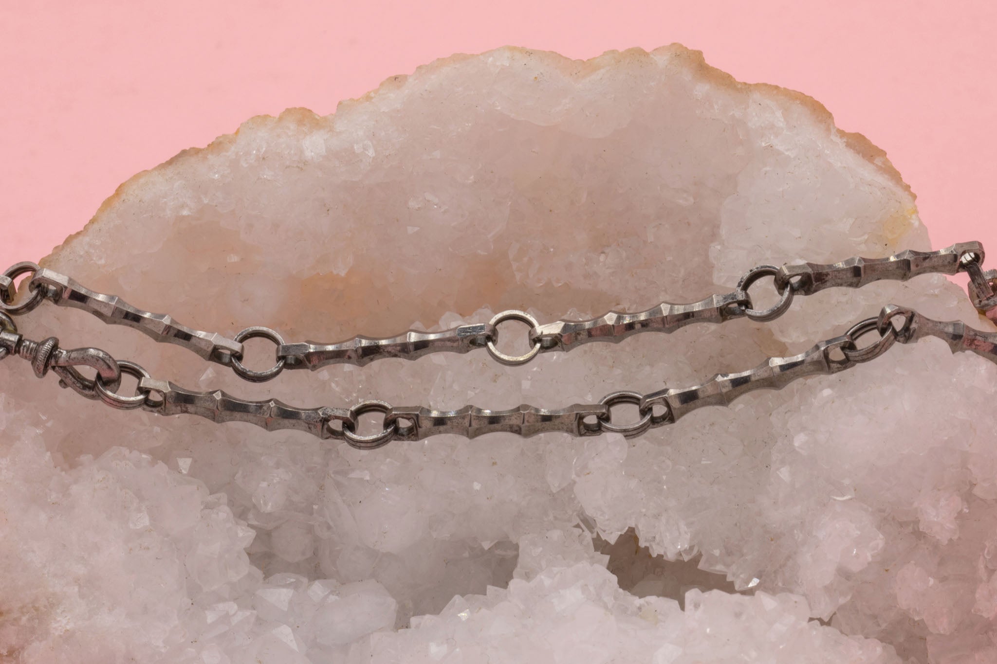 With a stunning gunmetal tone, this exquisite piece of antique jewellery will add a touch of punk and Gothic glamour to your jewellery wardrobe. The faceted links catch the light perfectly, making her radiance and beauty shine without interruption.