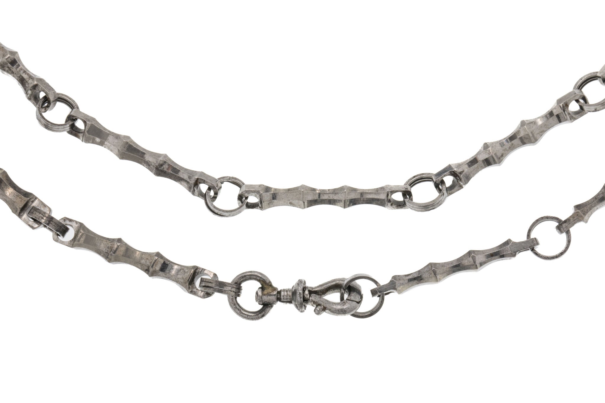Every inch of her design is unique and incredibly hard to come by nowadays. Composed of a link style we have never seen before, akin to bamboo, each Steel link is joined by super rare sliced steel split ring connectors, and with 54.5 inches of her, you can soak up her antique beauty wrapped around multiple times.