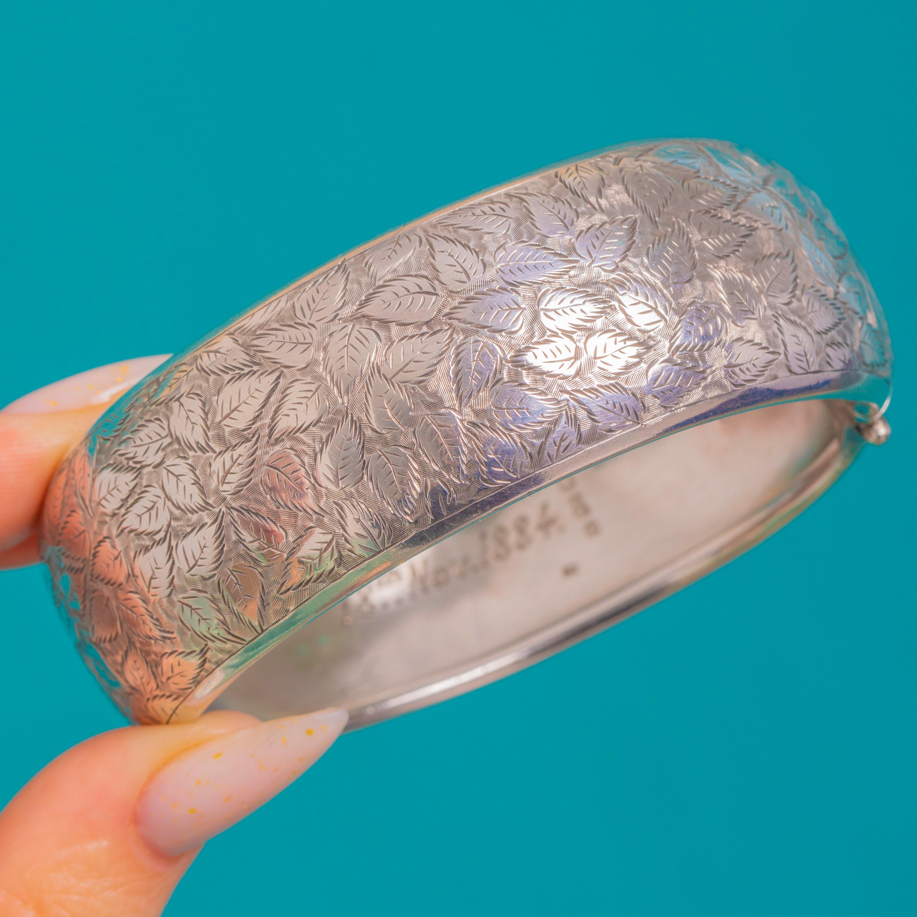 Alive with late Victorian charm, this wide Silver hinged bangle is richly bright‑cut with lush foliate engravings, framed by smooth rolled edges for a beautifully refined finish. Its domed profile and statement width create a bold botanical sweep of light and shadow across the wrist.