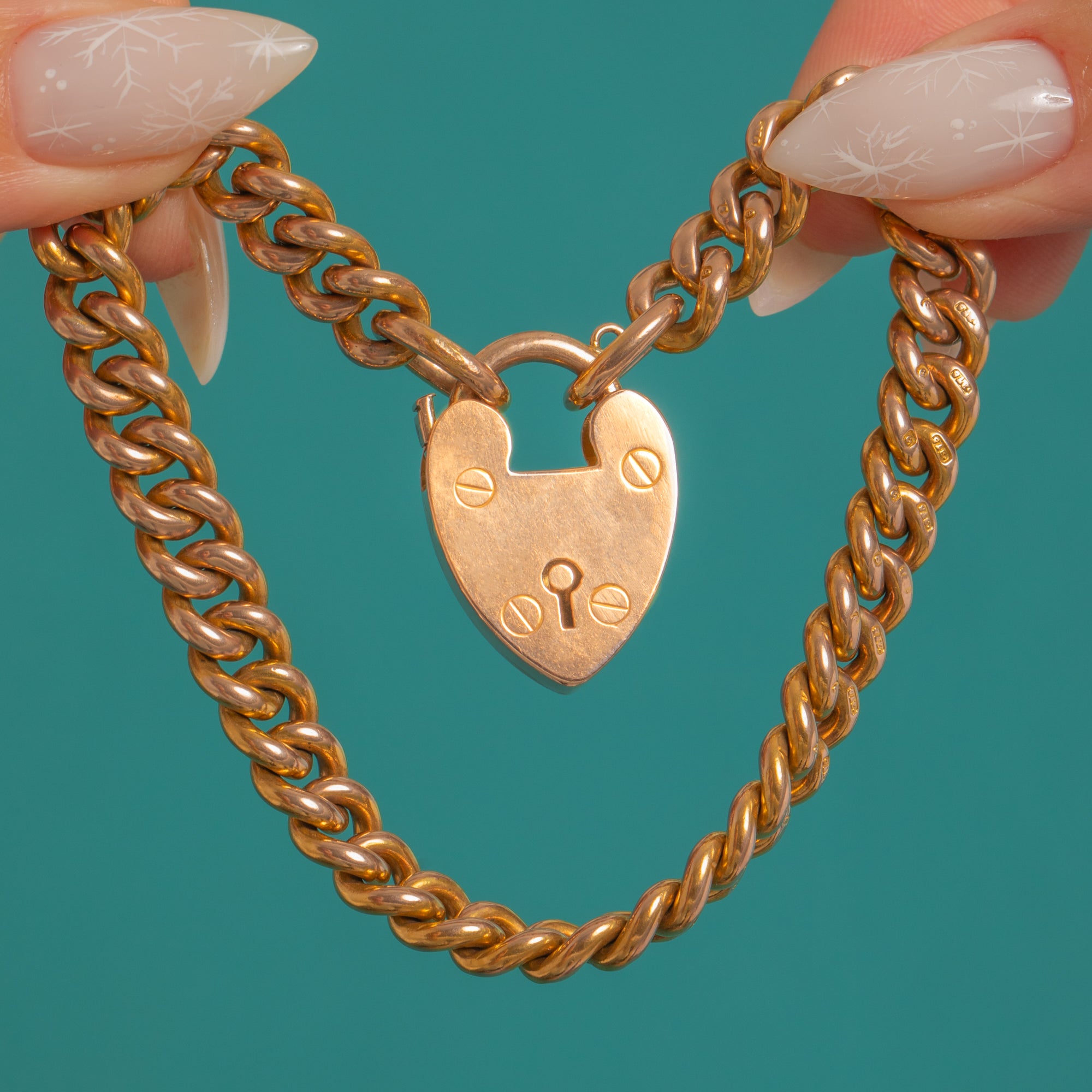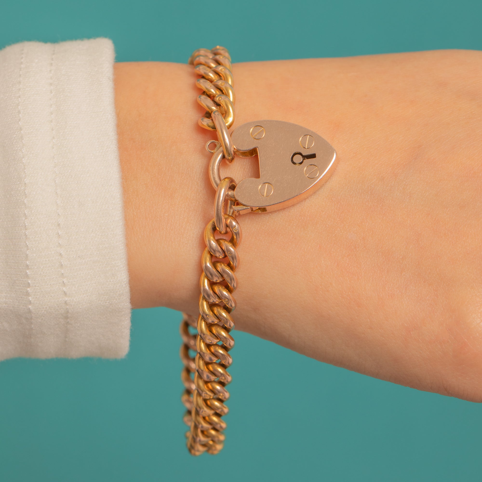 A timeless icon of British jewellery, this heavy Victorian curb-link bracelet is crafted in rich 9ct Gold and finished with a classic heart-shaped padlock clasp. The chubby, uniform links are beautifully made with a bright, mirror-like polish, while the padlock bears the traditional keyhole motif and neat screw-head detailing for that perfect romantic flourish.