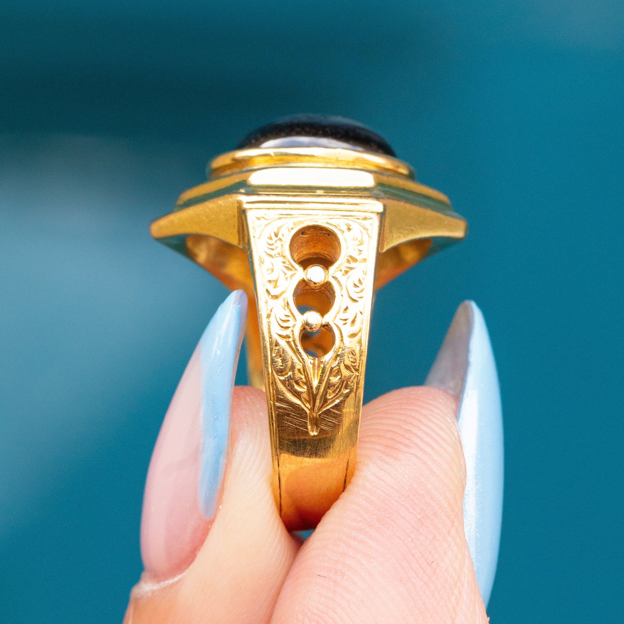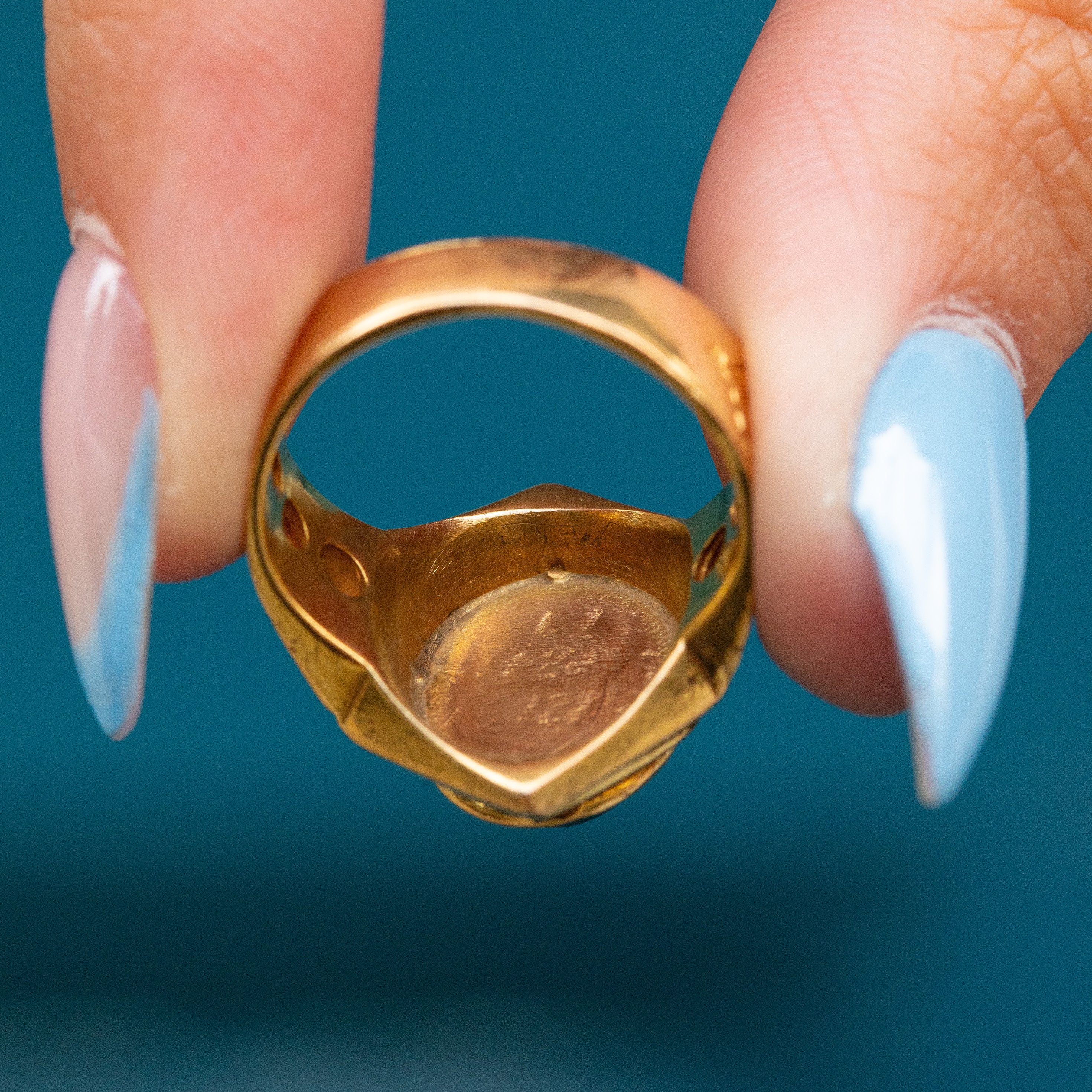 With a full set of English hallmarks dating to 1867, this Victorian Garnet ring is a fine collector's piece! Crafted entirely from solid 18ct Gold, the impressive hexagonal ring face is inlaid with a 2.16ct Garnet cabochon, with a deep crimson hue that will seduce you the moment you lay eyes on her.