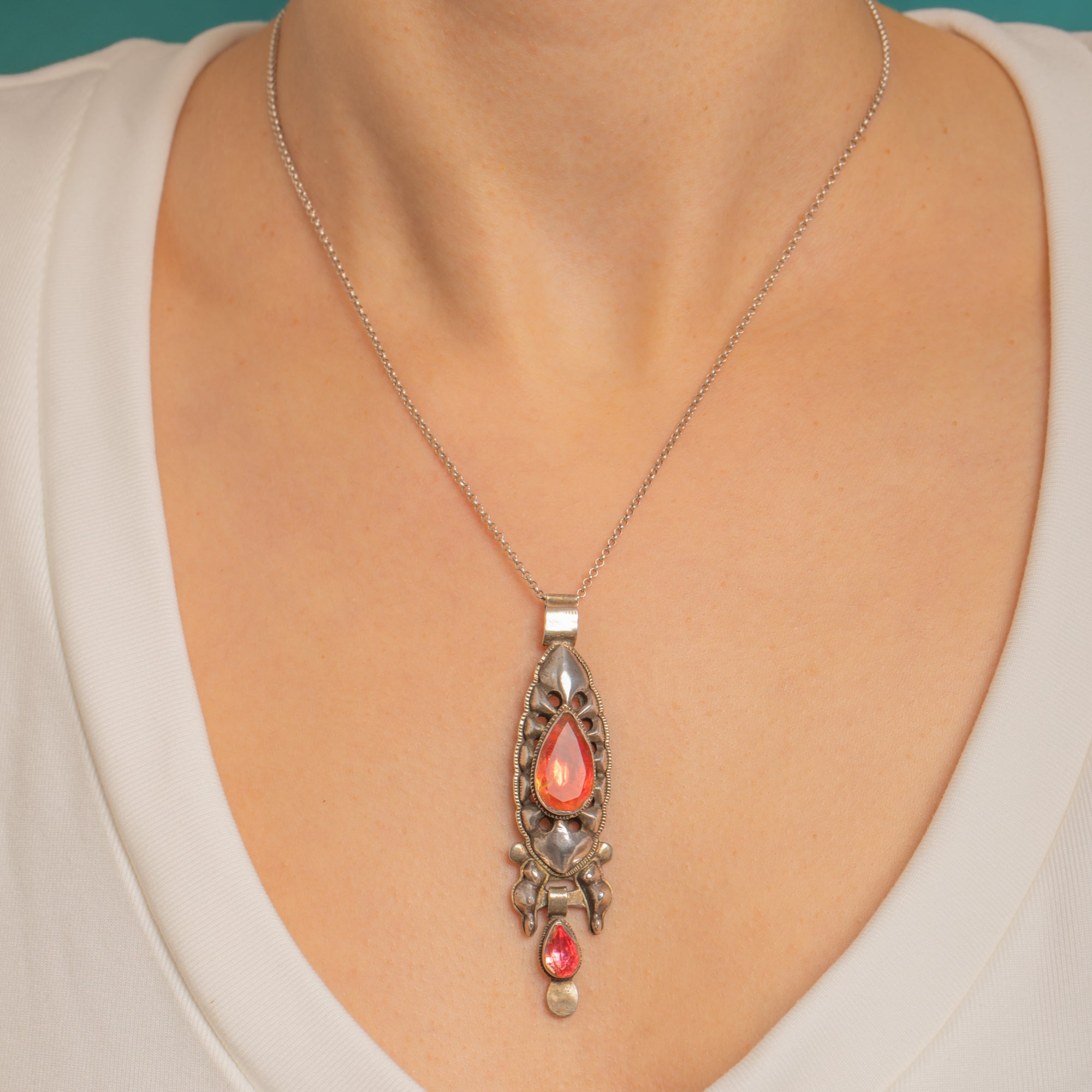 A glorious Iberian Georgian pendant ablaze with two pear-shaped Oil and Vinegar Citrines that glow a vivid reddish-orange. Hand-fabricated in Silver, the elongated form is framed by a rope-twist border and alive with pierced hearts and foliate scrolls, culminating in an articulated teardrop that dances with every movement.