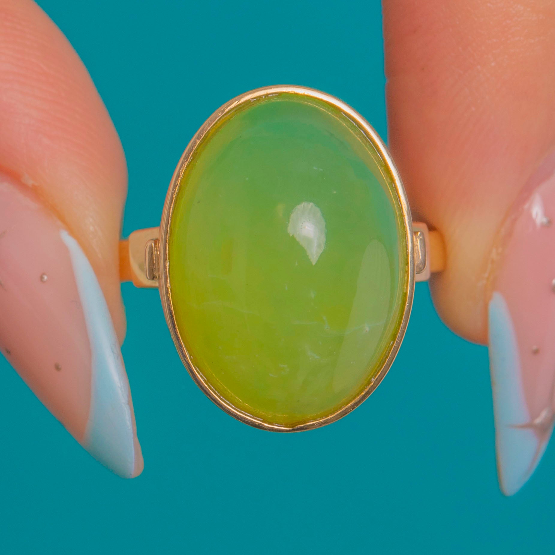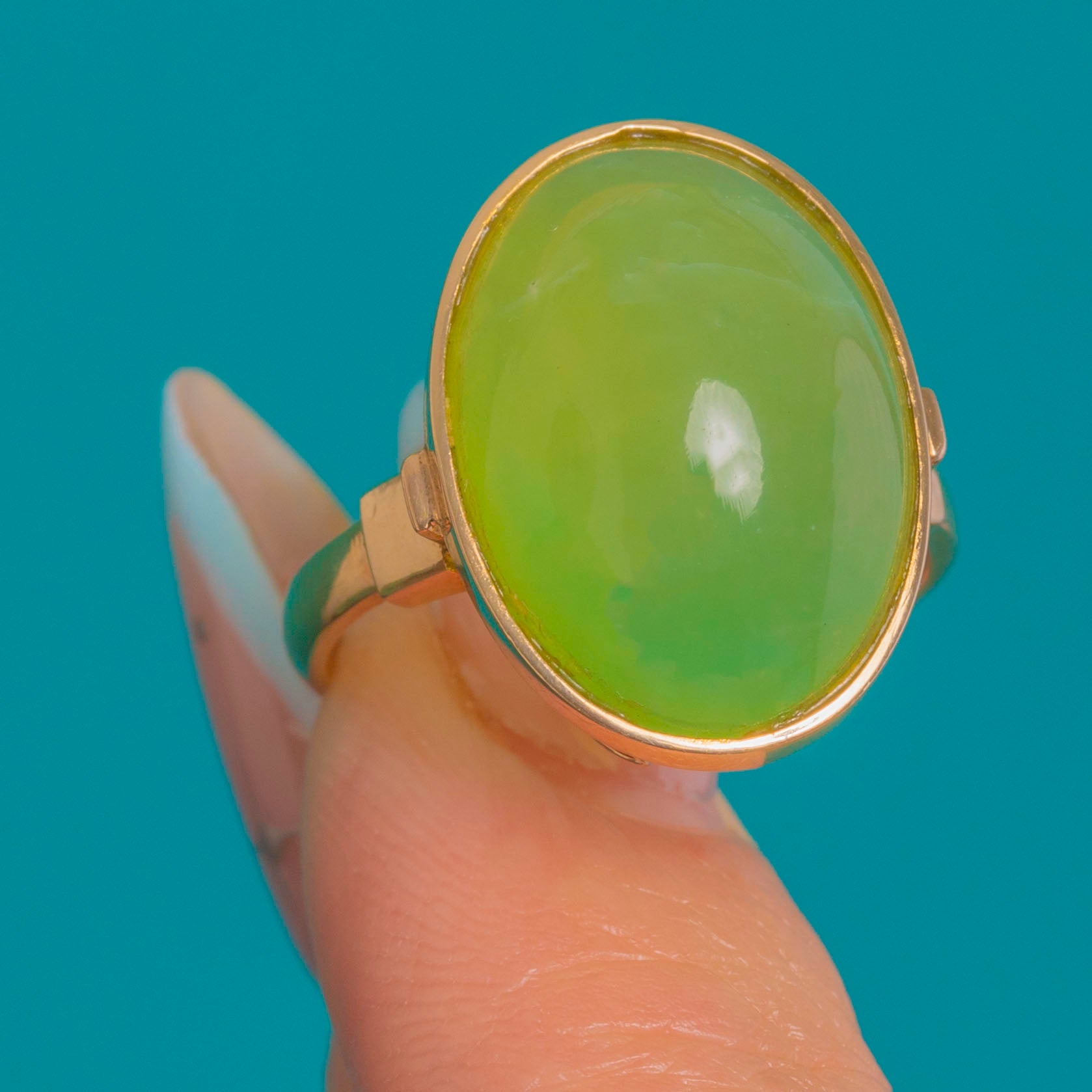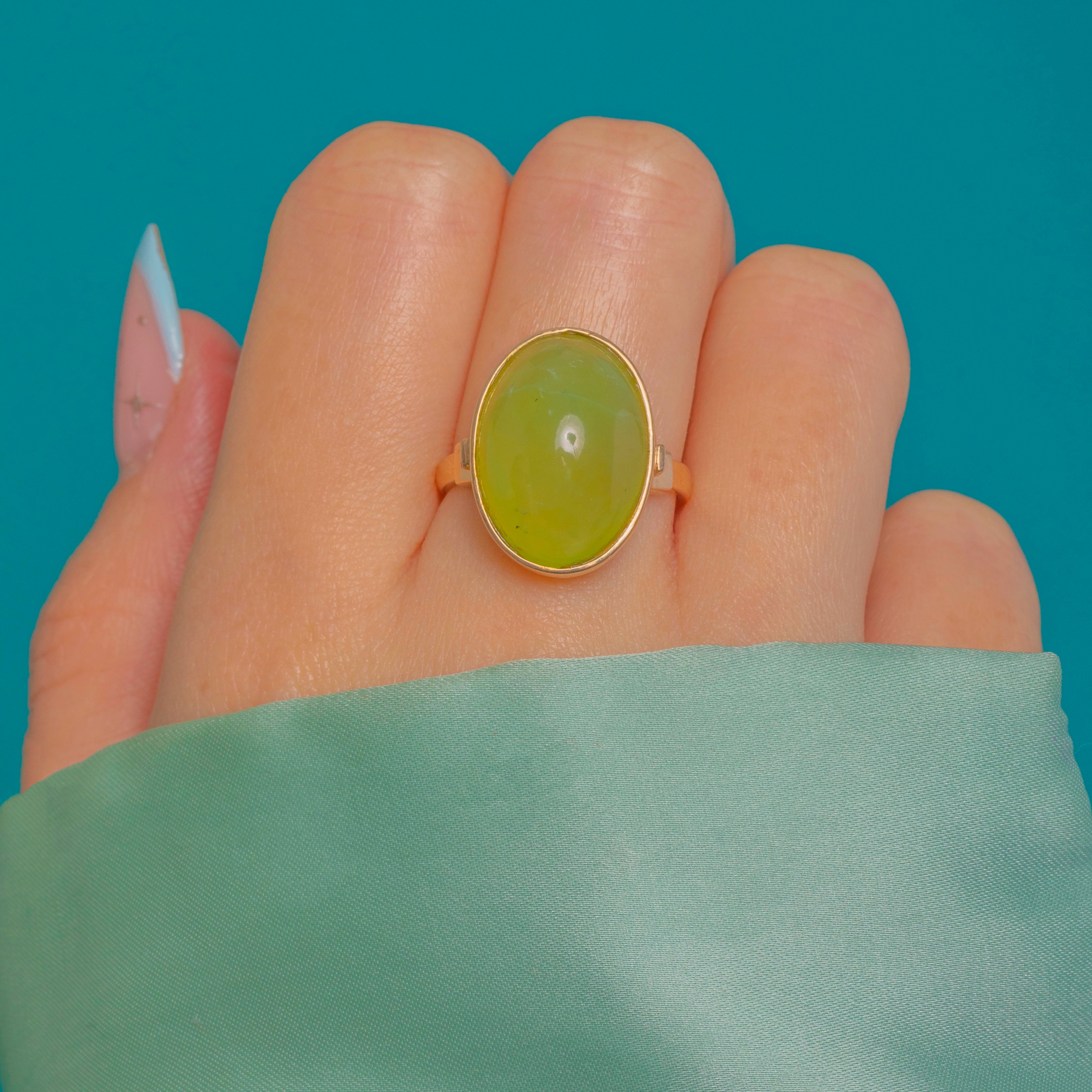 Selbstbewusst und plastisch präsentiert sich dieser Vintage-Chalcedon-Ring mit einem köstlichen apfelgrünen, ovalen Cabochon, gefasst in edlem 14-karätigem Gold. Die glatte Zargenfassung umrahmt die glänzende Kuppel auf ansprechende Weise und lässt das frische, durchscheinende Leuchten des Steins voll zur Geltung kommen.
