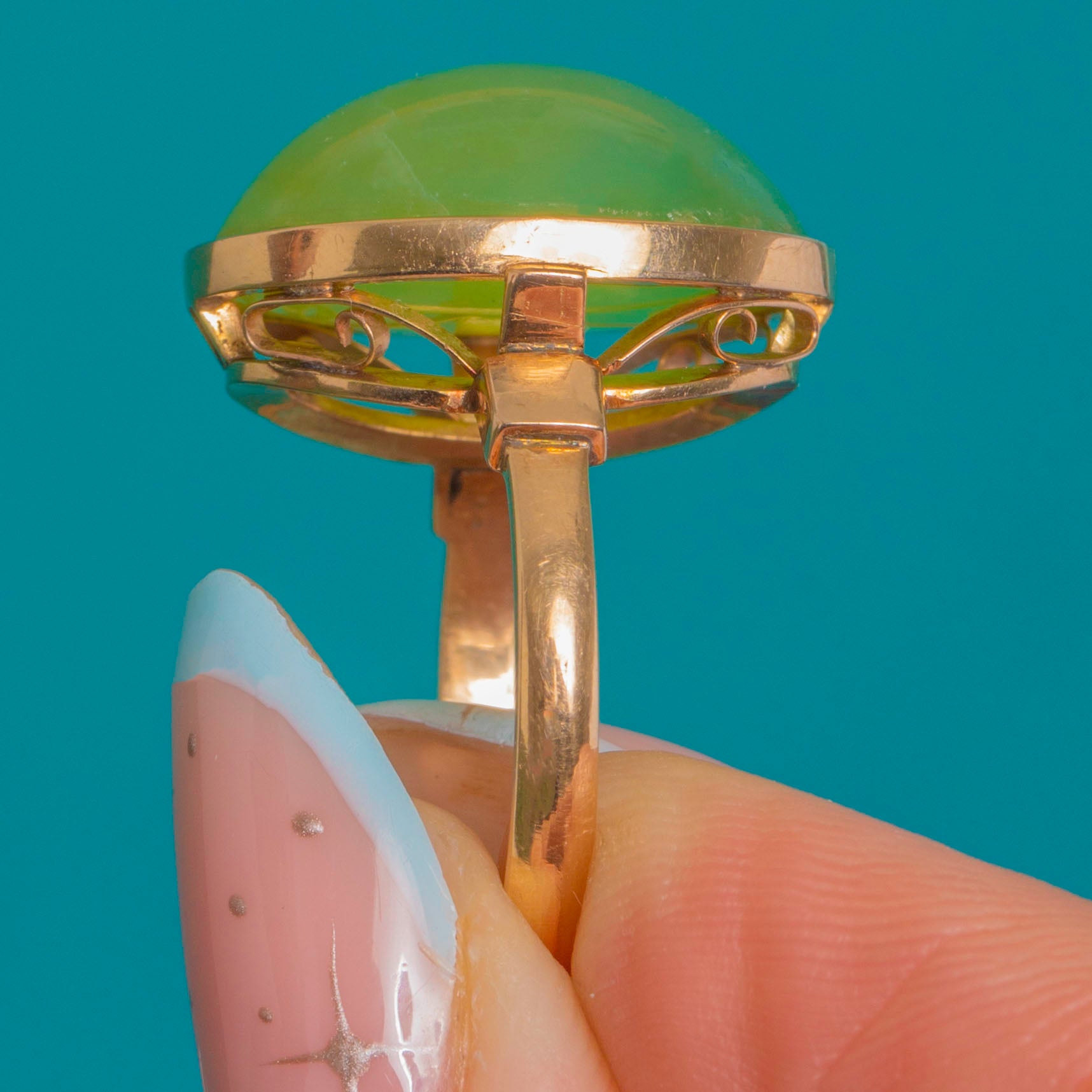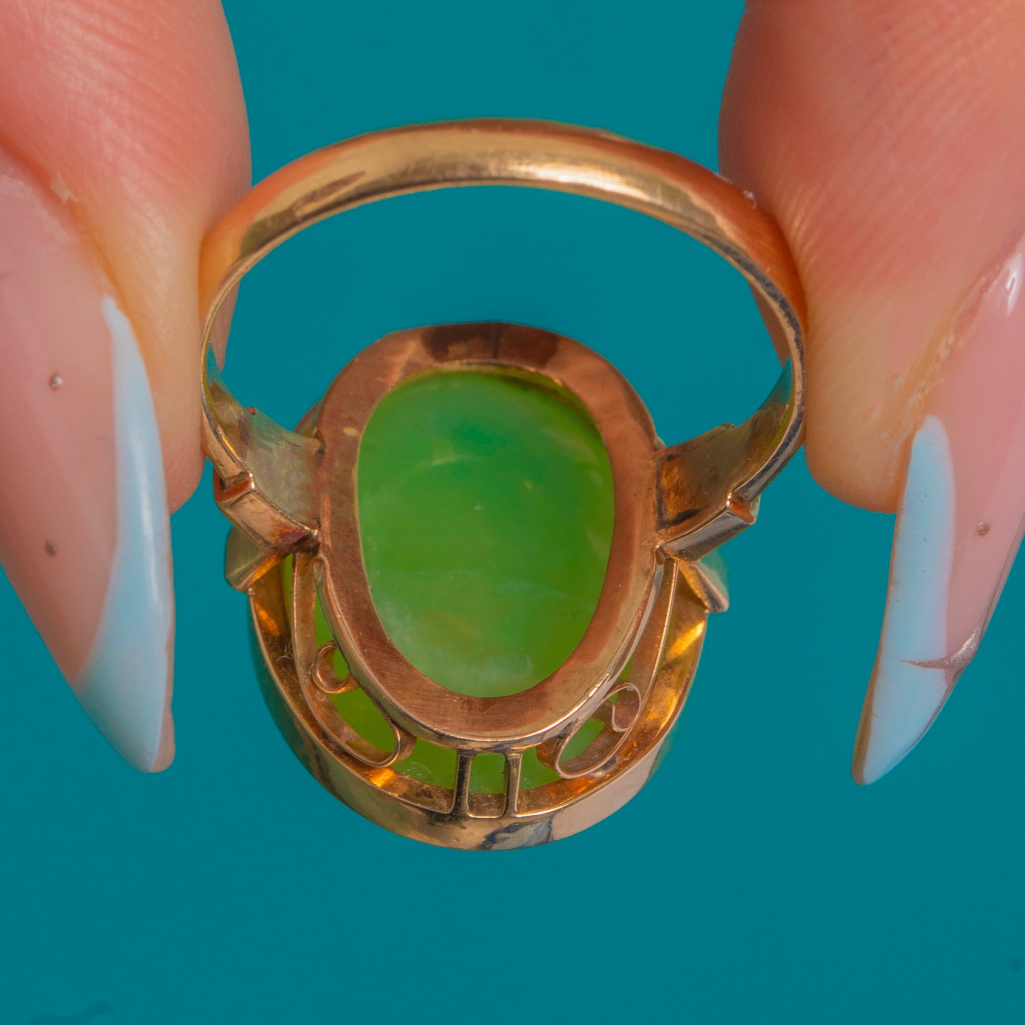 HERVORRAGEND: Der Chalcedon ist leuchtend mit nur leichten Oberflächenkratzern und einer feinen, oberflächlichen Linie, die bei genauer Betrachtung sichtbar ist; keine Absplitterungen oder Risse erkennbar. Die 14-karätige Goldfassung und der Reif sind klar konturiert mit geringfügigen altersgemäßen Gebrauchsspuren und leichten Abrieben an der Zarge, bleiben jedoch stabil und wohlgeformt. Keine sichtbaren Reparaturen oder Hinweise auf eine Größenänderung.