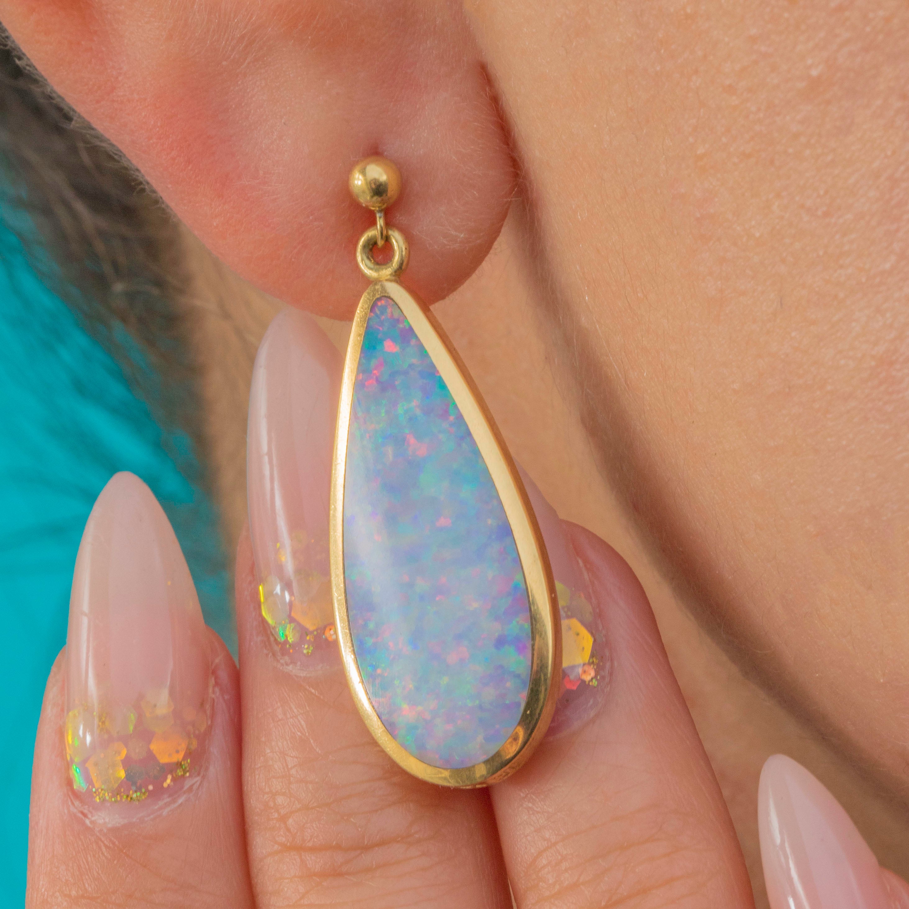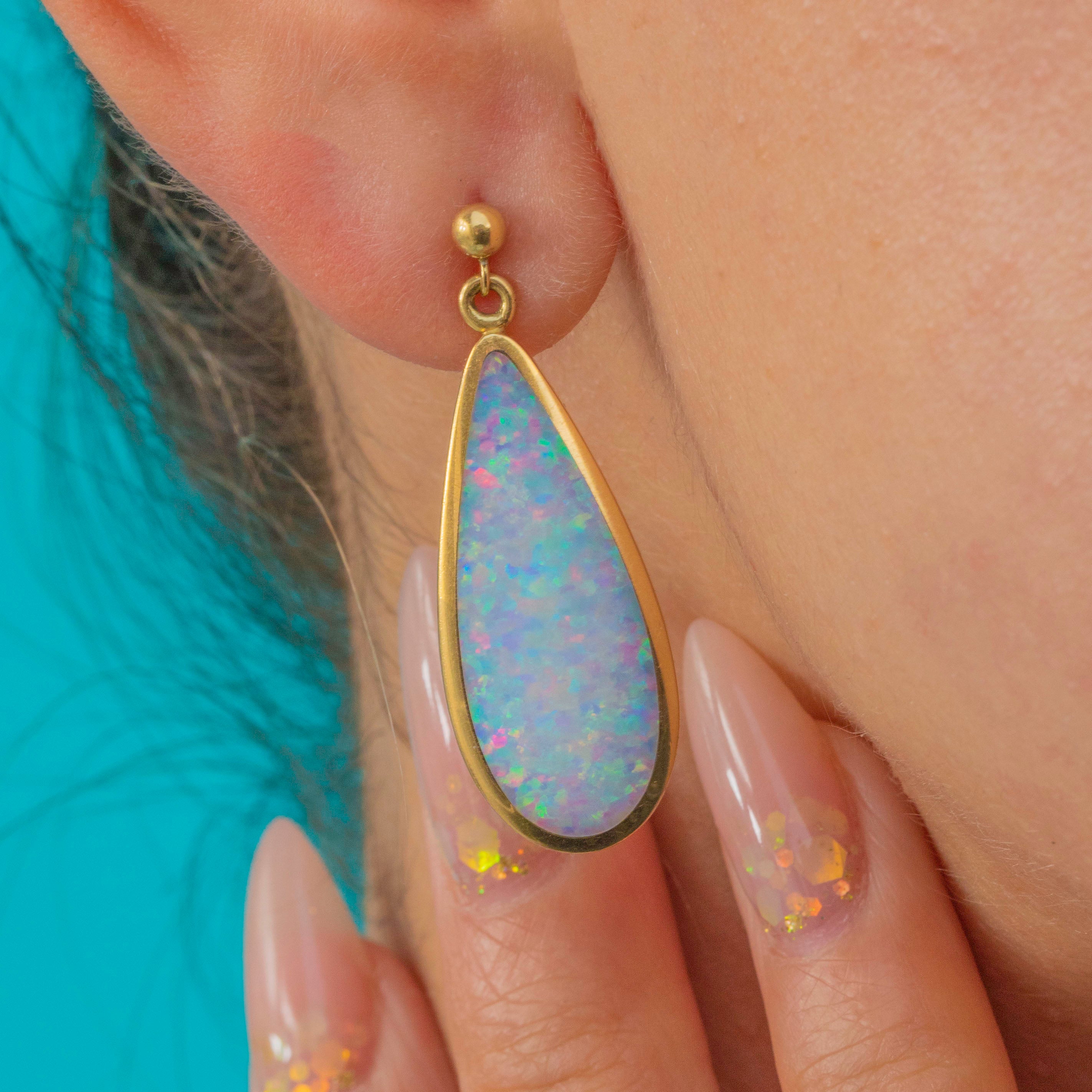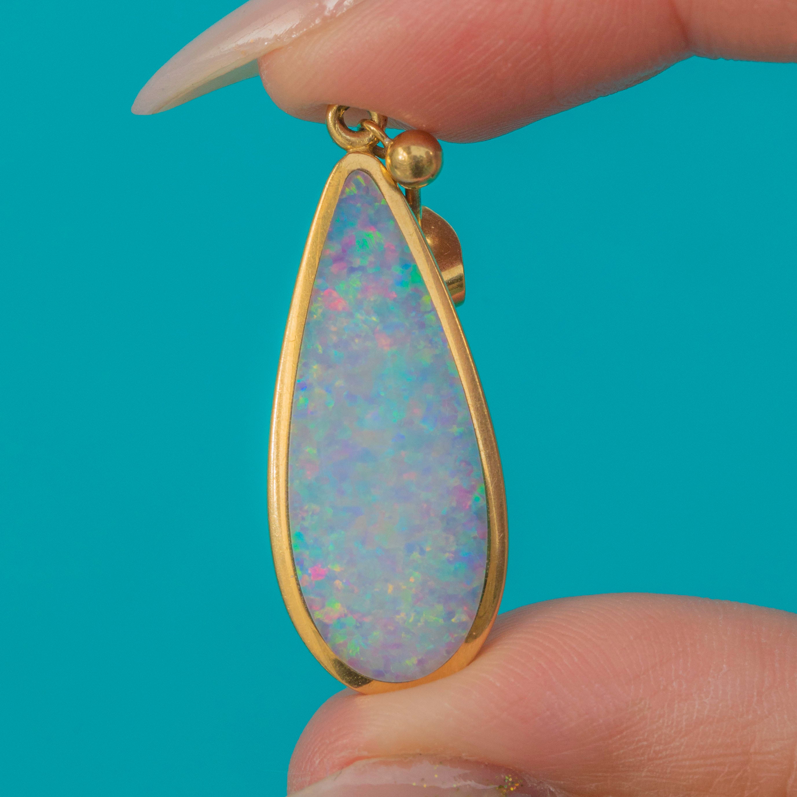 A stunning pair of vintage 18ct Gold teardrop Opal earrings, set with fiery natural solid Opals weighing an impressive 10cts in total. The Opals display a mesmerising play of colour, flashing with vibrant hues of green, orange, blue and pink as they catch the light. Each teardrop stone is mounted in smooth 18ct Gold rubover settings and suspended from matching Opal studs for a striking yet elegant drop.