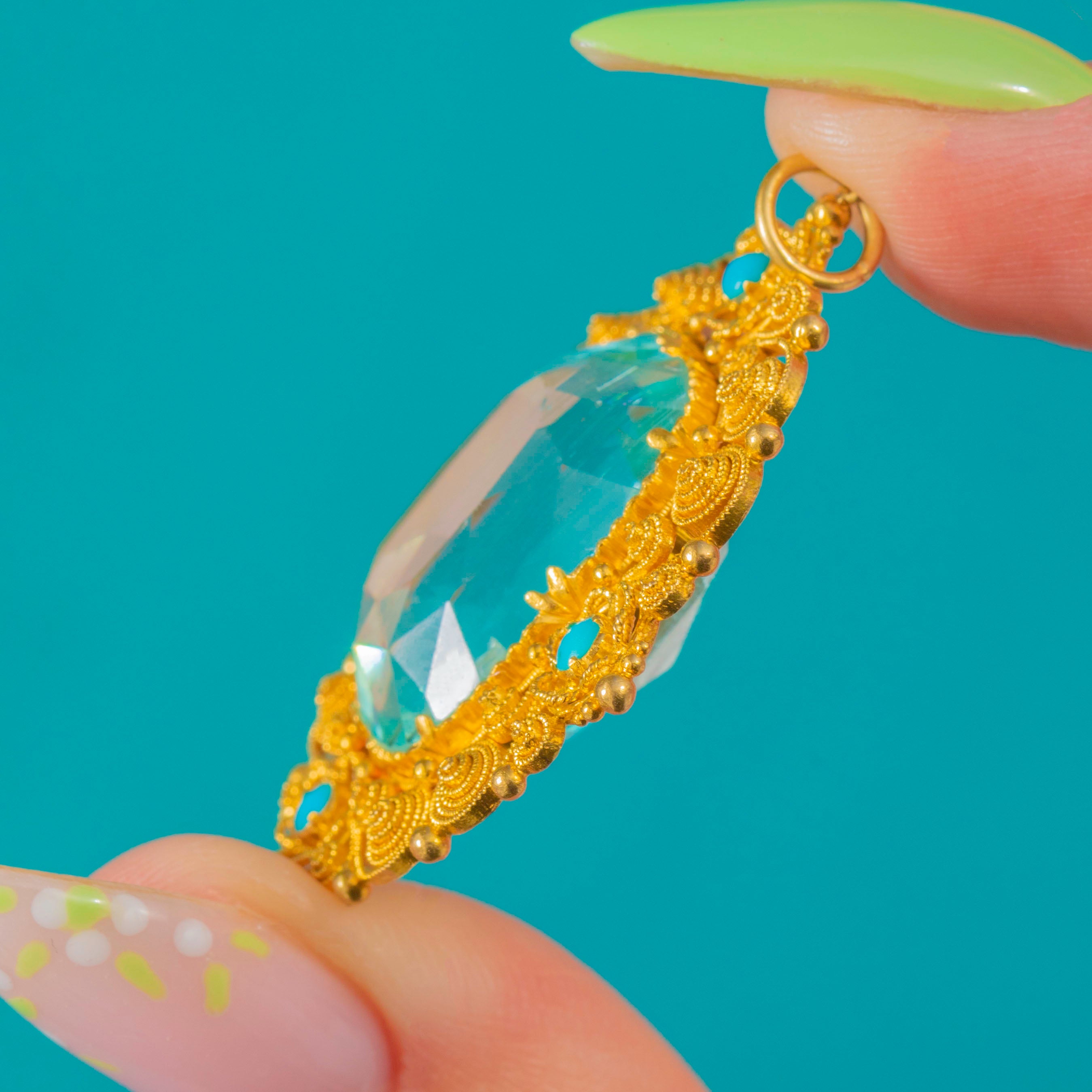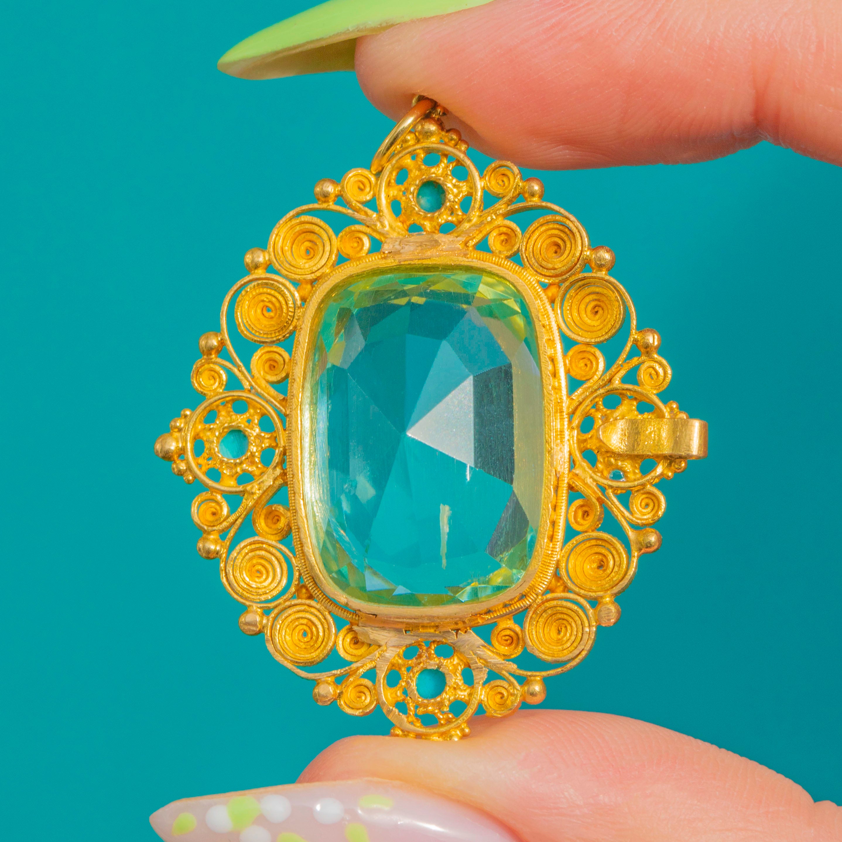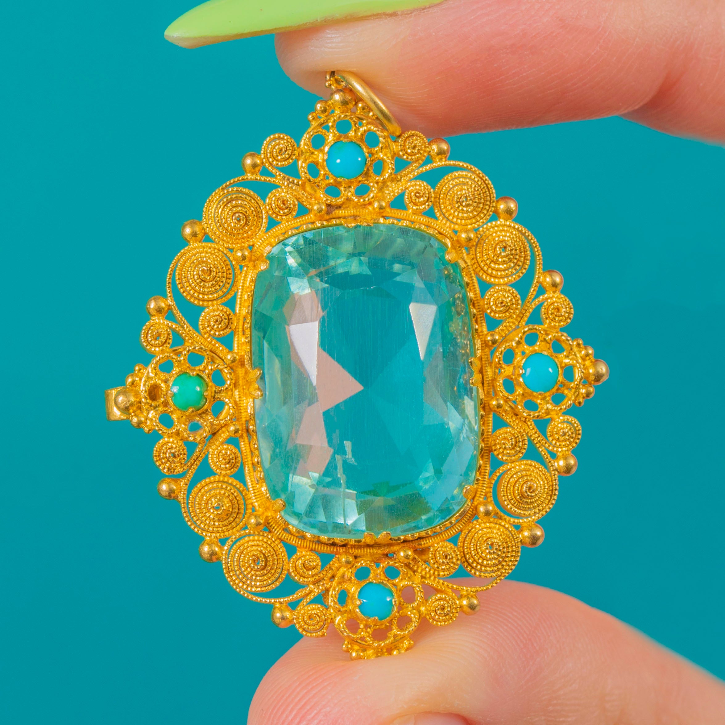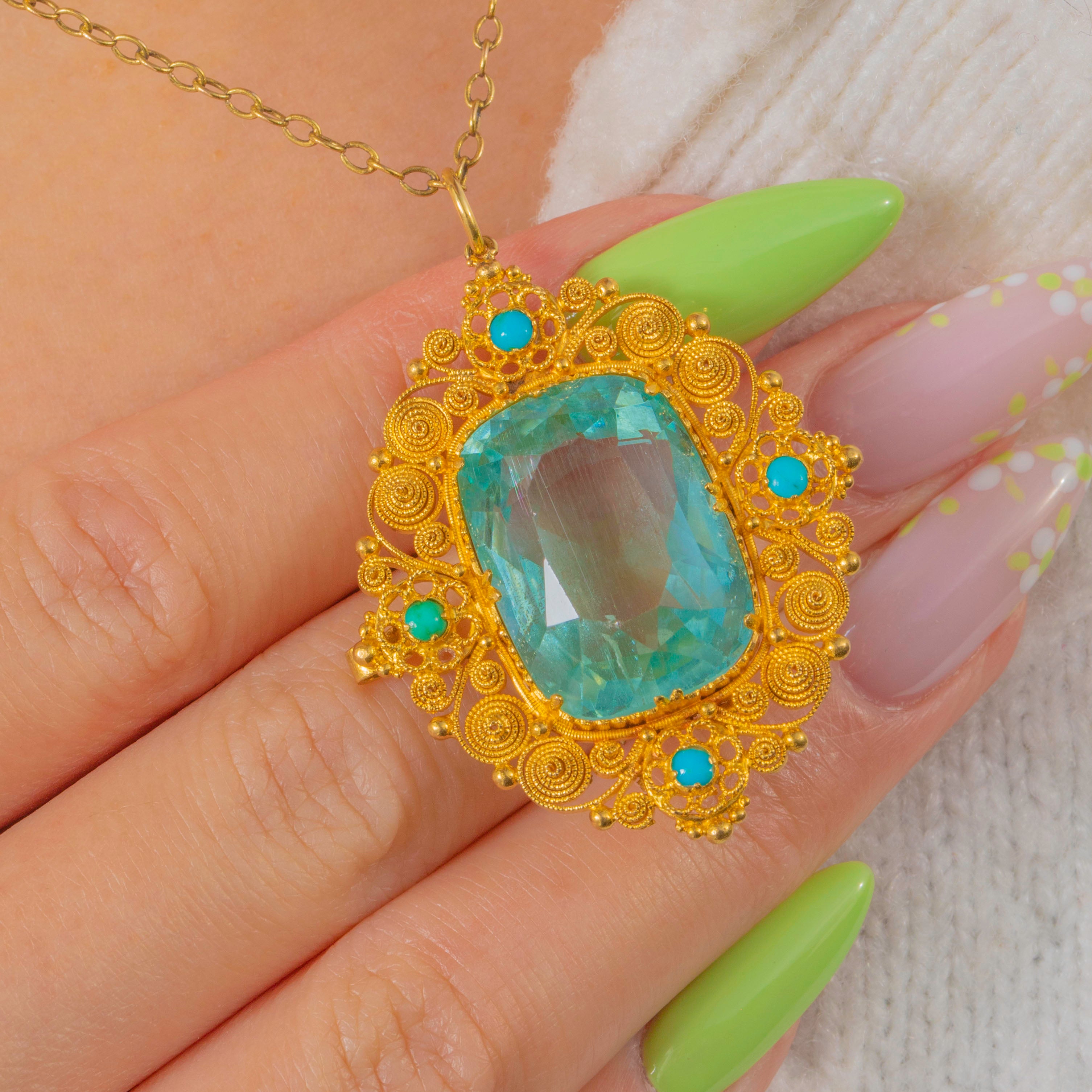 Beeindruckender Georgian Anhänger aus 18ct Gold mit Aquamarin, Türkis und Cannetille, 16,80ct Aquamarin