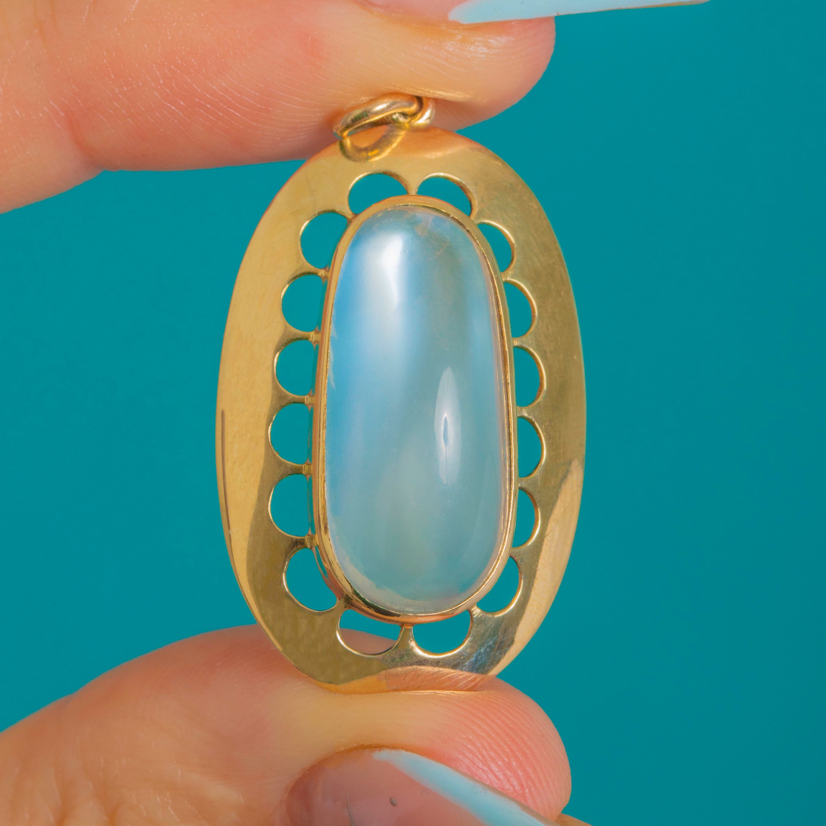 Glowing with ethereal blue light, this Edwardian 9ct Gold pendant centres a sumptuous high-domed Moonstone of approximately 16.20 carats. The oval cabochon is framed by an elegant pierced oval plaque, its evenly spaced petal-like openings lending air and light to the design while drawing the eye to the gem’s soft adularescence.