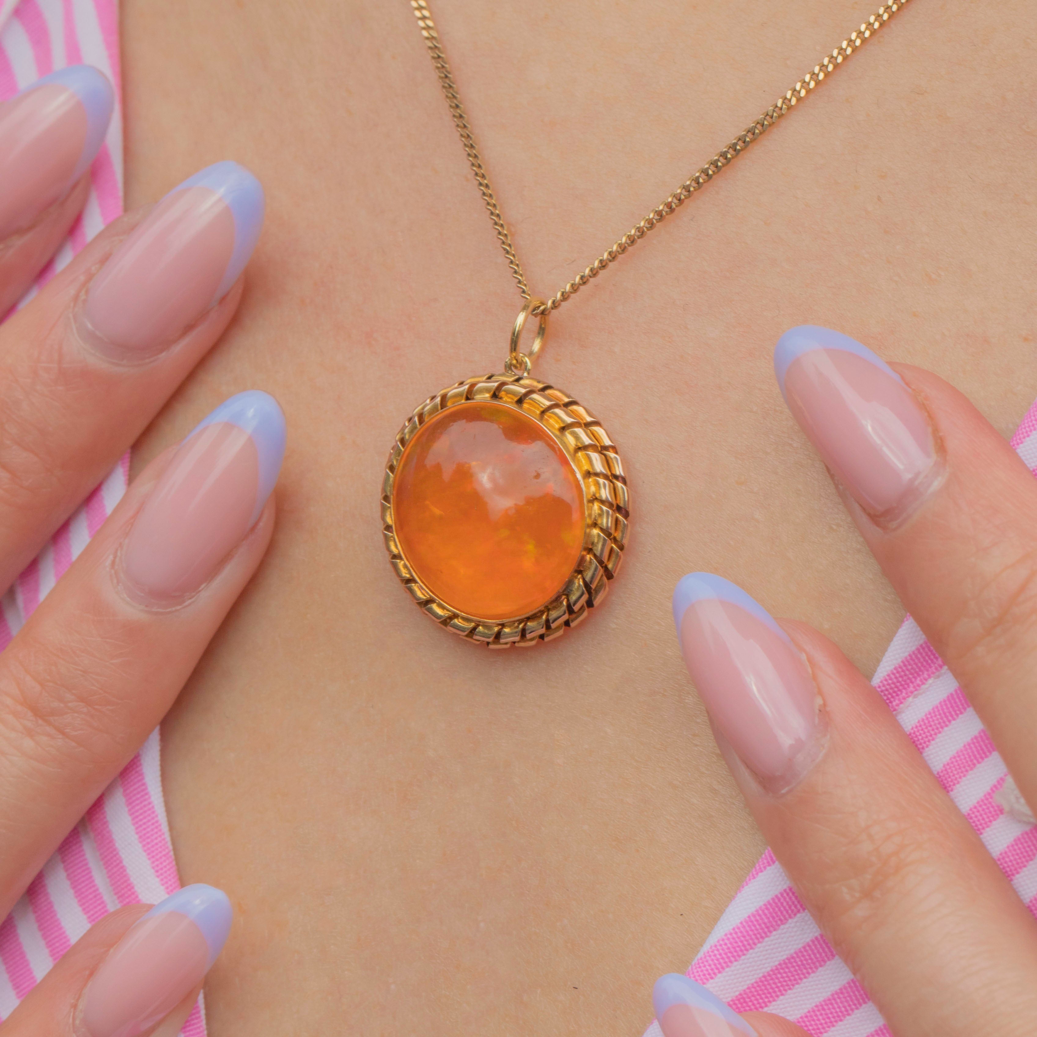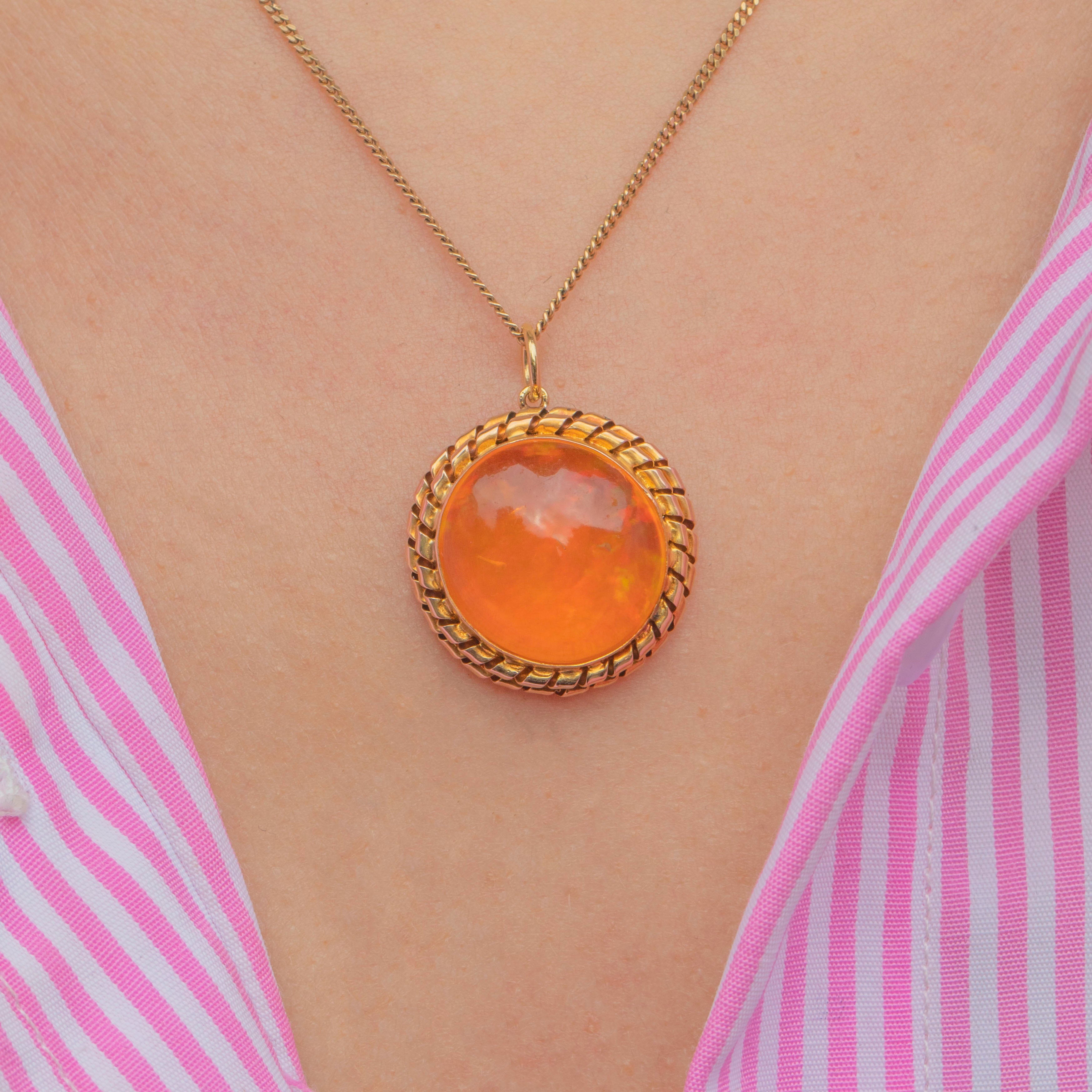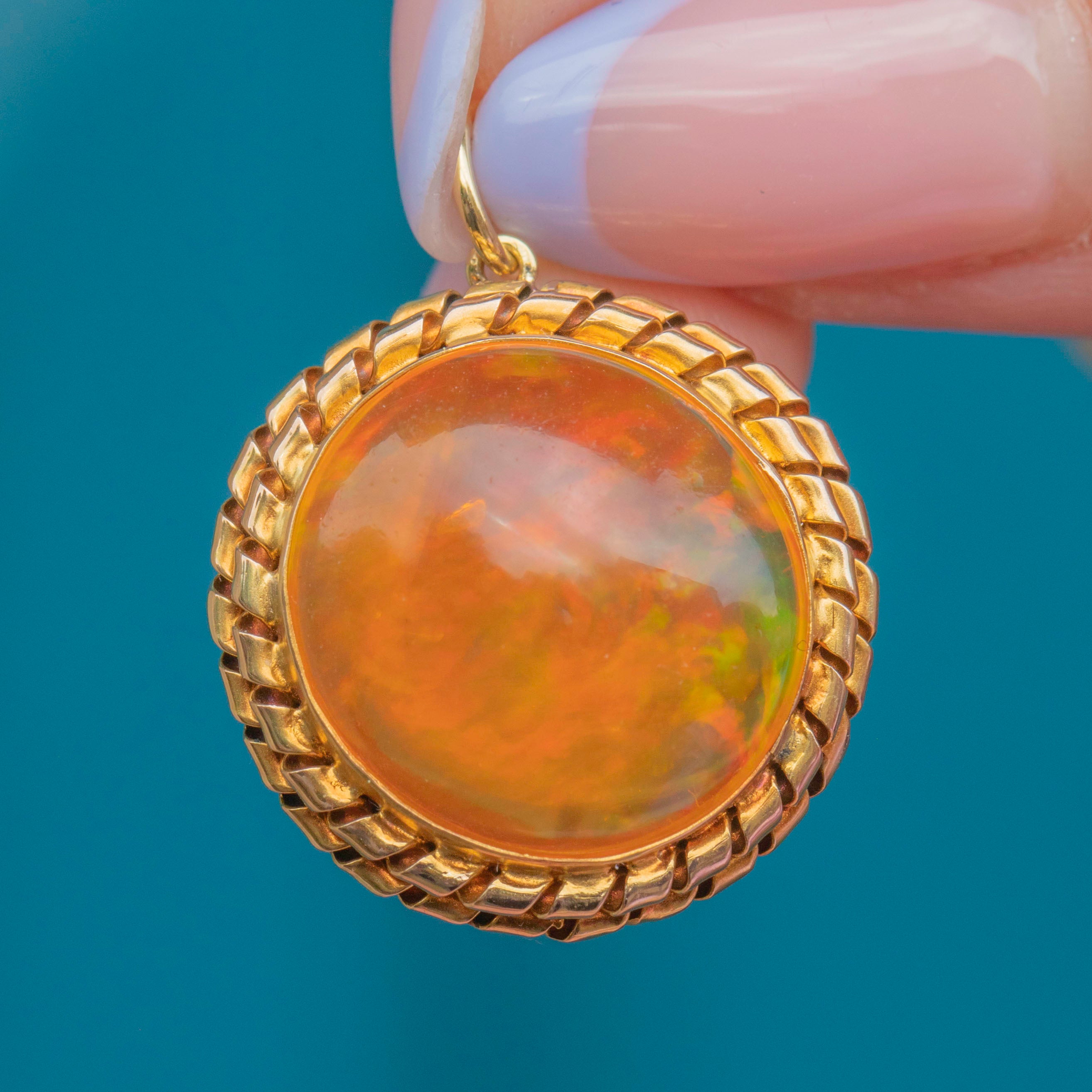 VERY GOOD: This large antique 18ct Gold Fire Opal pendant is in very good condition. The Opal has a magnificent vibrancy and a sought-after flash. The Opal is smooth for the most part, with only a couple of small fleabites noticeable under close inspection. The Opal is secure within its bezel setting, and the Gold coils have held their form well. The Gold has an even saturation throughout, and the back of the pendant is perfectly smooth, sitting comfortably against the chest.