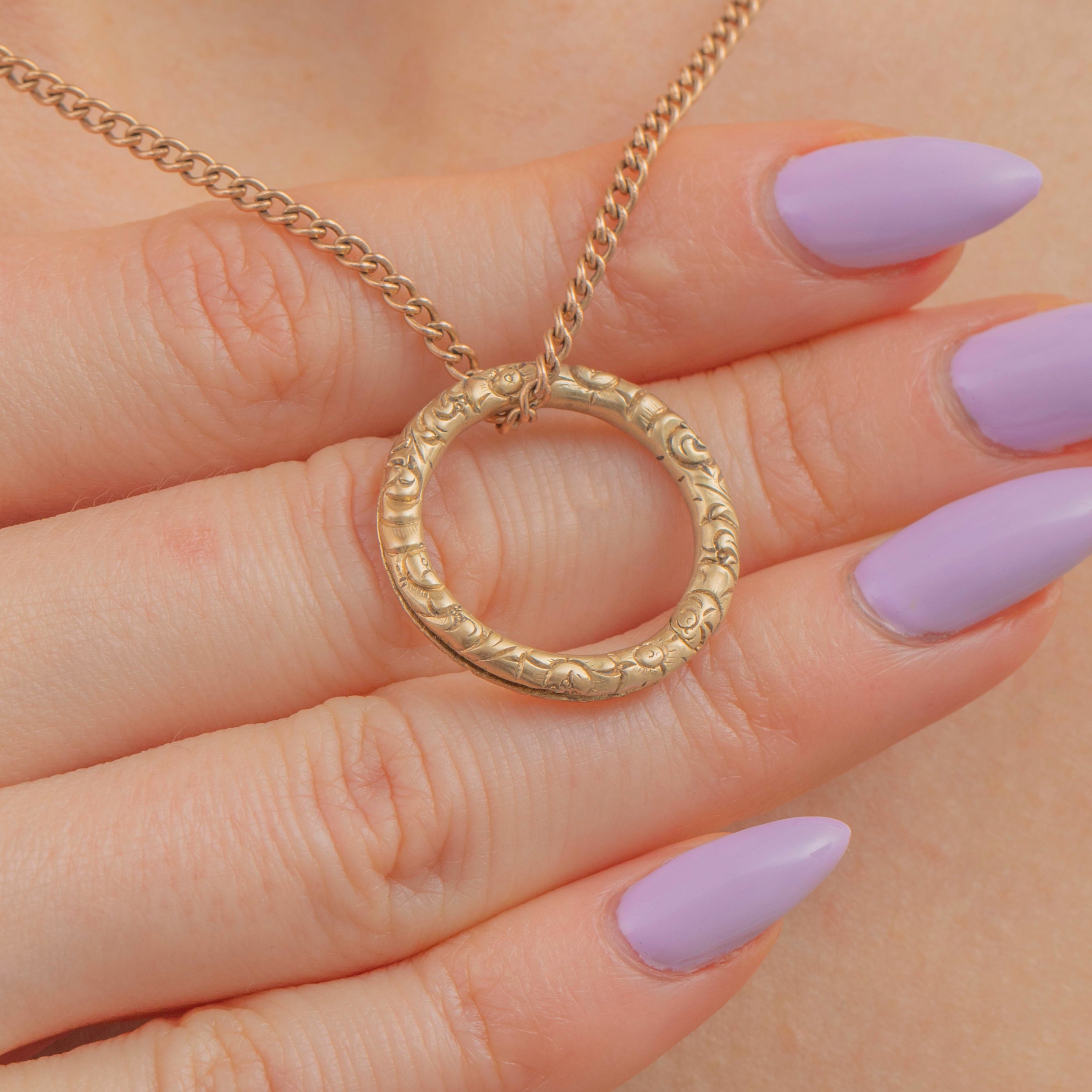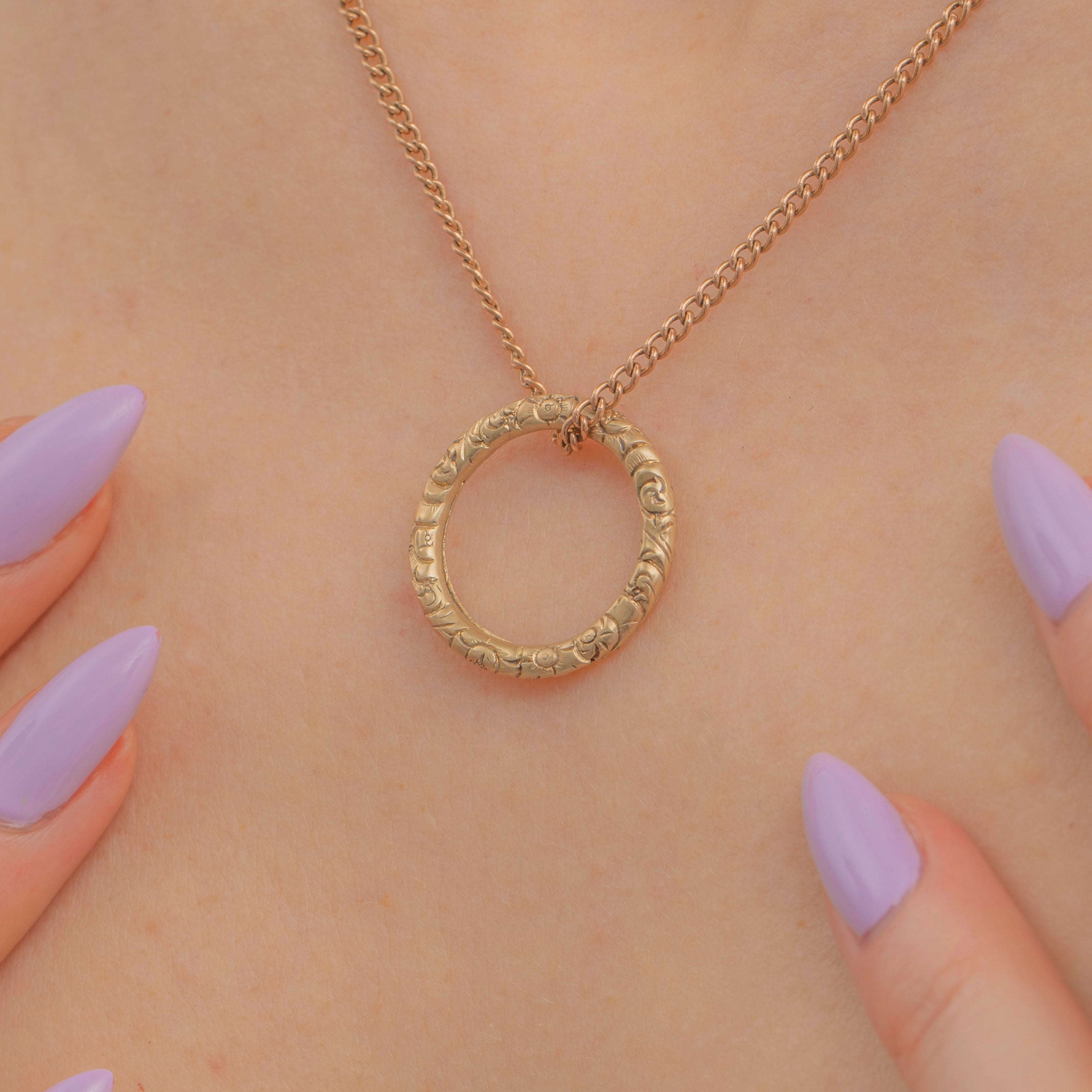 Add a sweet collectible to your jewellery collection with this Georgian 15ct Gold engraved split ring! With a generous 22mm diameter, this split ring allows a fob, pendant, or multiple charms to be suspended from her.
