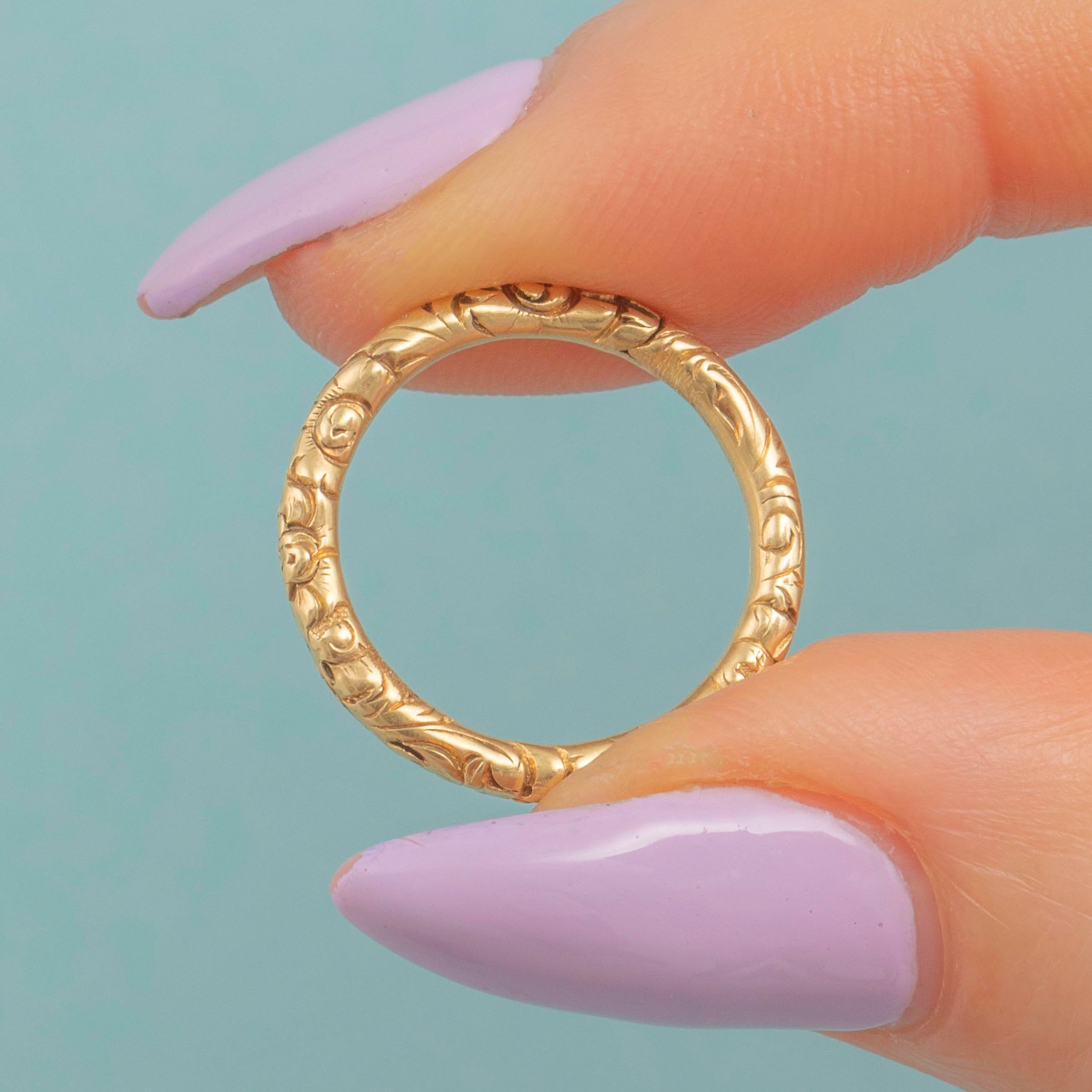 EXCELLENT. This late Georgian 15ct Gold engraved split ring is in fabulous condition! Her engravings catch the light beautifully, and she is a great size to add either one singular piece or a few small charms. The Gold has a lovely saturation and will make a luxurious addition to your collection!