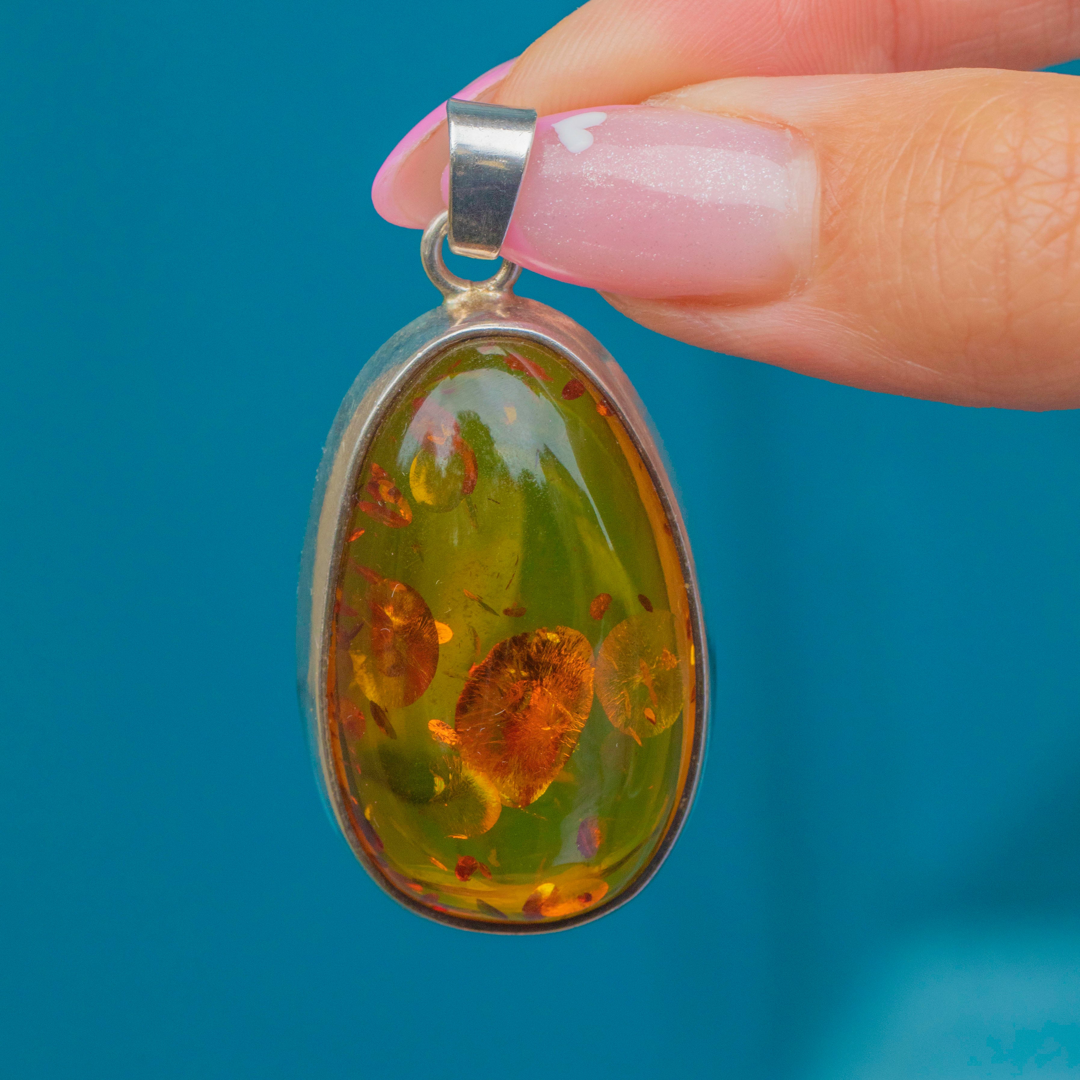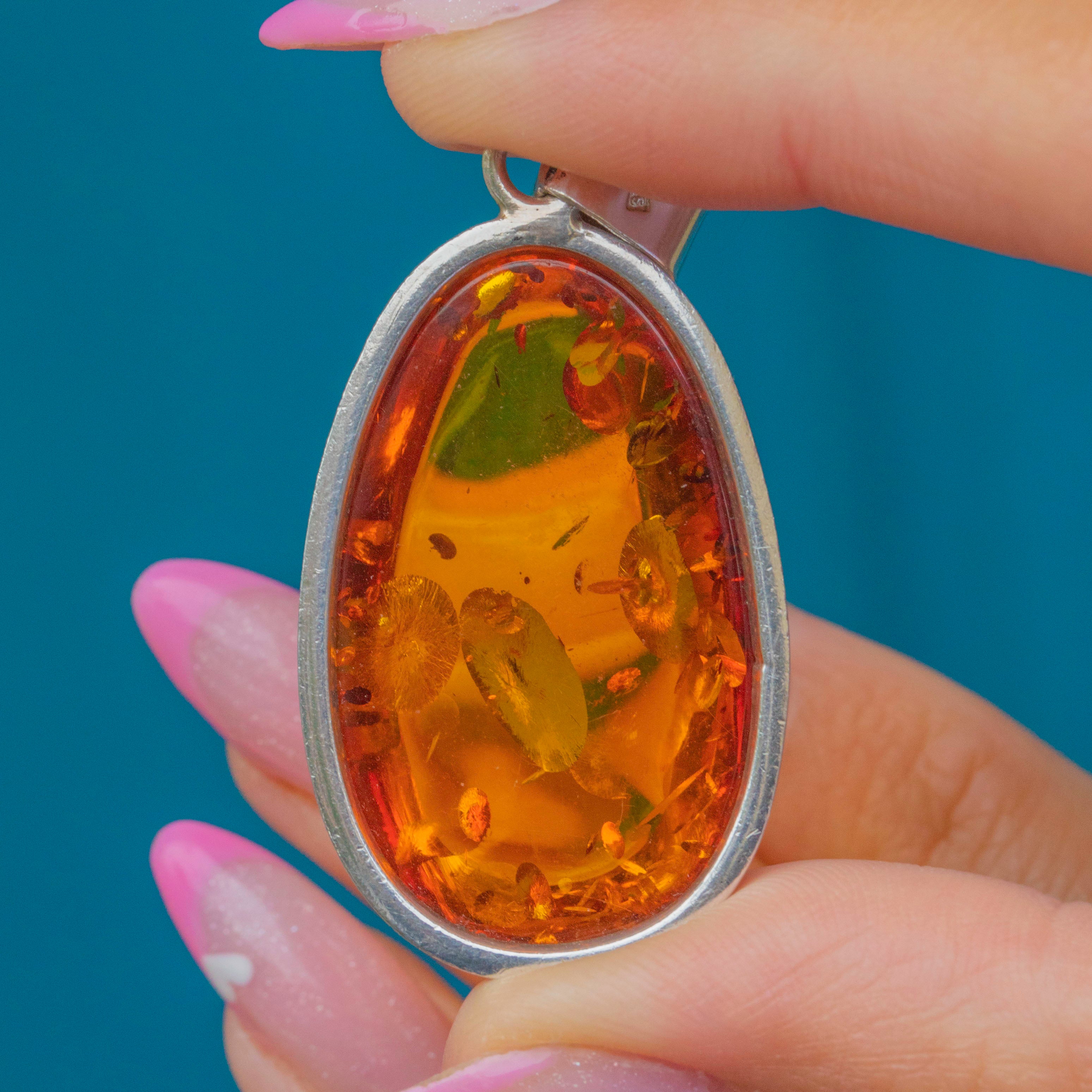 This striking pendant showcases a large piece of natural Baltic Amber, beautifully flecked with golden inclusions that catch the light from every angle. The stone’s organic warmth contrasts perfectly with its cool Sterling Silver setting, creating a statement piece full of natural charm.