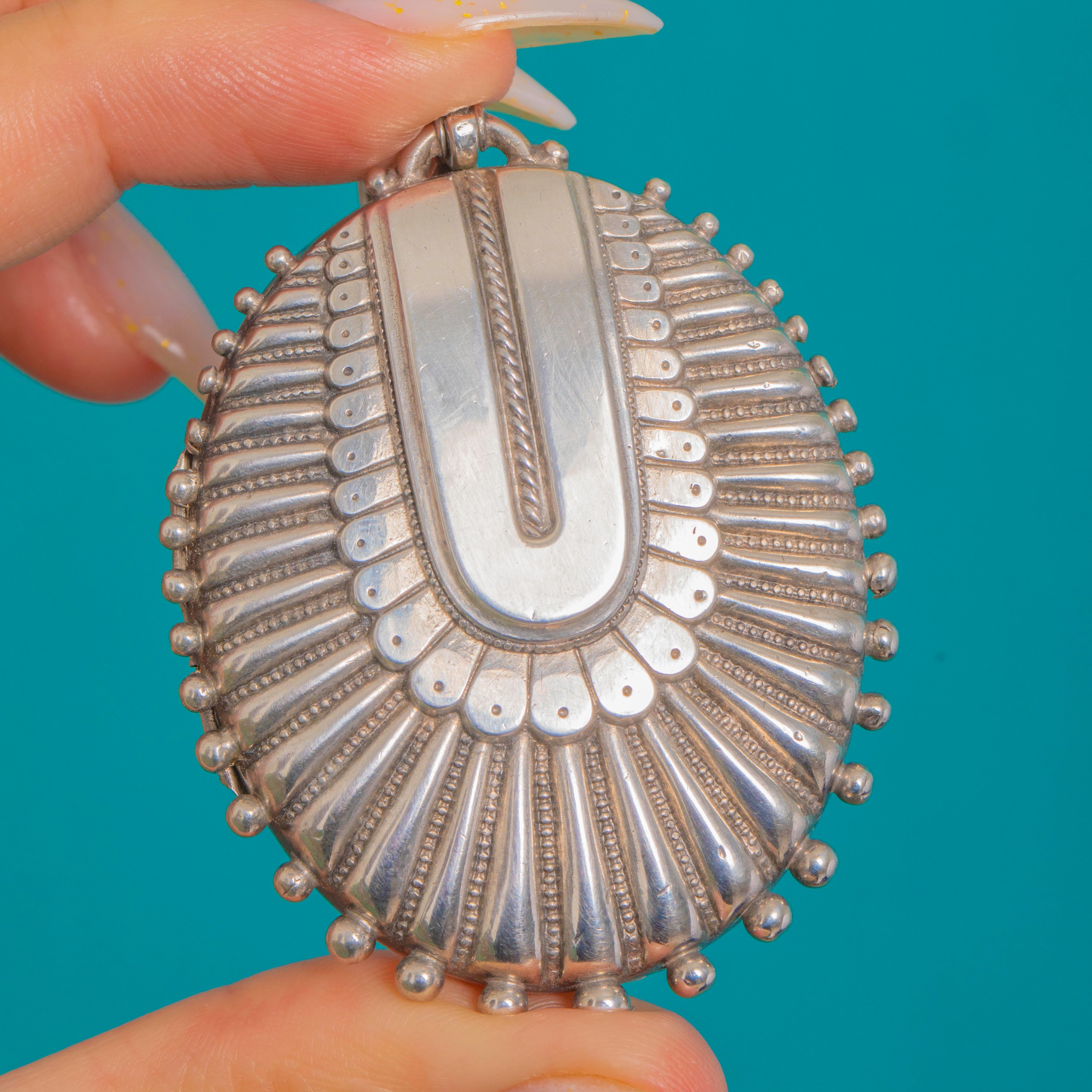 A bold and beautifully tactile Victorian locket, made in the Aesthetic era and decorated with crisp, architectural embossing. The front is all about texture and shine, with radiating panels and a beaded edge that catches the light from every angle.