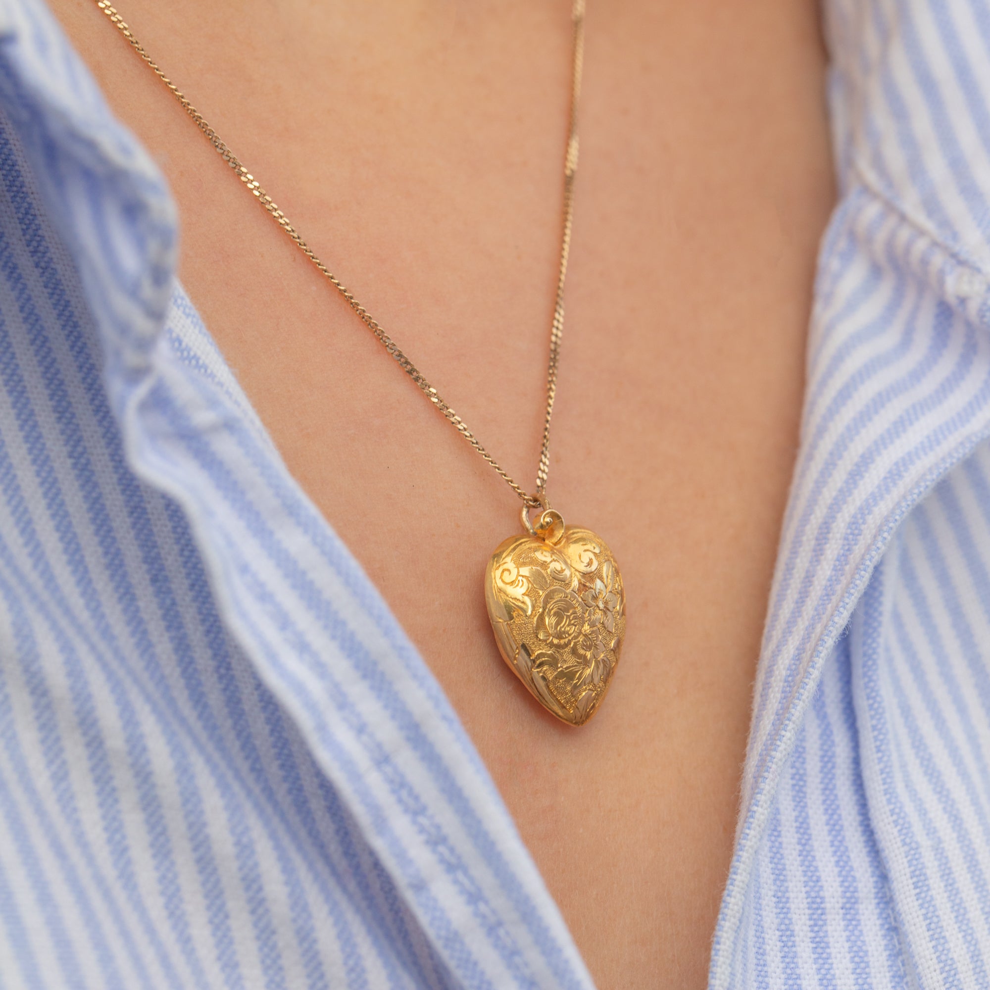 This exquisite Late-Georgian heart locket is crafted in glowing 18ct Gold and finely engraved with elegant foliate motifs. A touching sentimental keepsake, it retains its original glass panel on the reverse, which still encloses a carefully arranged lock of hair, a deeply personal memento of love and remembrance from the Georgian era.