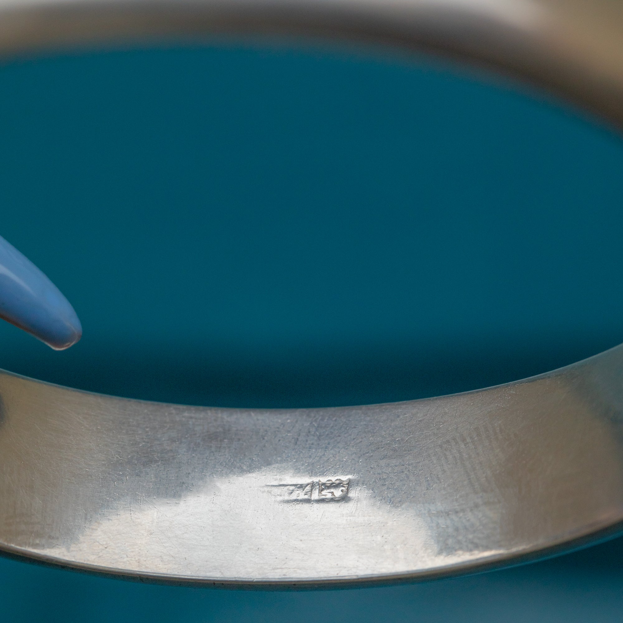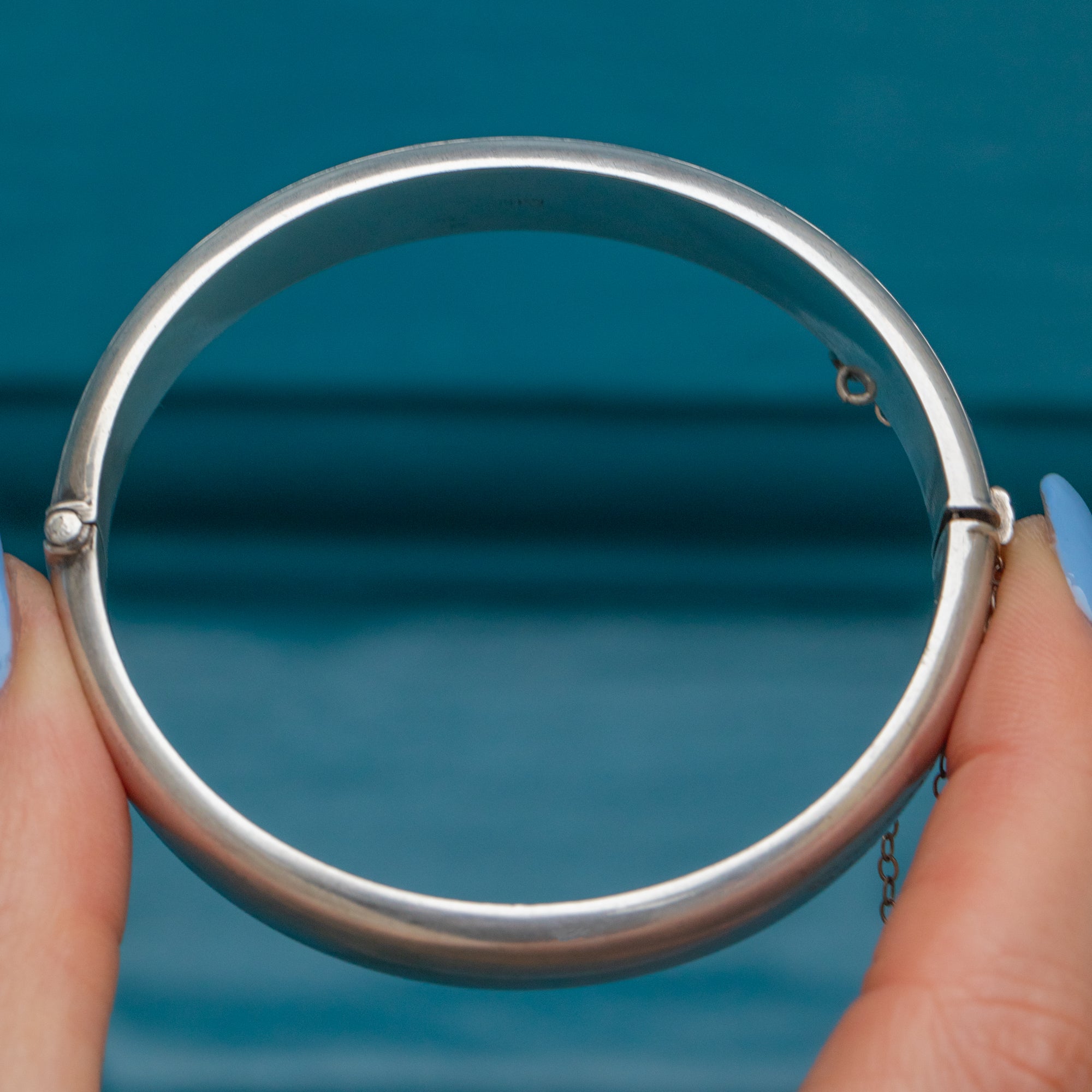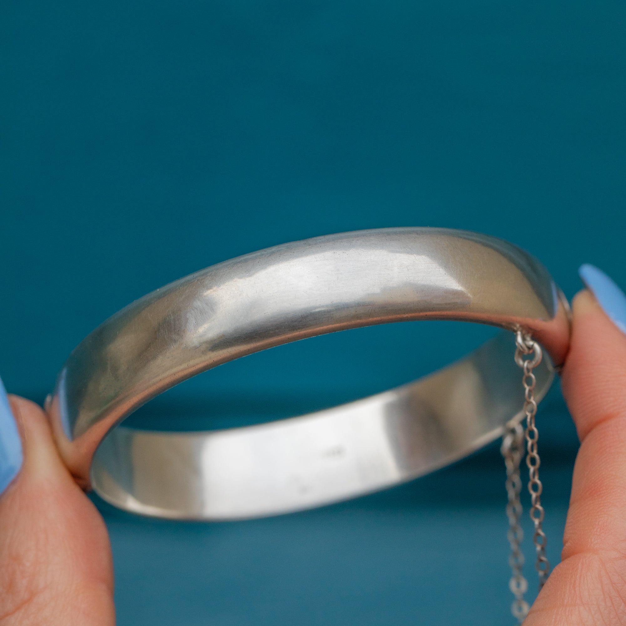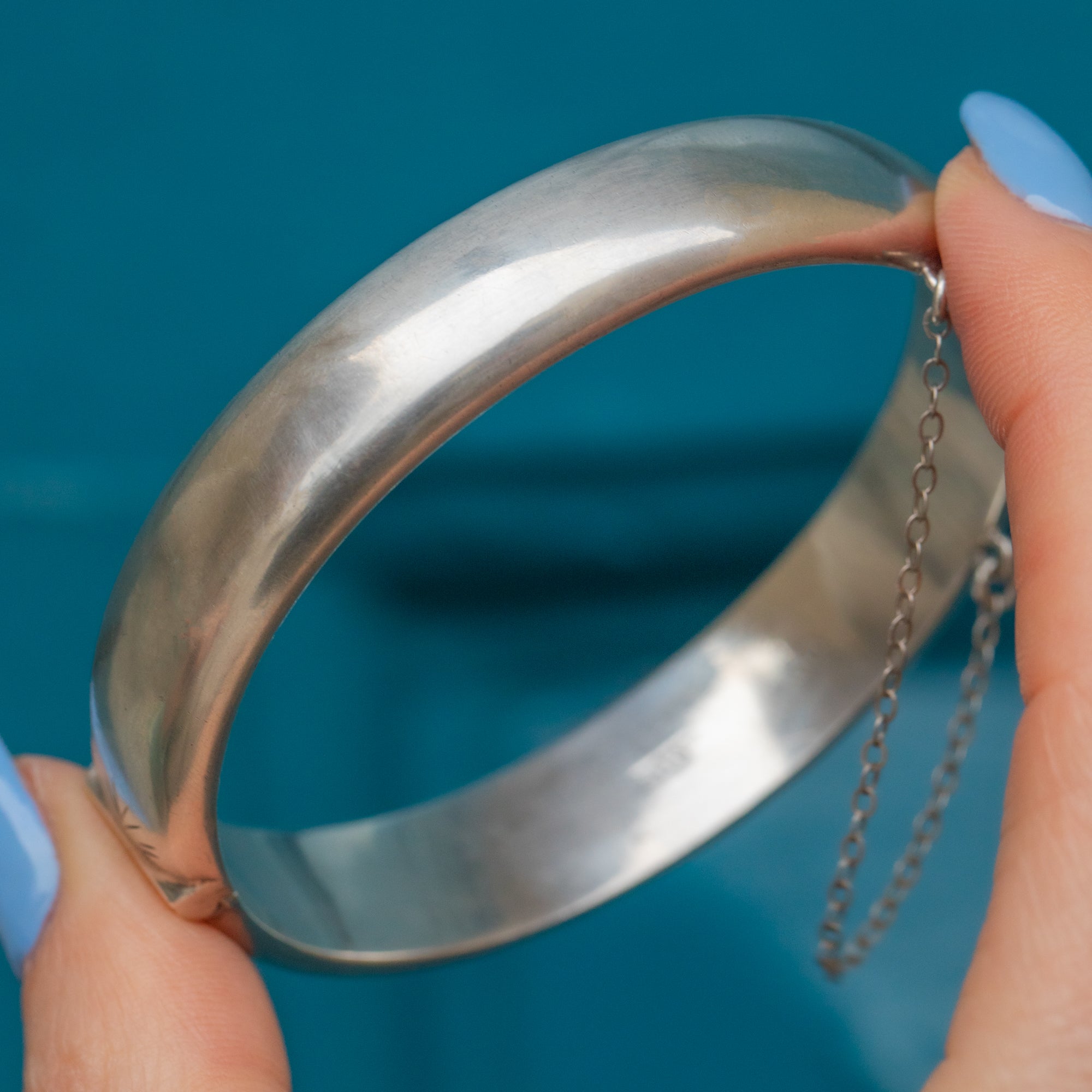 VERY GOOD-EXCELLENT. This Mid-Century Silver engraved bangle is in wonderful condition.  This Silver is bright and the engraved details are crisp. The inside of the bangle has a small scratch and some subtle surface wear, with the hallmarks obscured on one side, however, externally she is in tip-top form! With a safety chain for an extra layer of security and a functioning tongue clasp, you can wear this Vintage beauty with pride!