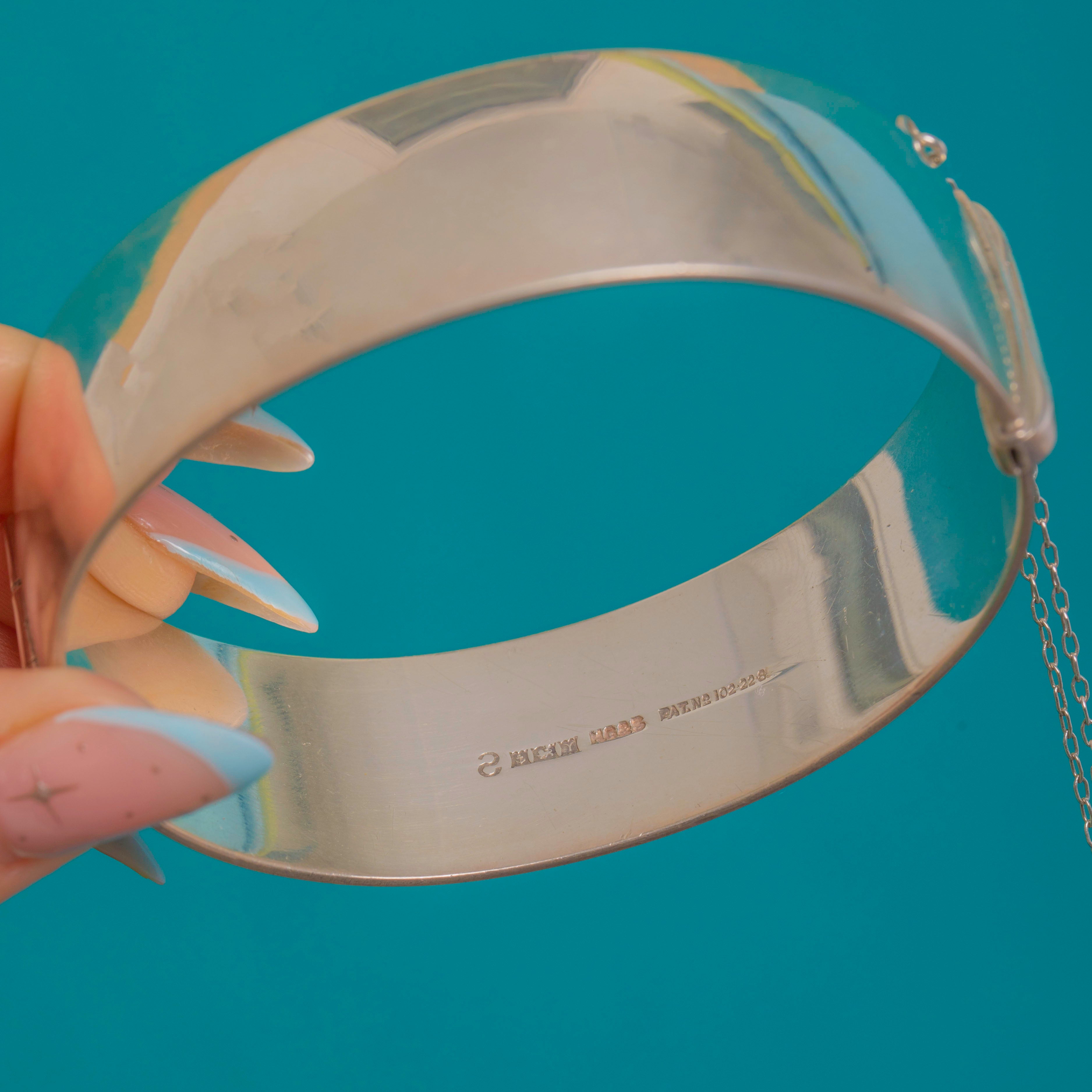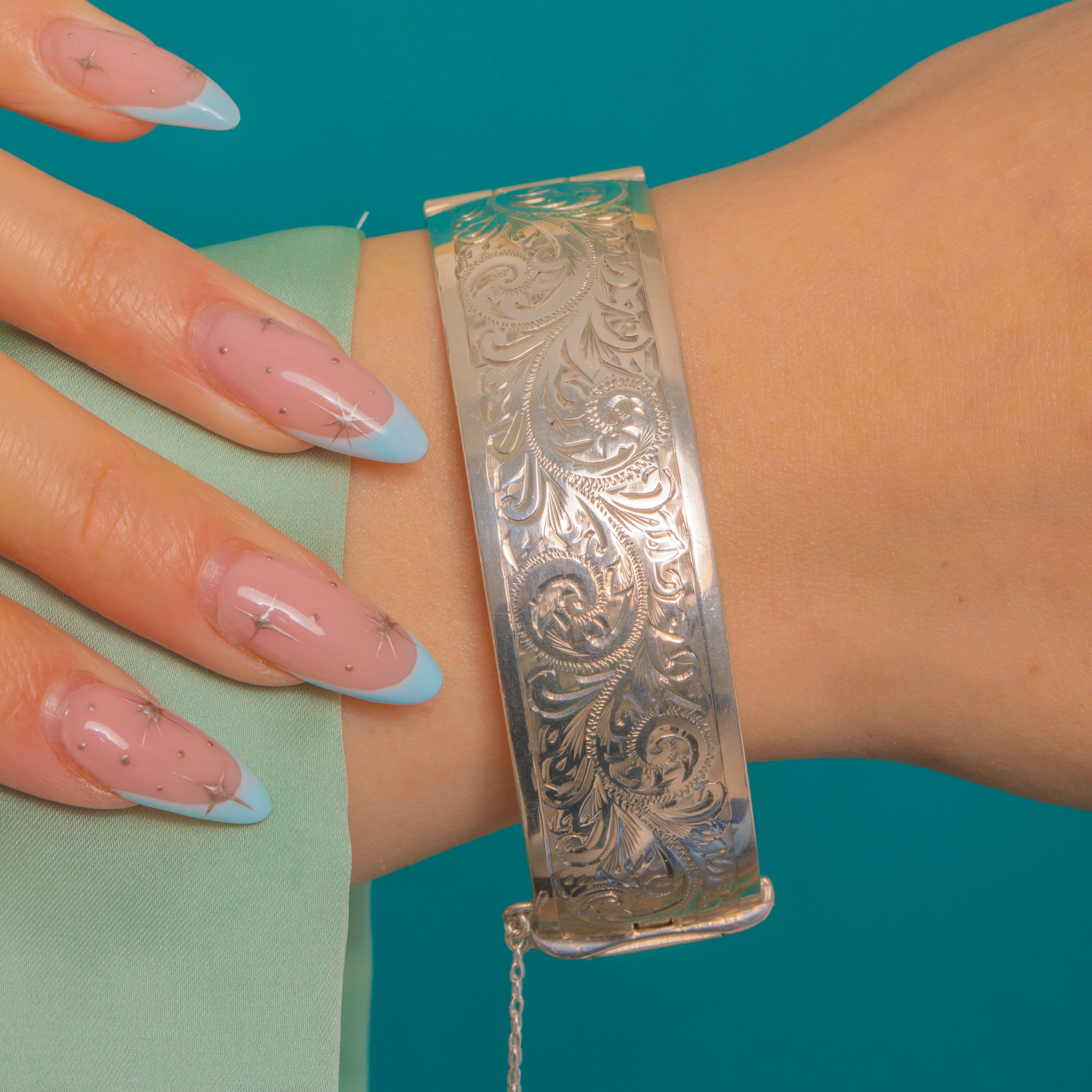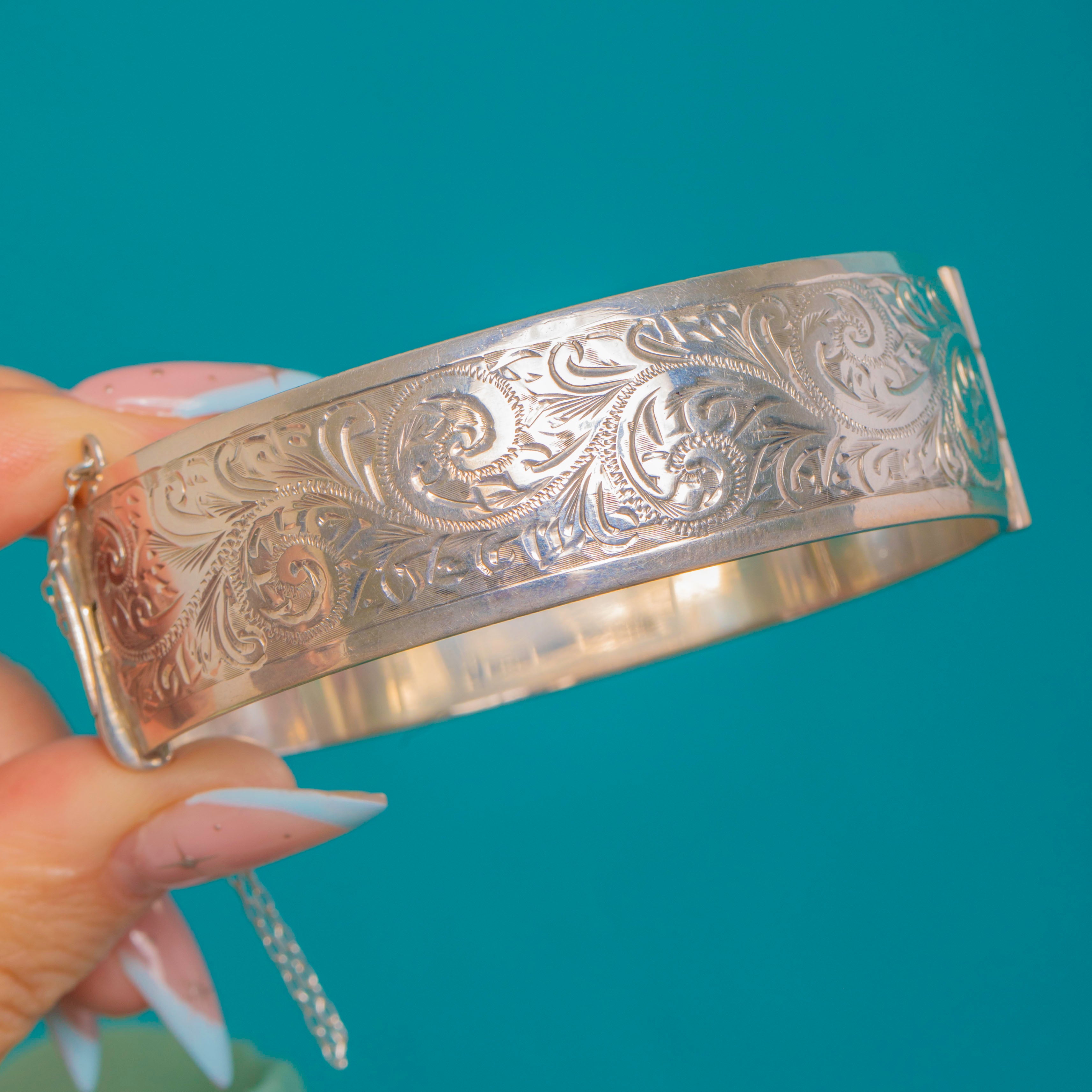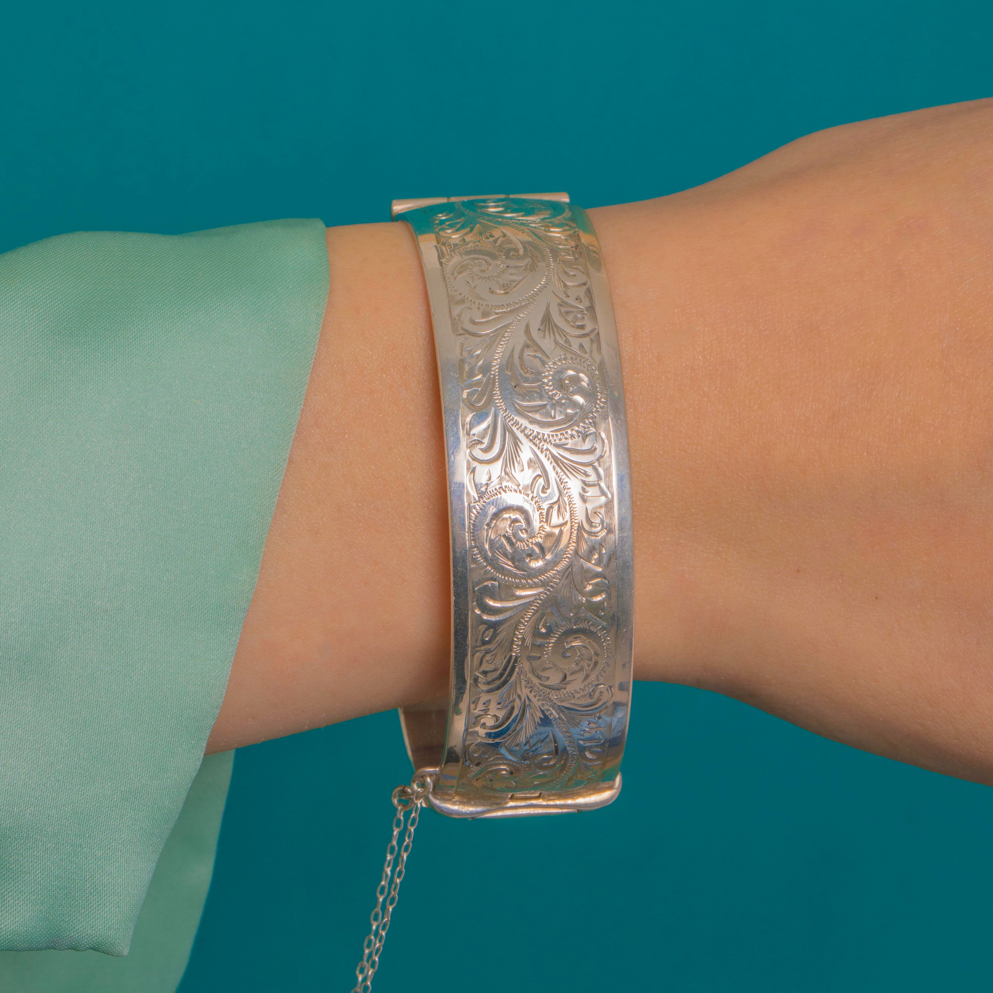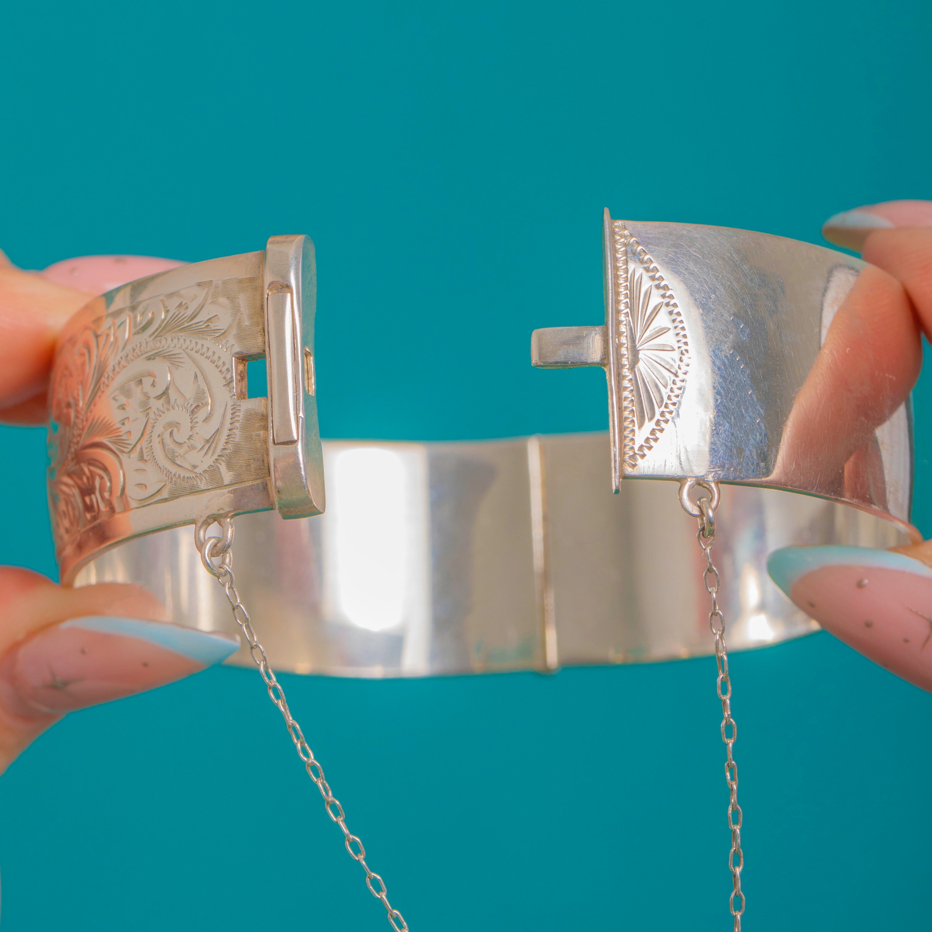 Das sanft gewölbte Profil liegt edel und angenehm am Handgelenk. Ein sicherer Kastenschlossverschluss mit Druckriegel und originaler Sicherheitskette sorgt für zuverlässigen Halt. Hochglanzpoliert und mit präzisen Details vollendet, spiegelt er die Eleganz viktorianischer Gravurkunst in einer stilvollen Silhouette der Mitte des 20. Jahrhunderts wider.
