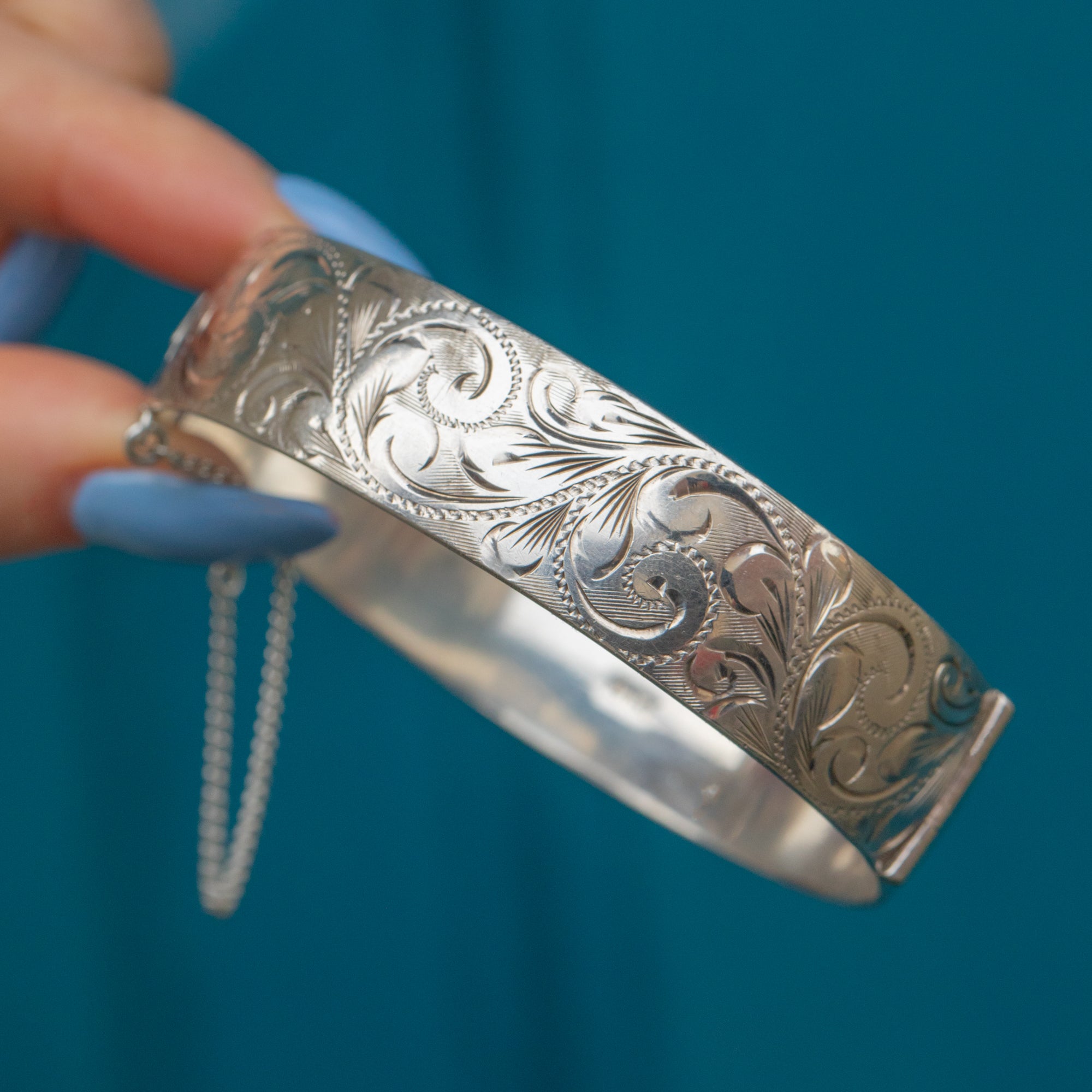 Its versatile design makes it perfect for wearing alone as a statement piece or stacked with other bracelets for a layered look. The perfect thoughtful gift or special treat for yourself, this engraved Silver bangle is a true treasure from the past.