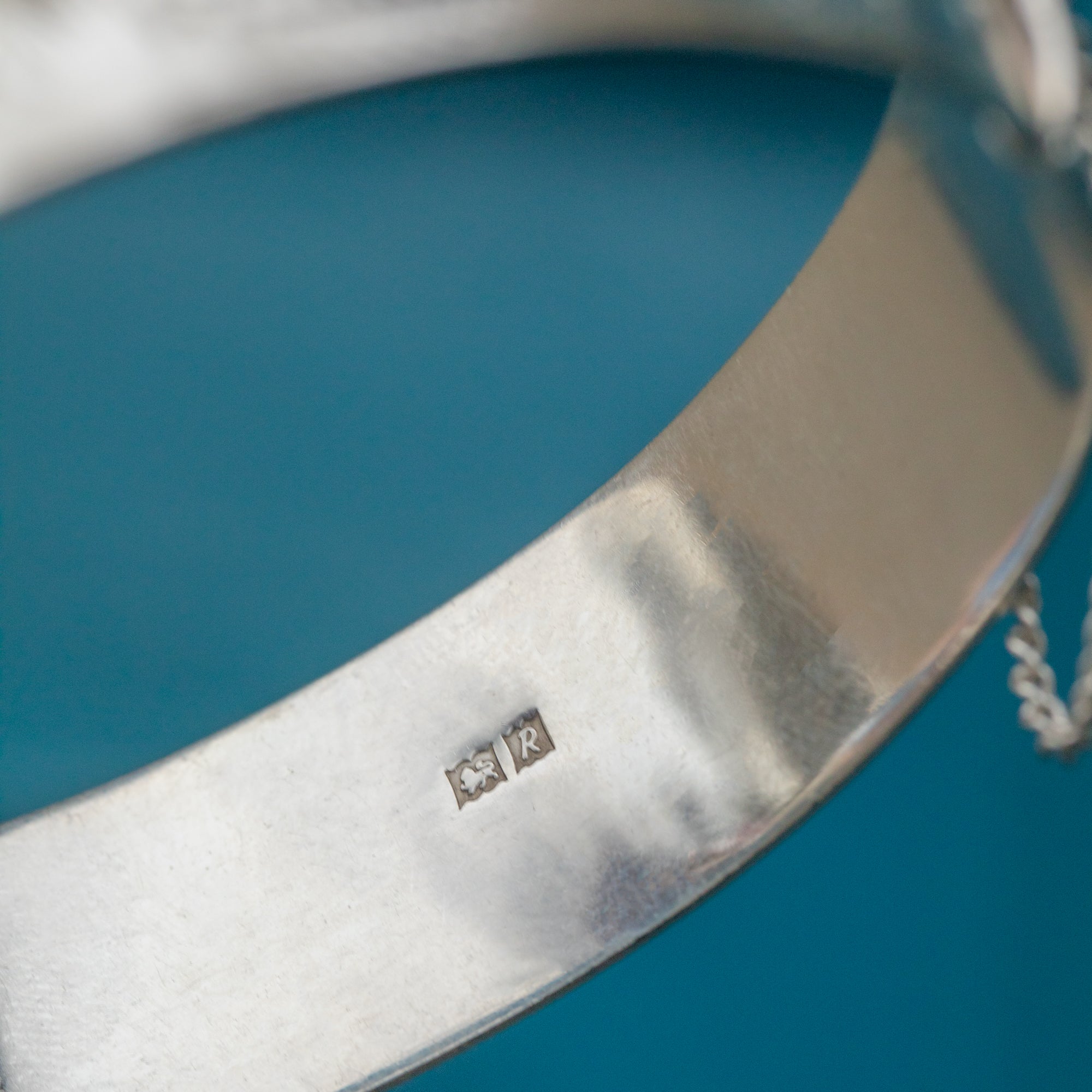 VERY GOOD. This Silver engraved cuff bangle is in very good condition. The Silver is bright and the engraved retails have remained crisp. There are some light scratches on the inside of the bangle and minor signs of wear on the back, consistent with its vintage nature. The safety chain is in perfect condition, and the clasp is secure, ensuring reliable wear. This piece retains its timeless charm and remains a beautiful example of Mid-Century craftsmanship.