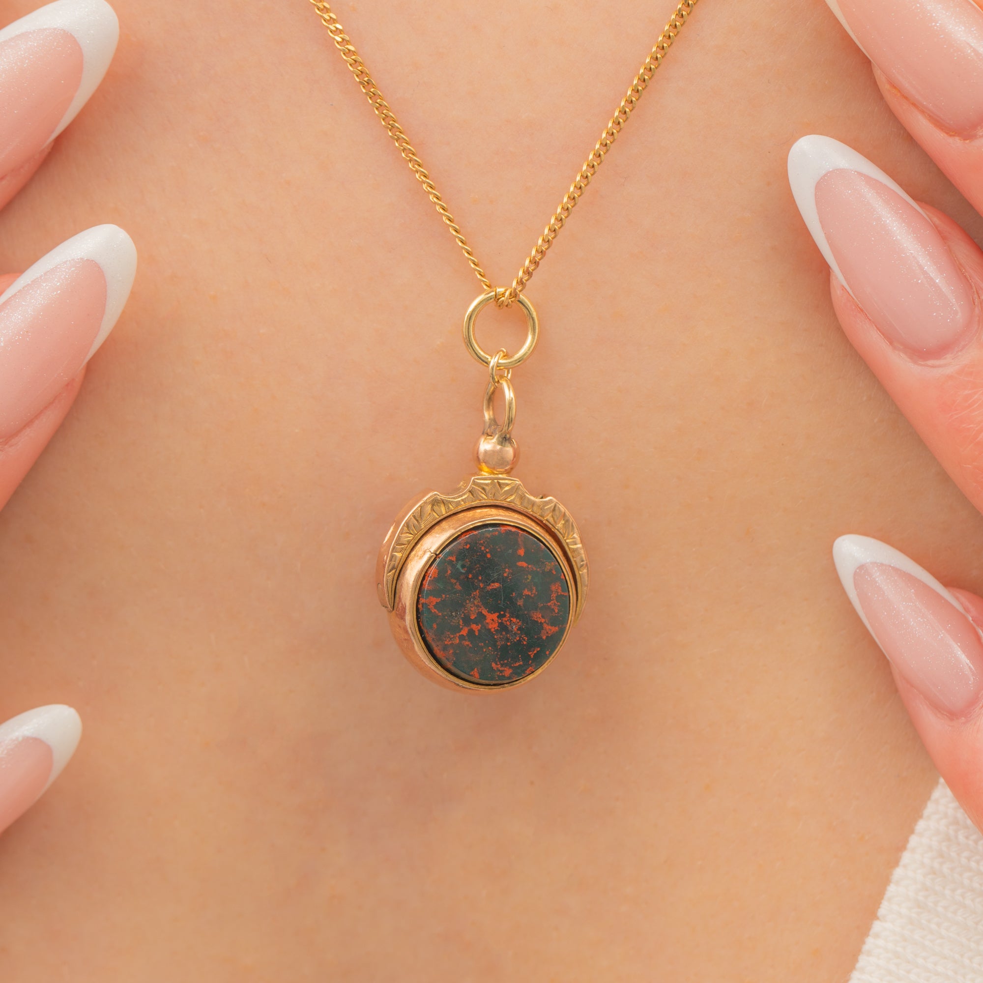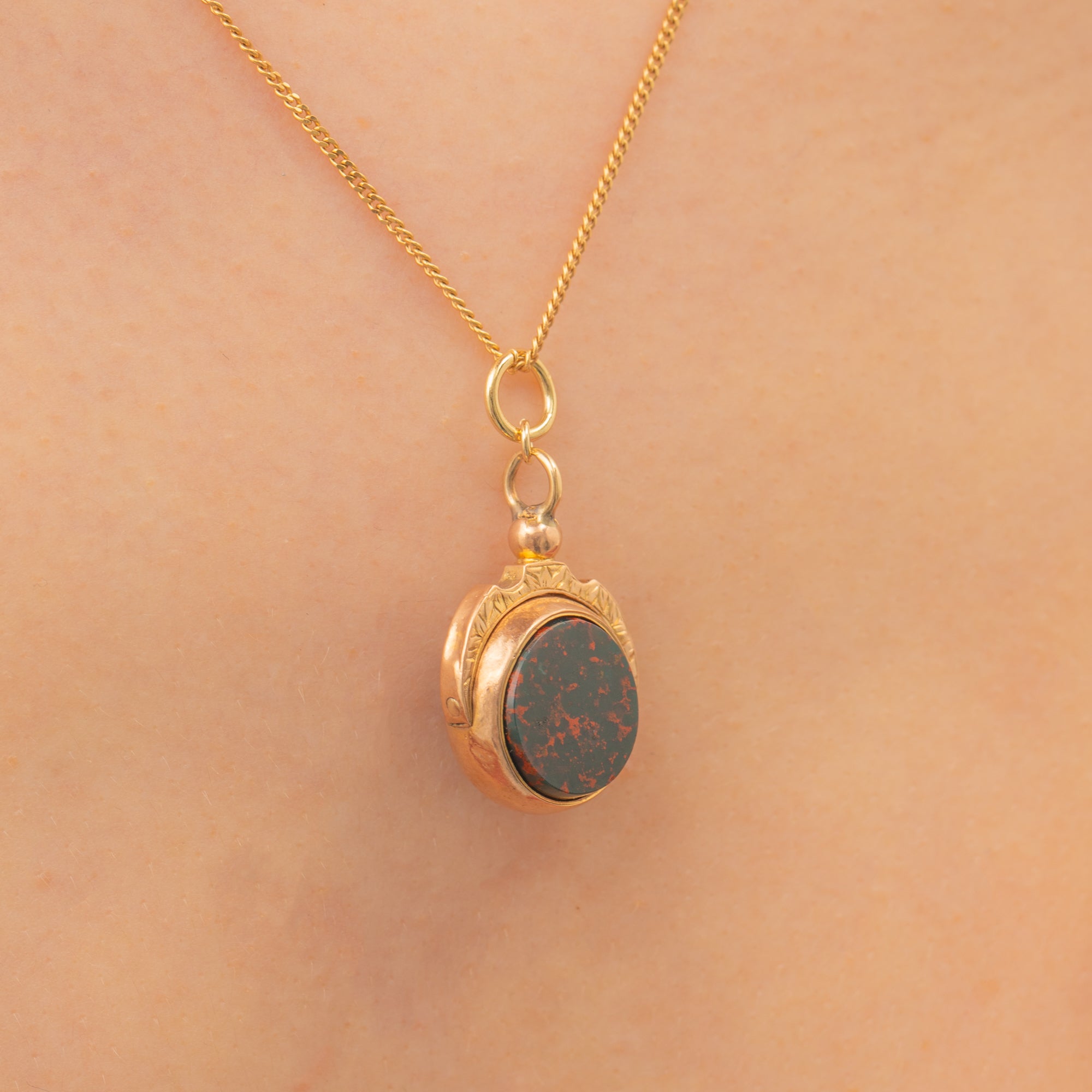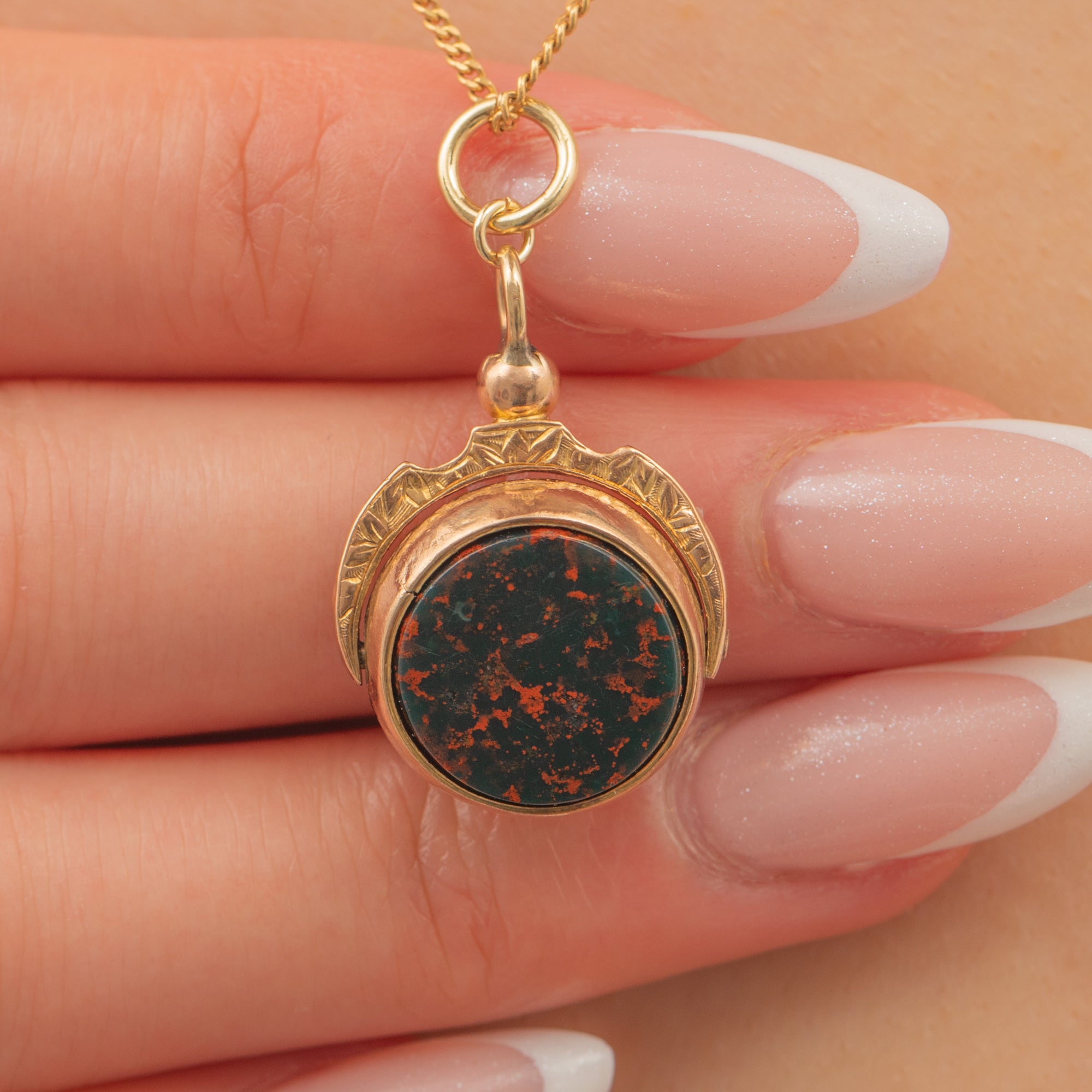 This fob pendant spins to reveal a Carnelian on one side and a Bloodstone on the other, each with a rich saturated hue. They are set within buttery 9ct Gold settings, complete with an ornately engraved bale in quintessential Victorian style.