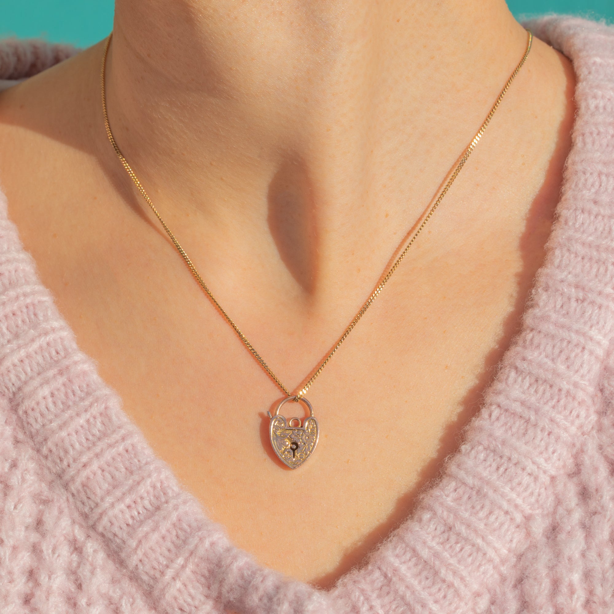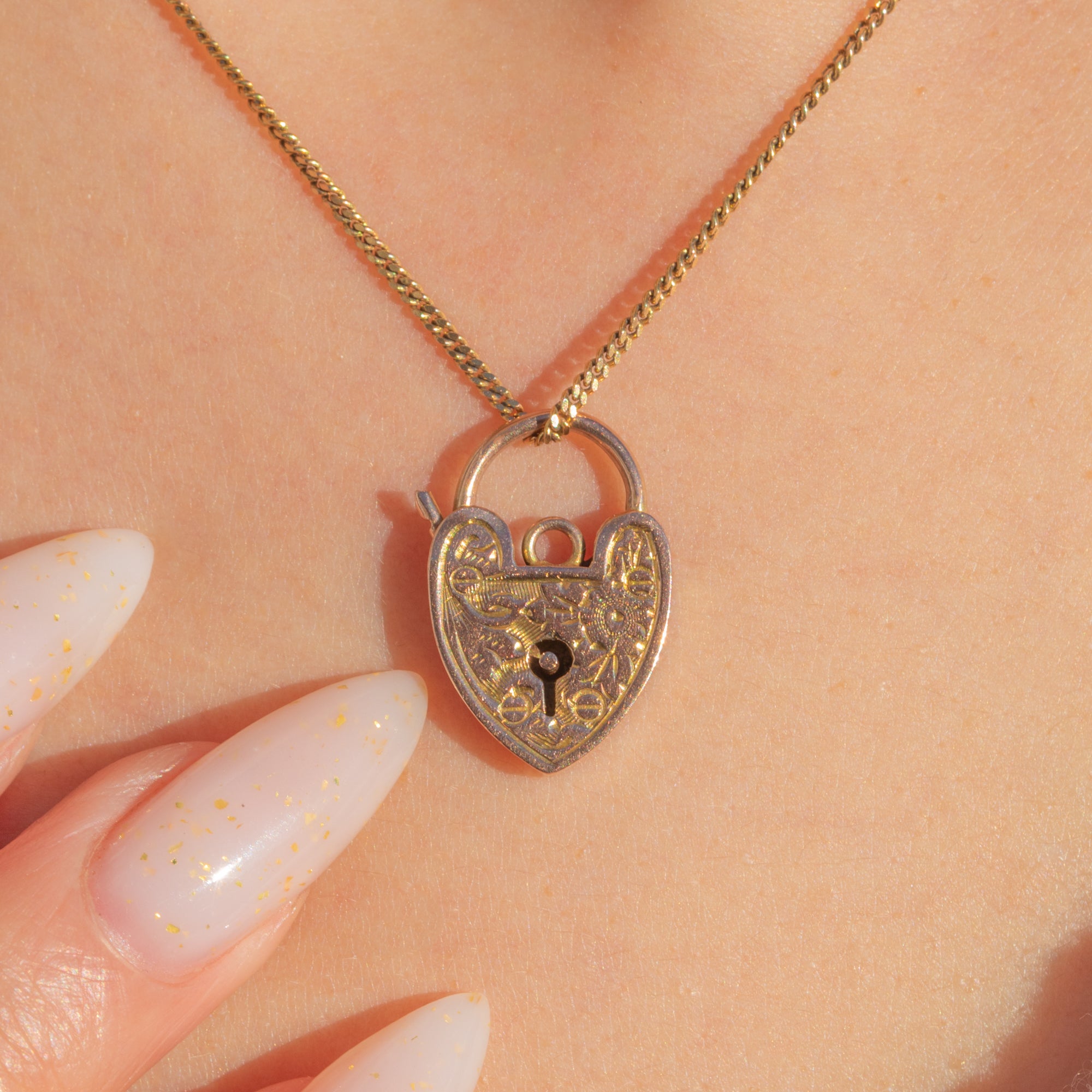 Petite, romantic and beautifully detailed, this Edwardian 9ct Gold heart padlock charm is richly hand-engraved with scrolling foliage around a central keyhole motif. Its warm rosy-yellow glow and crisp engraving bring a timeless elegance to this classic design.