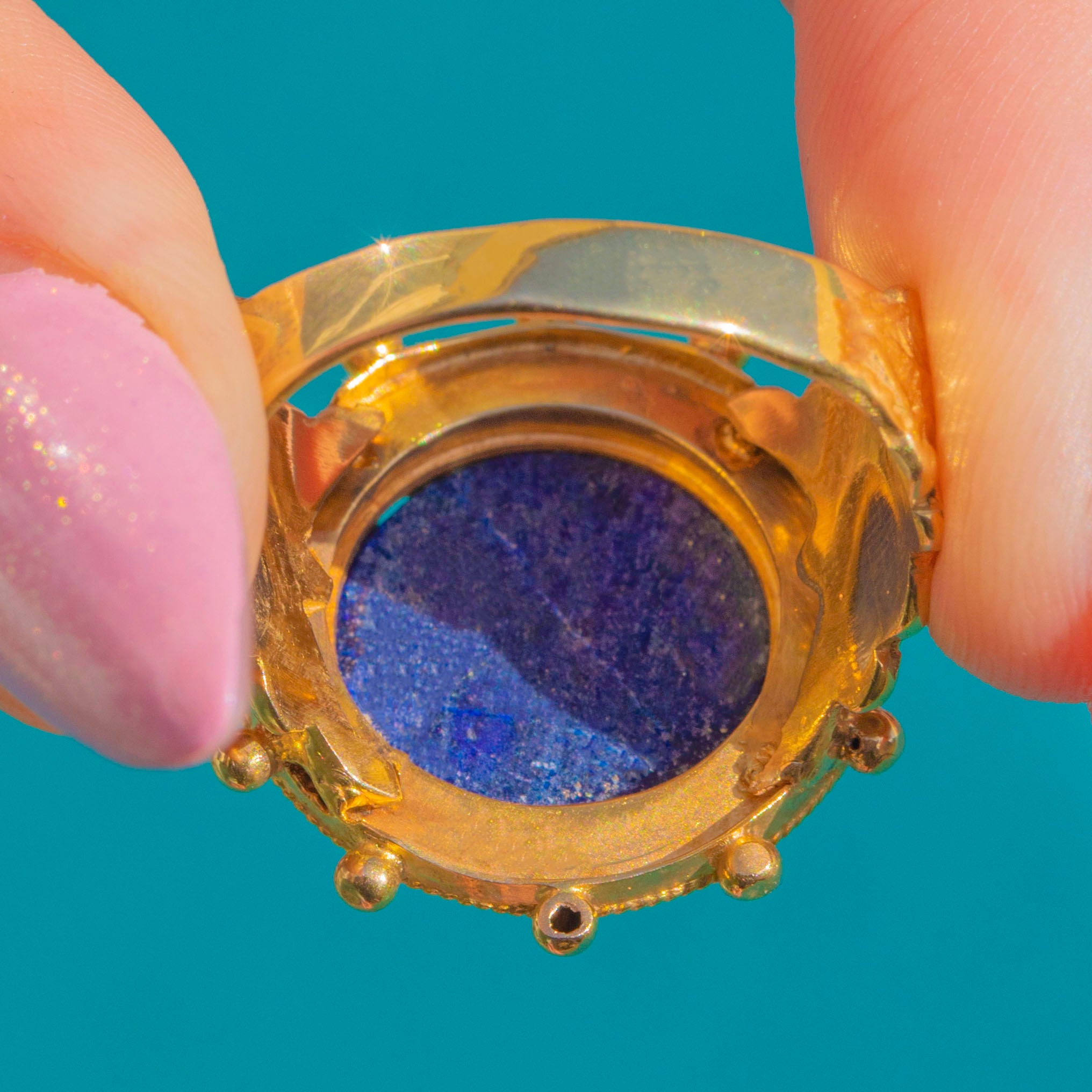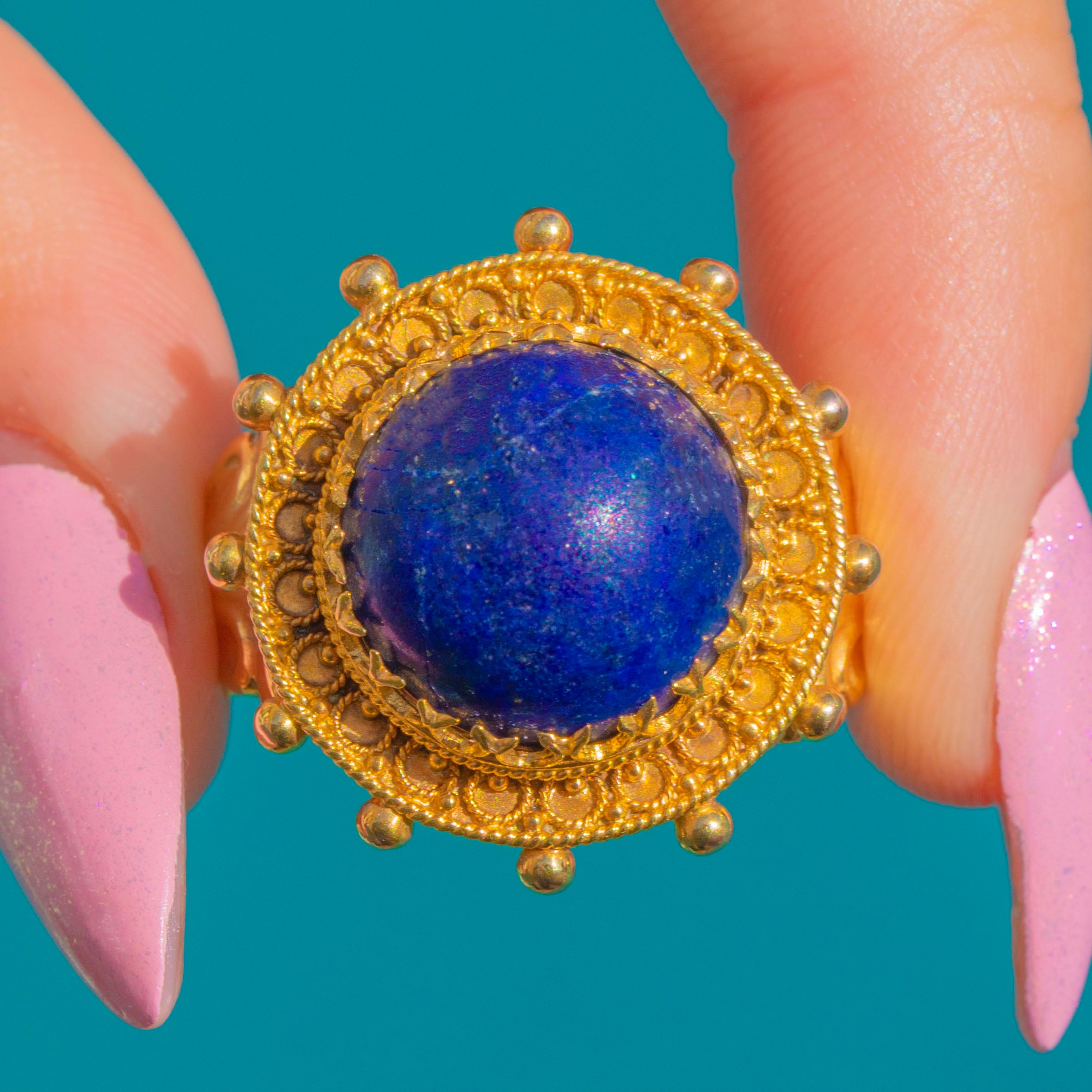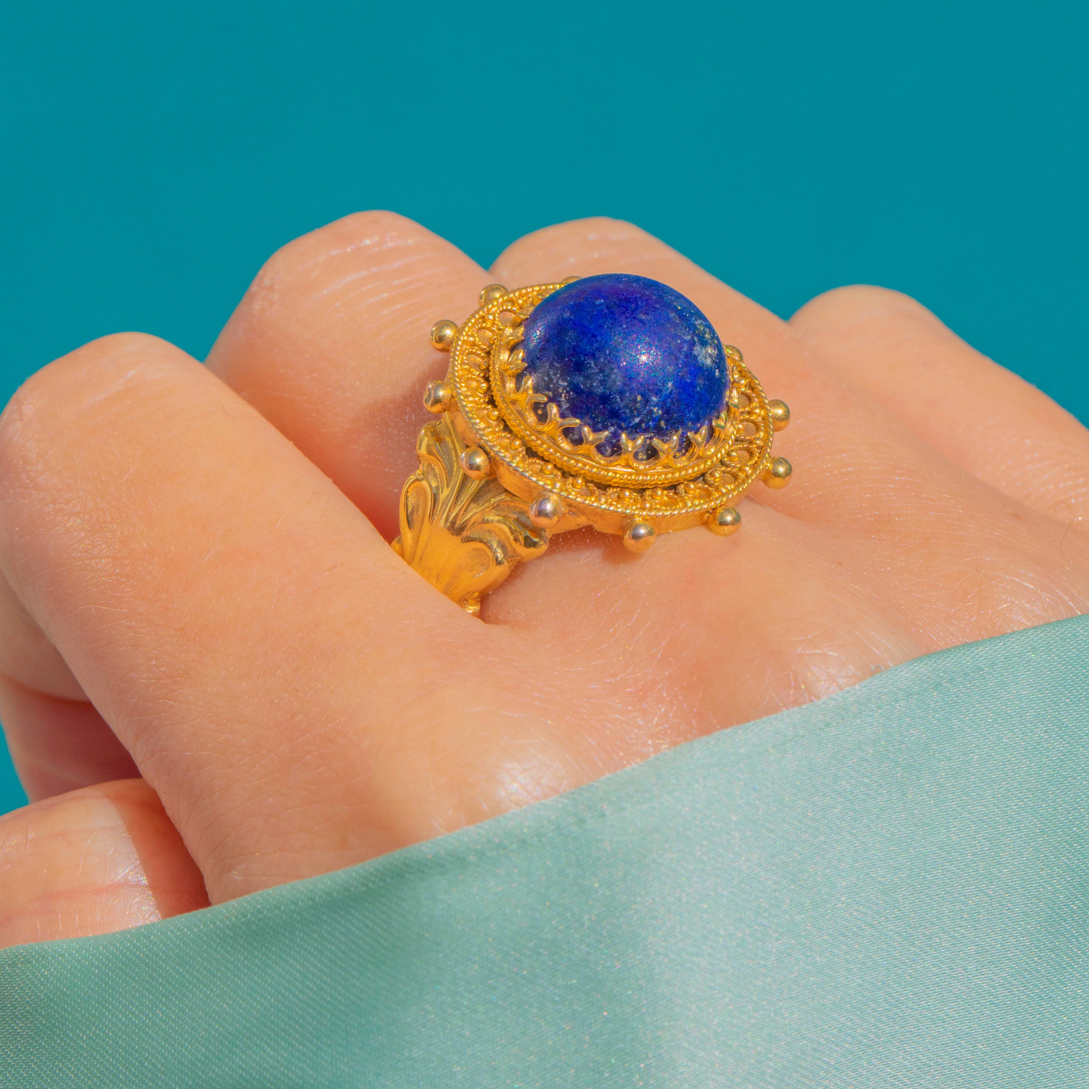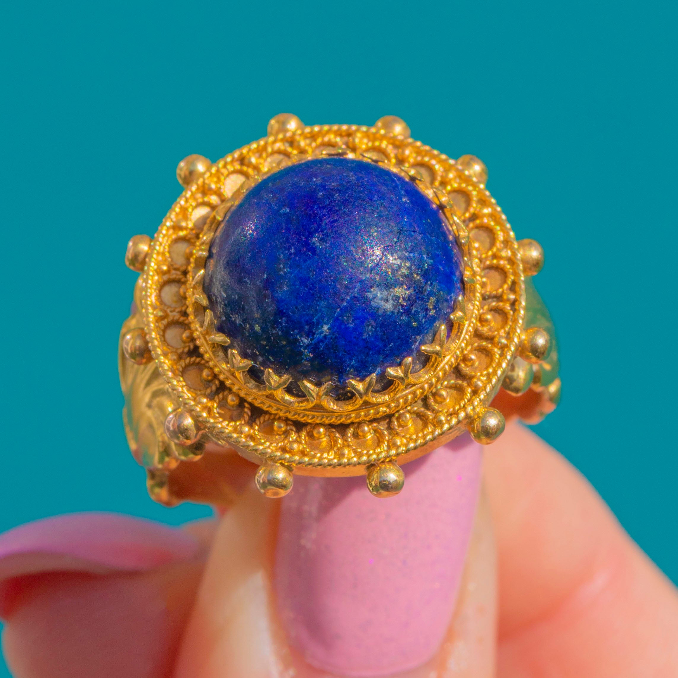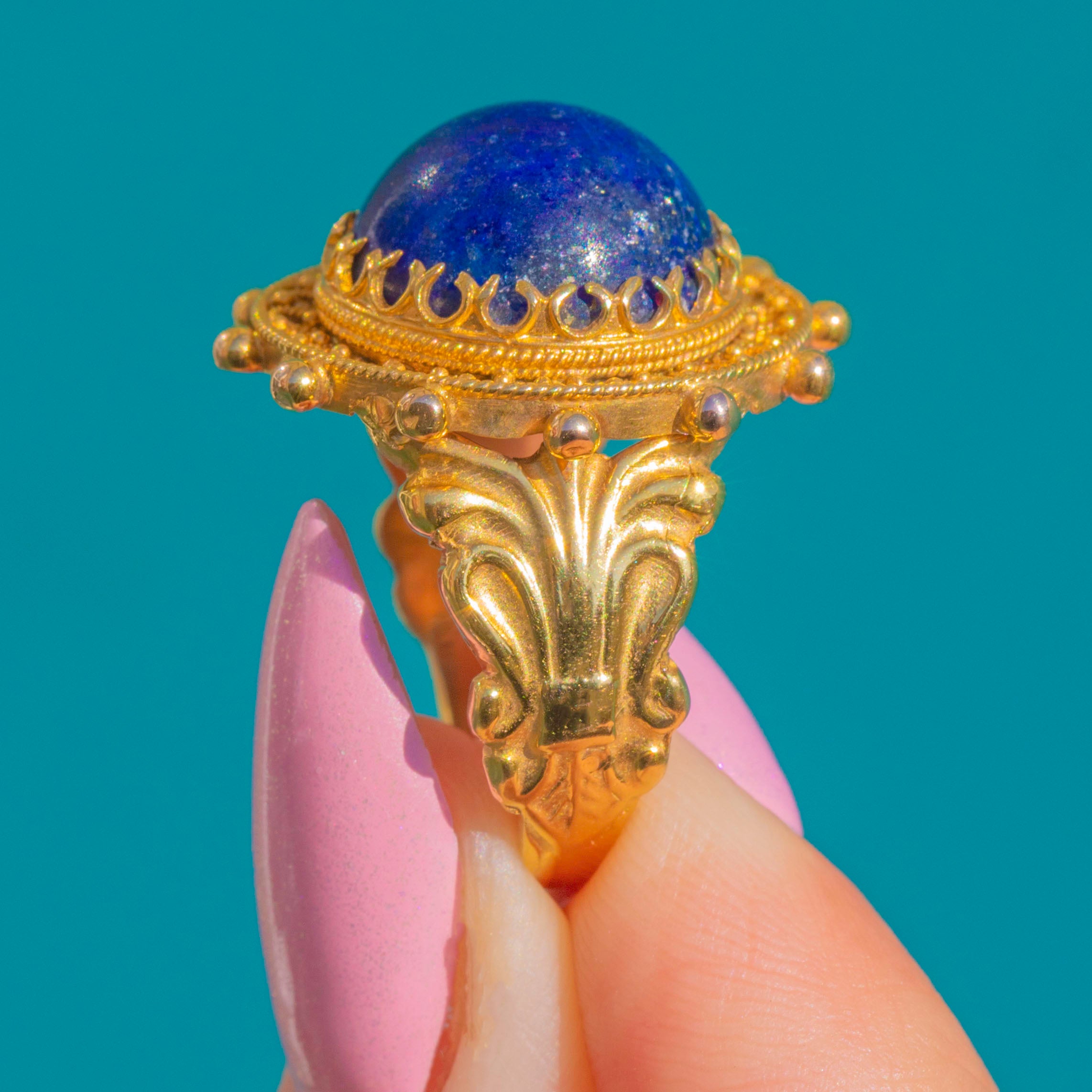 Ein reich verzierter Victorian Etruscan Revival-Ring, gefertigt aus leuchtendem 15ct Gold und gekrönt von einem intensiven Lapis-Lazuli-Cabochon. Der gewölbte blaue Edelstein verleiht dem Design eine himmlische Tiefe, während natürliche goldene Einschlüsse die Wärme der umliegenden Goldarbeit widerspiegeln.