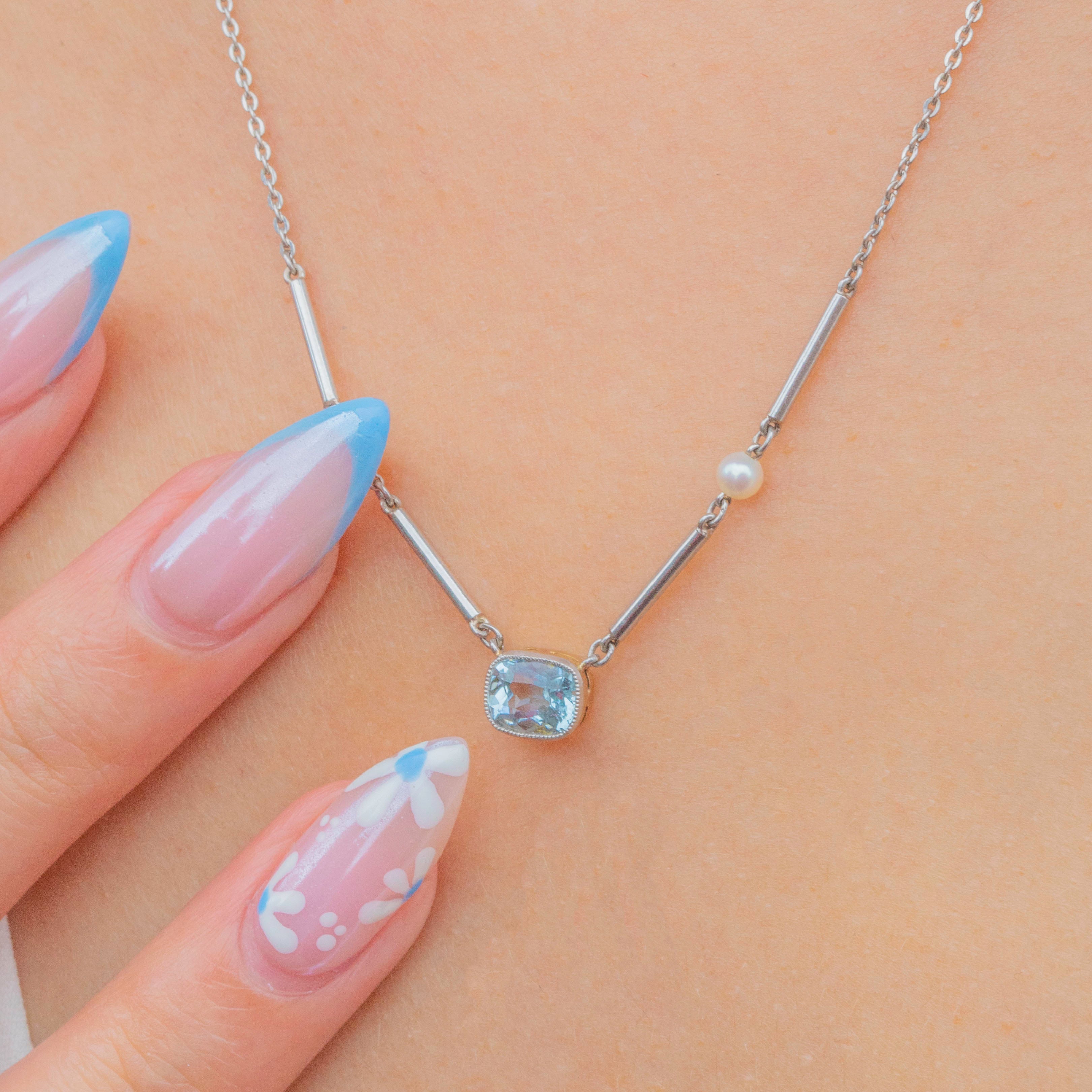Edwardian Platinum Aquamarine & Natural Pearl Necklace