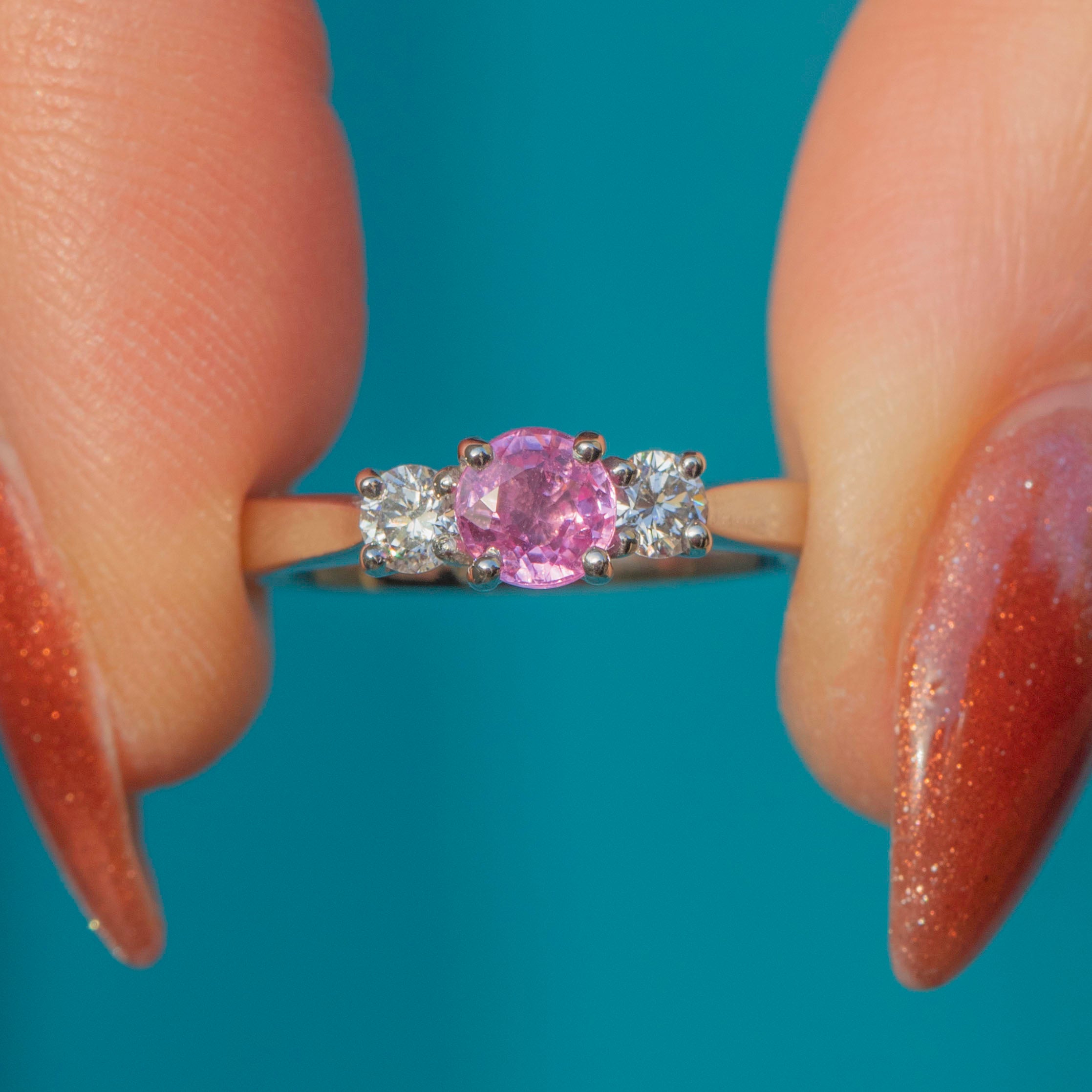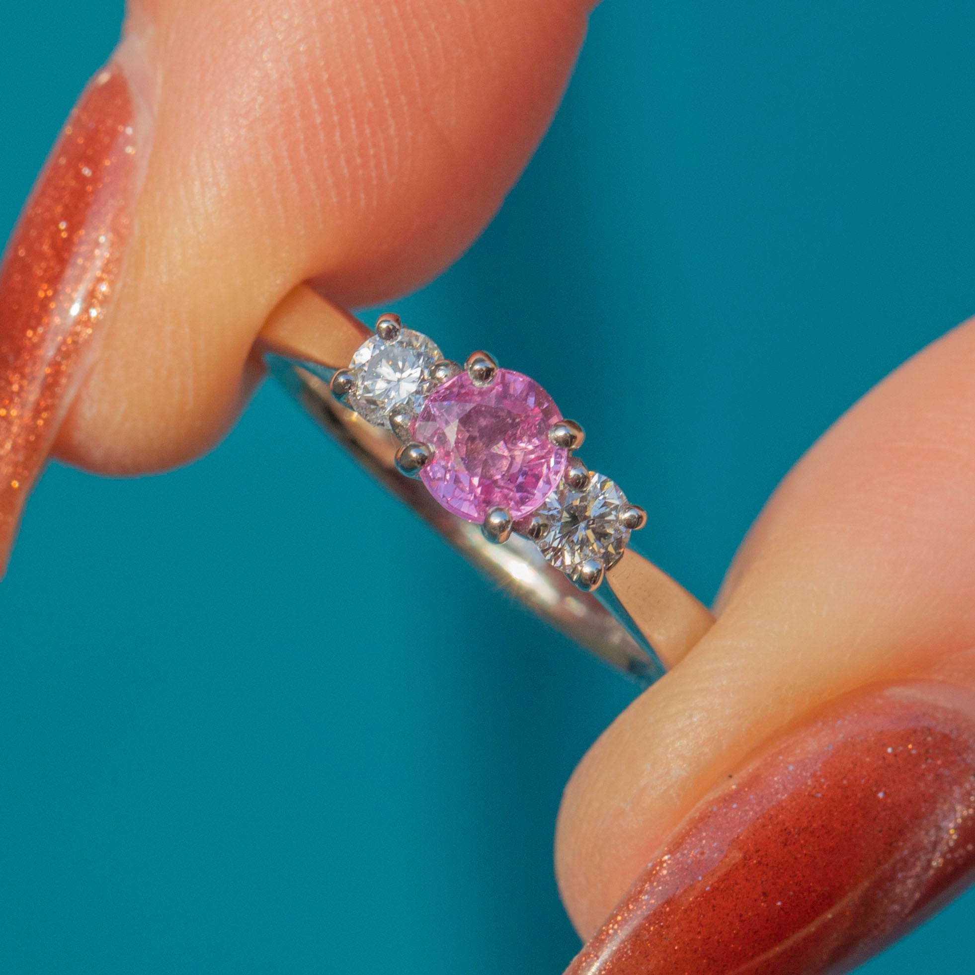 This Platinum Pink Sapphire Diamond trilogy ring is a stunning piece! As if plucked from a blossoming springtime field, this ring boasts a mesmerising 0.35ct pink Sapphire with a baby pink hue flanked by scintillating 0.10ct Diamonds.