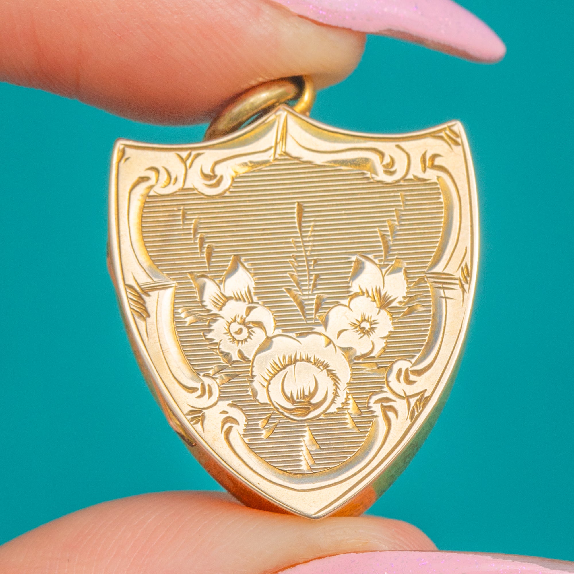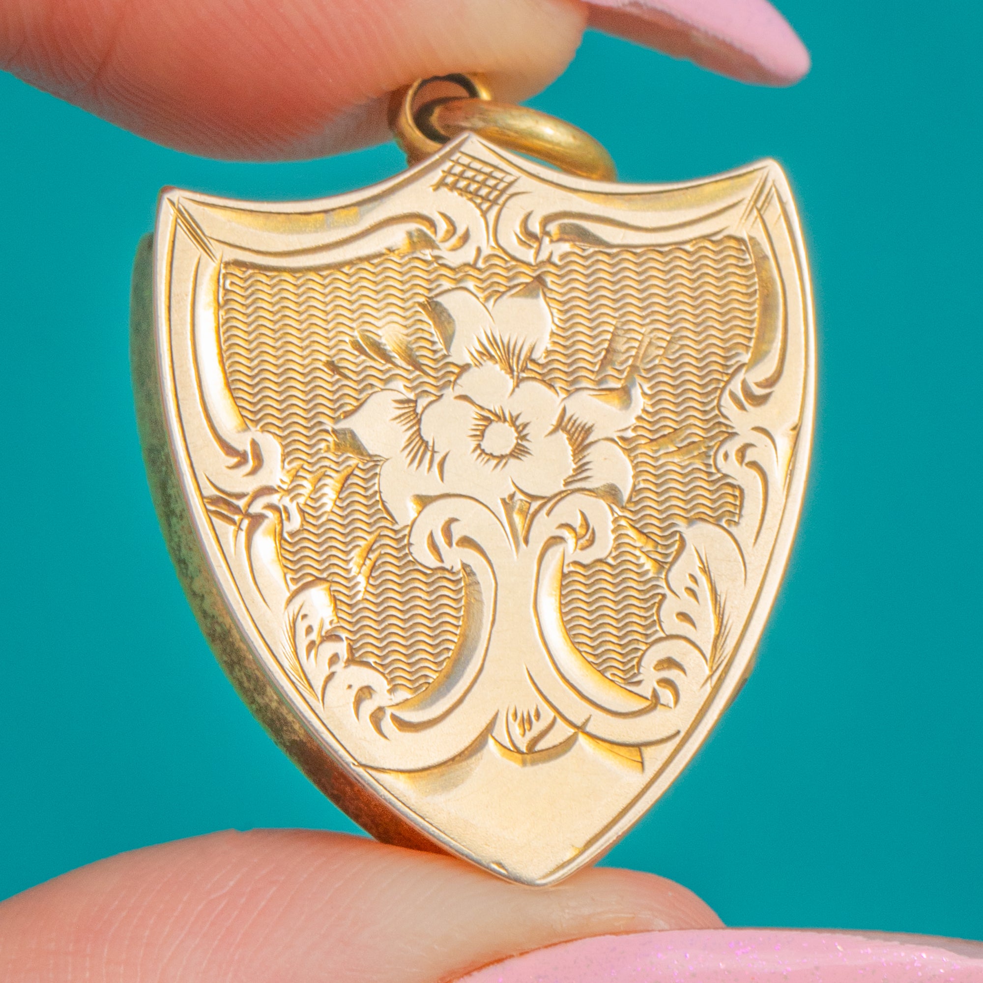 Ein bezauberndes Victorian Medaillon aus 9ct Gold in Schildform, reich verziert mit feinem Guilloche-Grund und einer eleganten, erhabenen floralen Kartusche. Das warme Gelbgold glänzt, während die präzisen Gravuren und strahlenförmigen Linien dem Stück eine raffinierte, romantische Ausstrahlung verleihen.