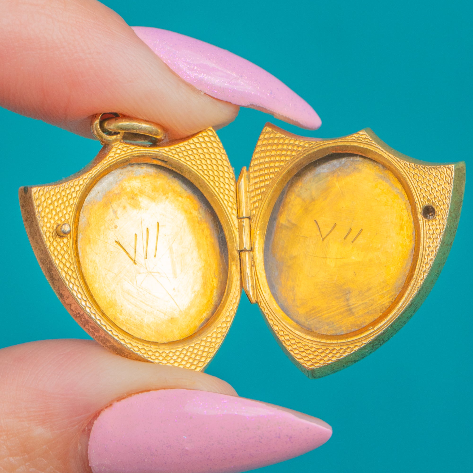 Prunkvoll und doch wunderbar zurückhaltend öffnet sich dieses zierliche Escutcheon, um zwei vertiefte Fächer für kostbare Erinnerungsstücke zu offenbaren. Ein zeitloses Erinnerungsstück, das all die feine Sentimentalität und Handwerkskunst verkörpert, die wir an dieser Epoche so schätzen.