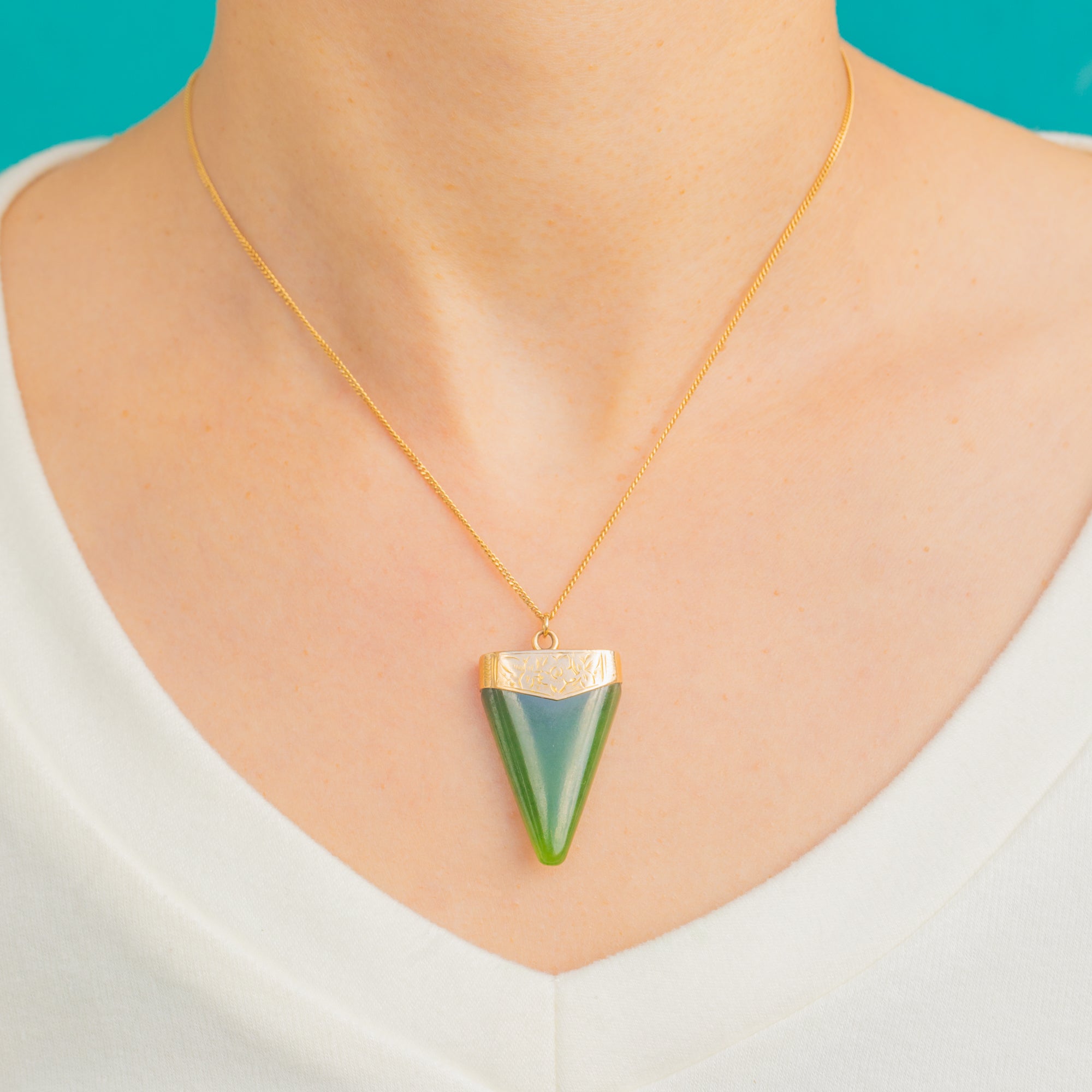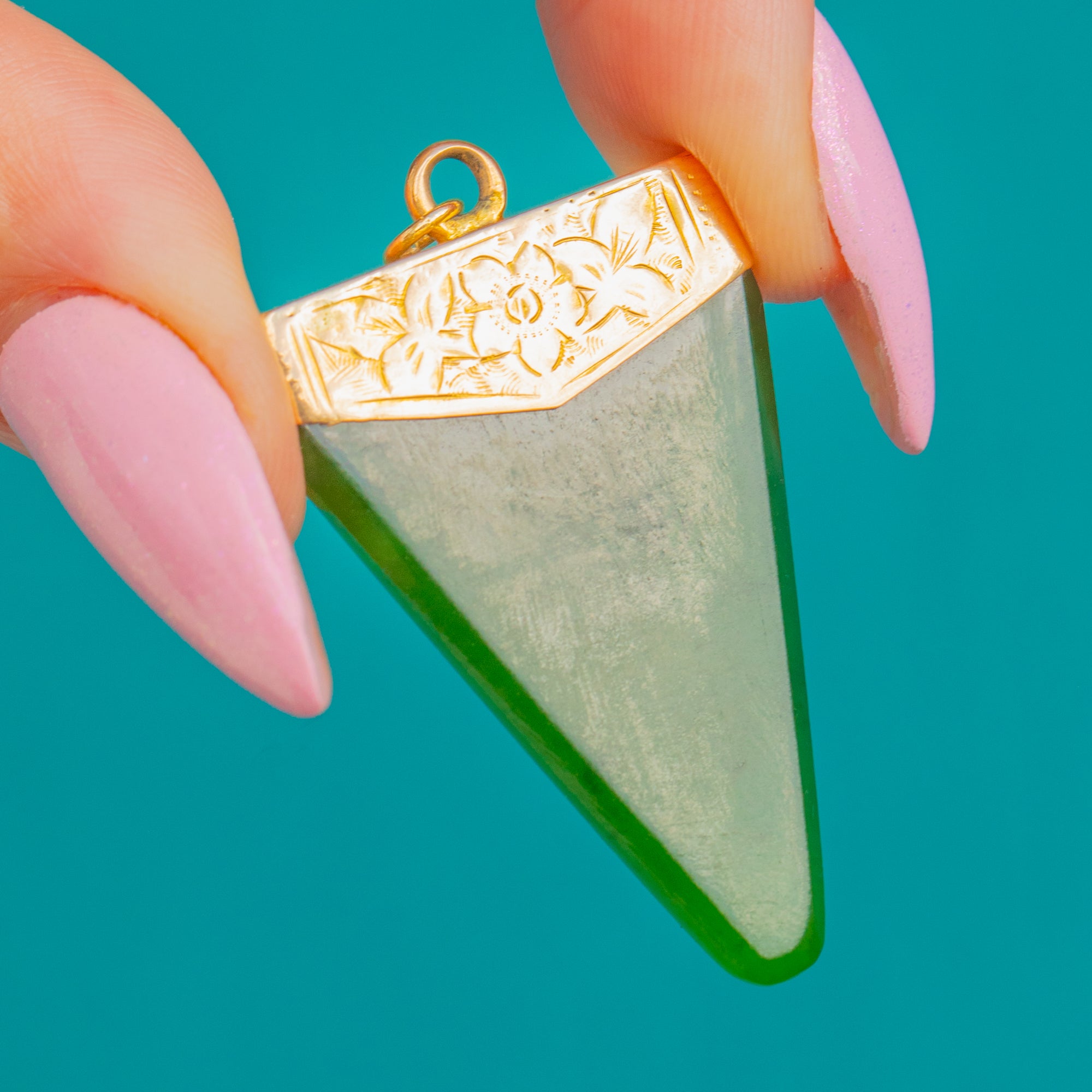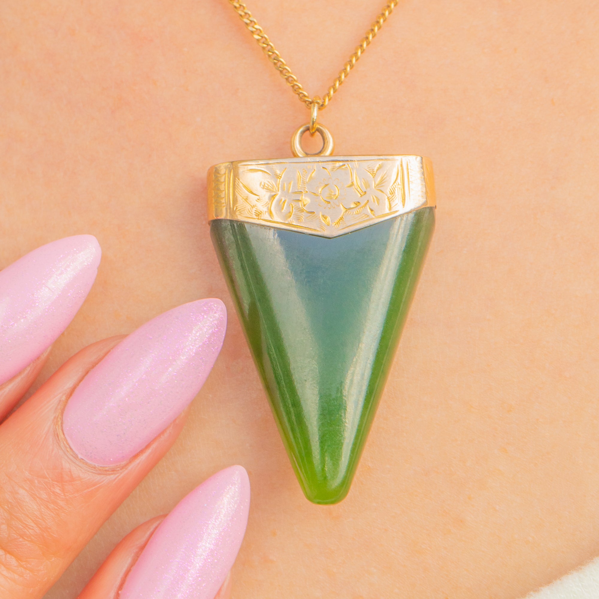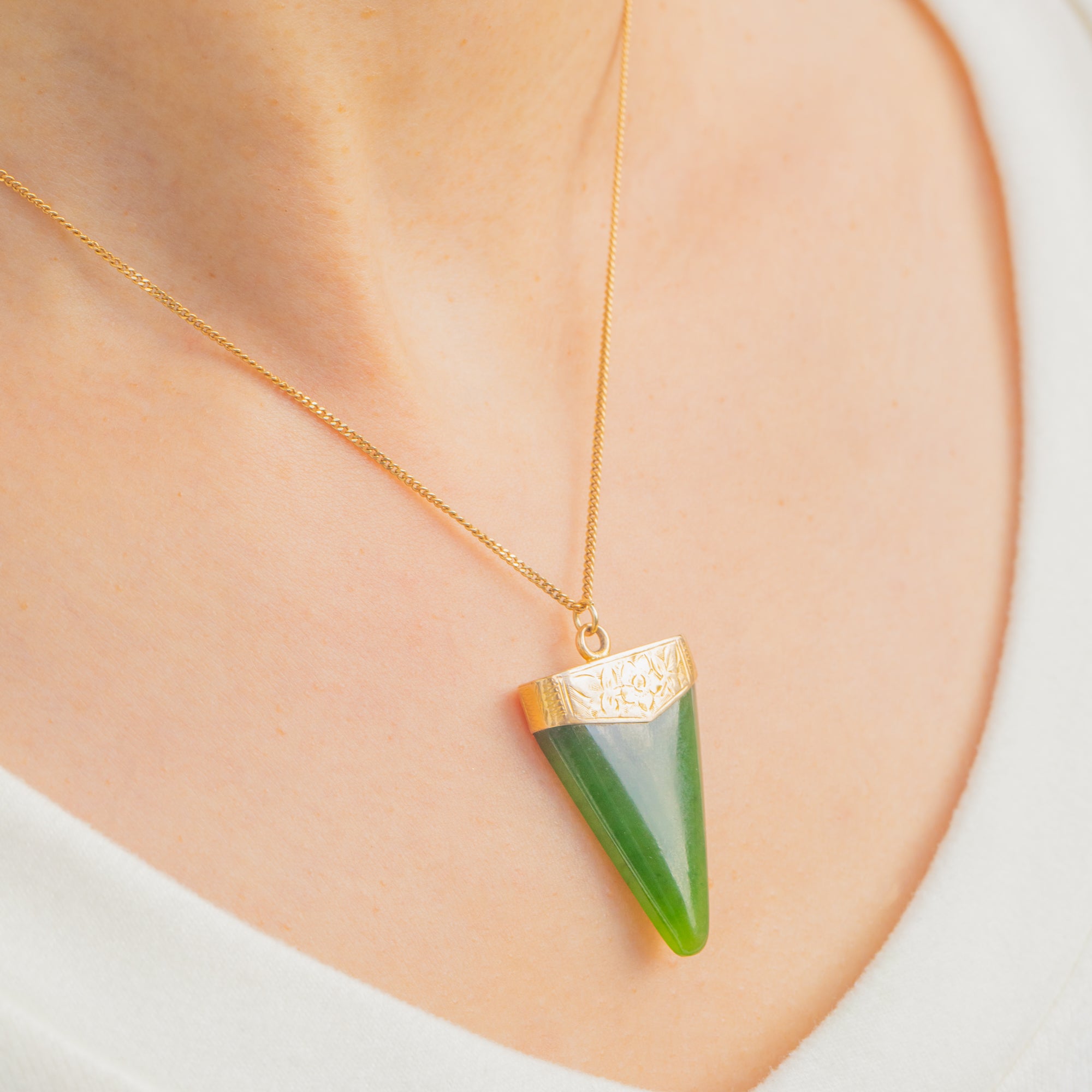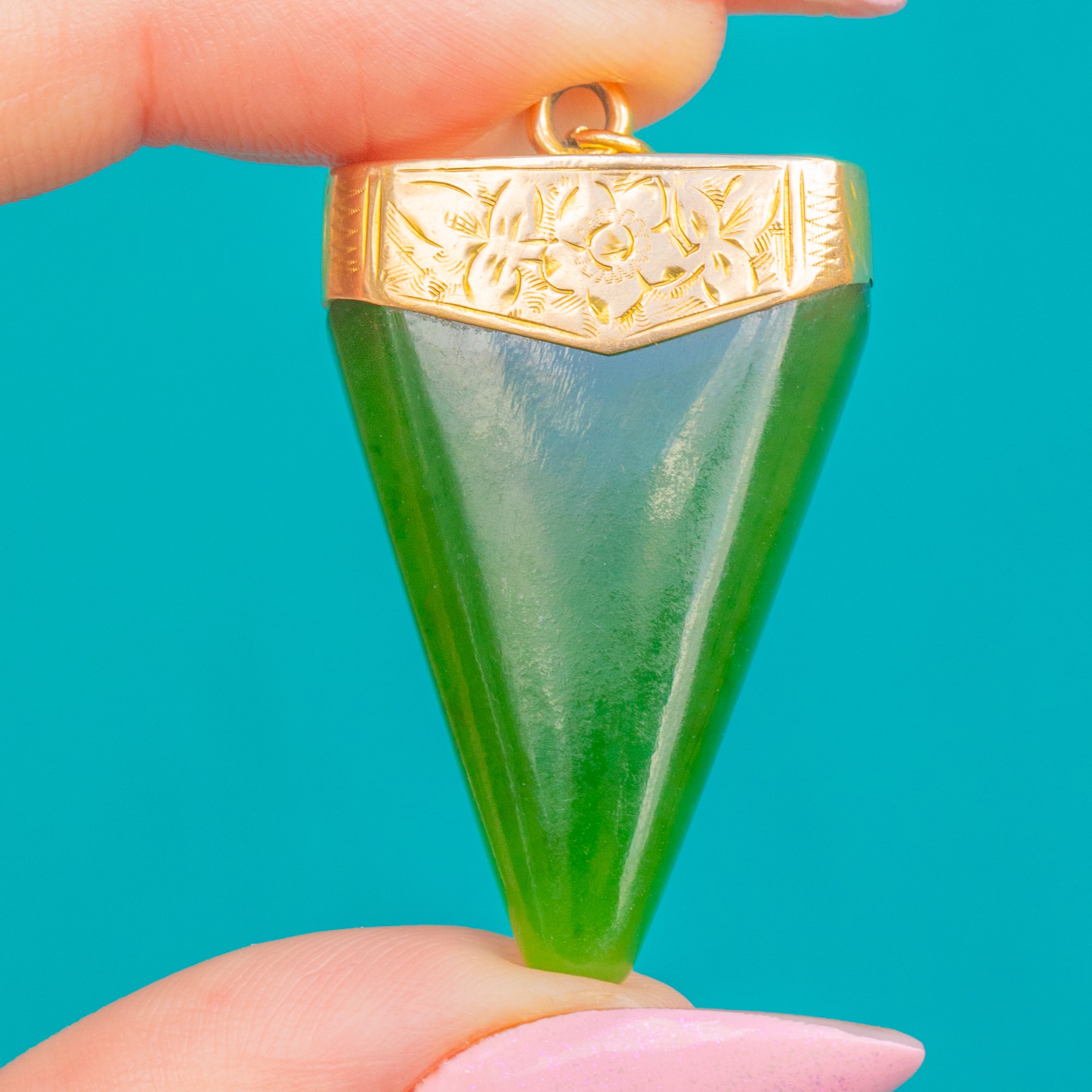 Ein eindrucksvoller Victorian Jade-Anhänger, gekrönt von einer fein gravierten Kappe aus 18ct Gold. Der langgezogene, sich verjüngende Tropfen aus sattgrünem Jade (Nephrit) wirkt skulptural und elegant; seine klare Geometrie wird durch die zarte florale und blattförmige Gravur der Kappe kunstvoll akzentuiert.