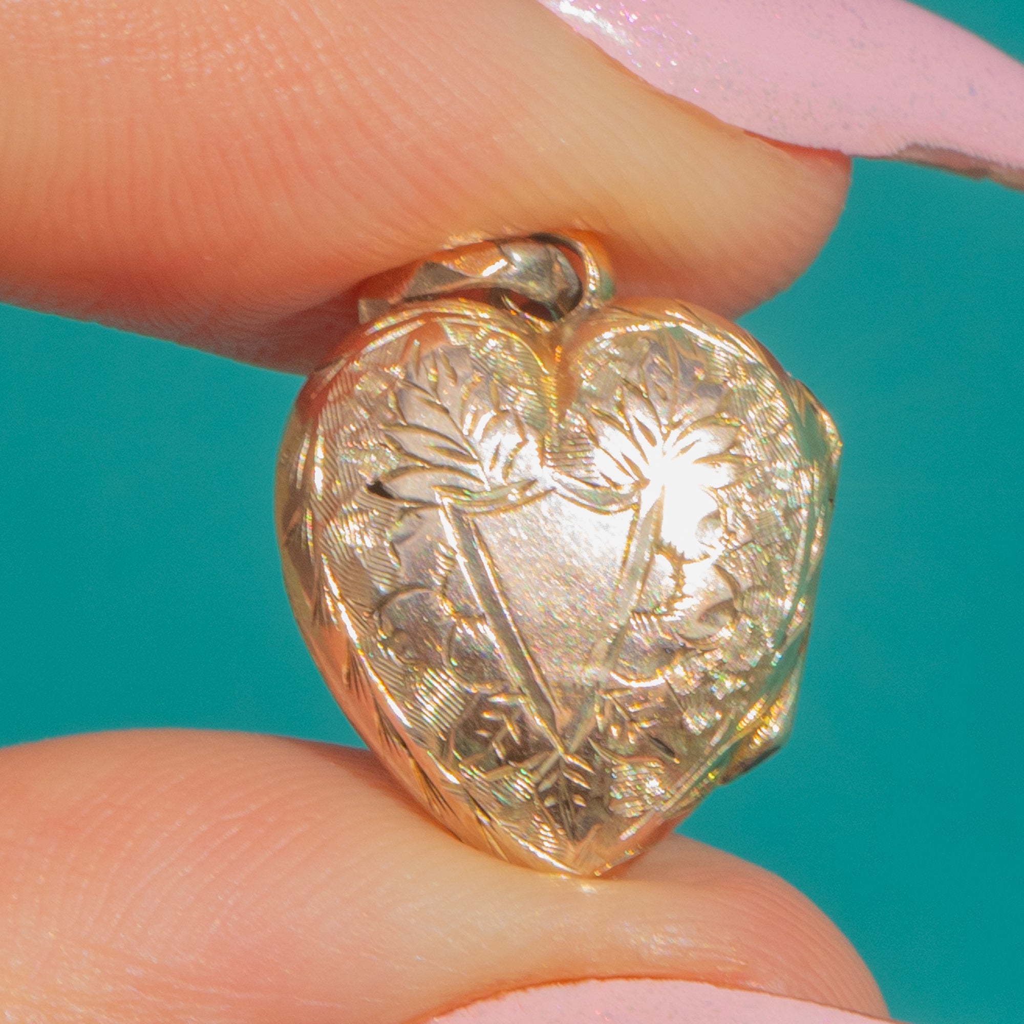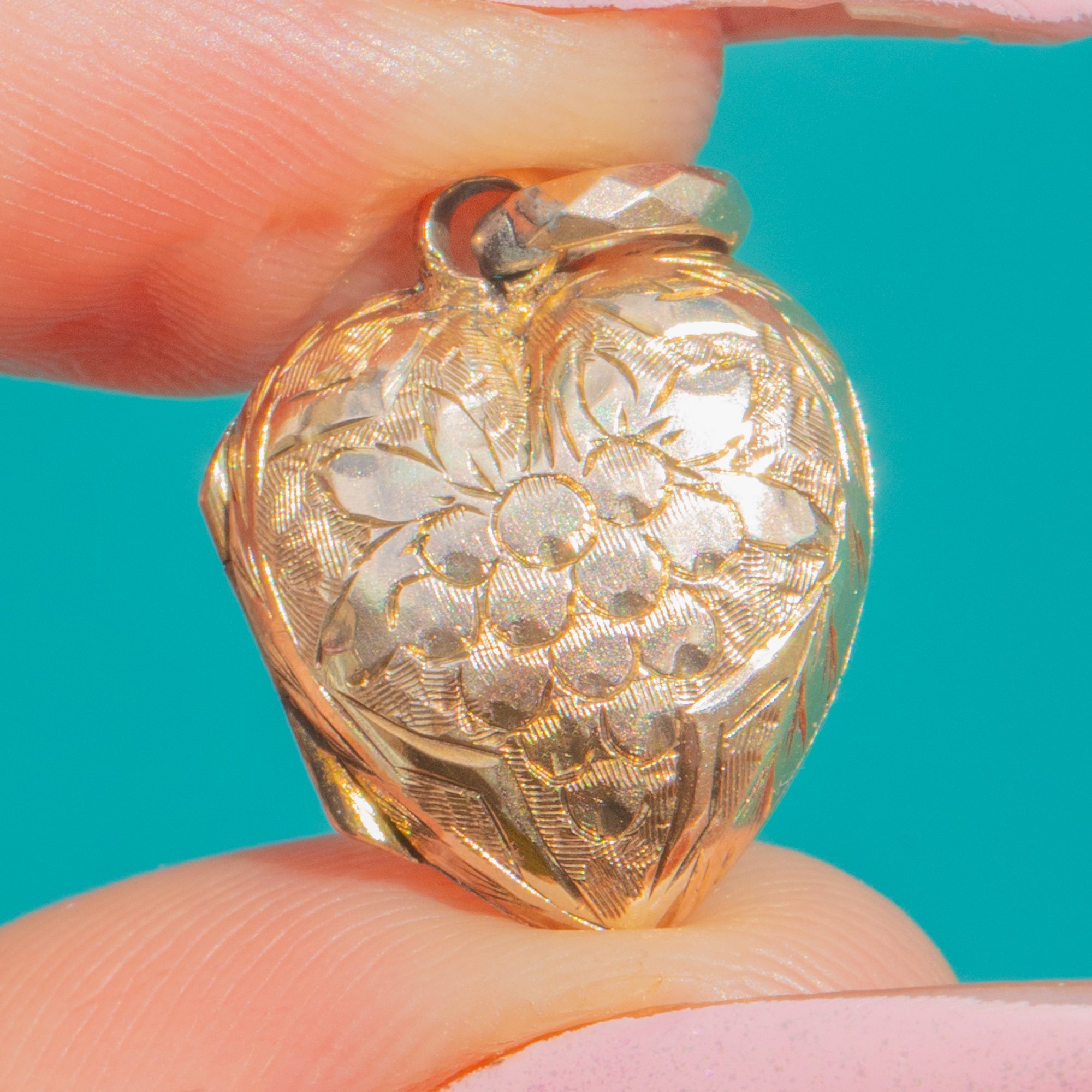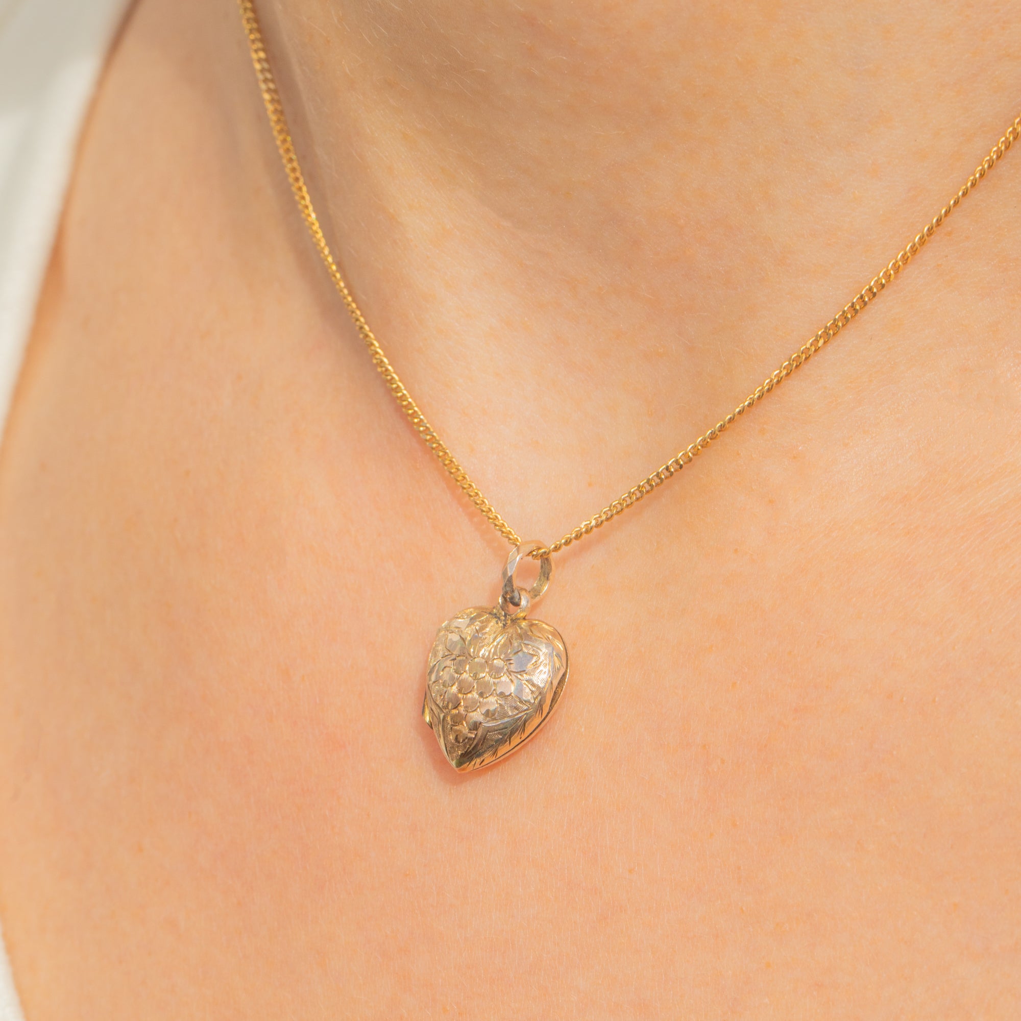Zart und romantisch bezaubert dieses Victorian 9ct Gold Herz-Medaillon mit kunstvoll gravierten Trauben und Vergissmeinnicht-Blüten, eingefasst von einem schmalen, polierten Rand. Ein facettierter Ösenring verleiht dem oberen Abschluss einen dezenten Hauch von Glanz und unterstreicht das kunstvolle Miniatur-Design.